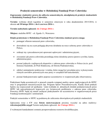Praktyki semestralne w Helsińskiej Fundacji Praw Człowieka Zapraszamy studentów prawa do odbycia semestralnych, nieodpłatnych praktyk studenckich w Helsińskiej Fundacji Praw Człowieka. Termin: wybrany dzień tygodnia w semestrze zimowym w roku akademickim 2015/2016, w okresie od 18 lutego 2016 r. do 6 czerwca 2016 r. Termin nadsyłania zgłoszeń: do 2 lutego 2016 r. Miejsce: siedziba HFPC - ul. Zgoda 11, Warszawa Dzięki praktykom w Helsińskiej Fundacji Praw Człowieka studenci prawa mogą: pomagać ofiarom naruszeń praw człowieka, dowiedzieć się na czym polegają aktywne działania na rzecz ochrony praw człowieka w Polsce, zetknąć się z precedensowymi sprawami sądowymi i administracyjnymi, zrozumieć jak prawa człowieka przenikają różne dziedziny prawa (prawo cywilne, karne, administracyjne), poznać jednych z najlepszych ekspertów z zakresu praw człowieka w Polsce (m.in. prof. Ireneusz Kamiński, dr Piotr Kładoczny, dr Dorota Pudzianowska), zdobyć umiejętności praktyczne i wiedzę, które mogą być przydatne przy wykonywaniu różnych zawodów prawniczych oraz pracy w urzędach lub kancelariach, poznać funkcjonowanie sądów poprzez uczestnictwo w rozprawach jako obserwatorzy. Praktykanci będą uczestniczyli w pracach zespołu wstępnej analizy spraw napływających do HFPC oraz w programach merytorycznych (np. Program Spraw Precedensowych). Każdy dzień praktyk będzie się rozpoczynał od spotkania / mini-wykładu nt. aktualnych działań podejmowanych przez HFPC lub najważniejszych krajowych czy światowych problemów z zakresu praw człowieka. Prawnicy HFPC będą się starali zachęcać praktykantów do uczestnictwa w organizowanych przez Fundację konferencjach i seminariach. Praktyki semestralne w HFPC są podstawą do zaliczenia obowiązkowych praktyk studenckich. Zgłoszenia wraz z CV oraz listem motywacyjnym prosimy wysyłać na adres mailowy: [email protected] Termin nadsyłania zgłoszeń: do 2 lutego 2016 r. Z wybranymi kandydatami zostanie przeprowadzona rozmowa kwalifikacyjna.