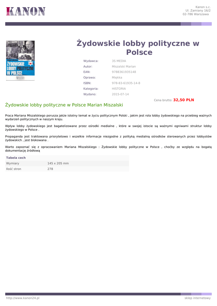 Kanon s.c. Ul. Zamiany 16/2 02-786 Warszawa Żydowskie lobby polityczne w Polsce Wydawca: 3S MEDIA Autor: Miszalski Marian EAN: 9788361935148 Oprawa: Miękka ISBN: 978-83-61935-14-8 Kategoria: HISTORIA Wydano: 2015-07-14 Cena brutto: 32,50 PLN Żydowskie lobby polityczne w Polsce Marian Miszalski Praca Mariana Miszalskiego porusza jakże istotny temat w życiu politycznym Polski , jakim jest rola lobby żydowskiego na przebieg ważnych wydarzeń politycznych w naszym kraju. Wpływ lobby żydowskiego jest bagatelizowane przez ośrodki medialne , które w swojej istocie są ważnymi ogniwami struktur lobby żydowskiego w Polsce . Propaganda jest traktowana priorytetowo i wszelkie informacje niezgodne z polityką medialną ośrodków sterowanych przez lobbystów żydowskich , jest blokowana . Warto zapoznać się z opracowaniem Mariana Miszalskiego : Żydowskie lobby polityczne w Polsce , choćby ze względu na bogatą dokumentację źródłową Tabela cech Wymiary 145 x 205 mm Ilość stron 278 http://www.kanon24.pl sklep internetowy