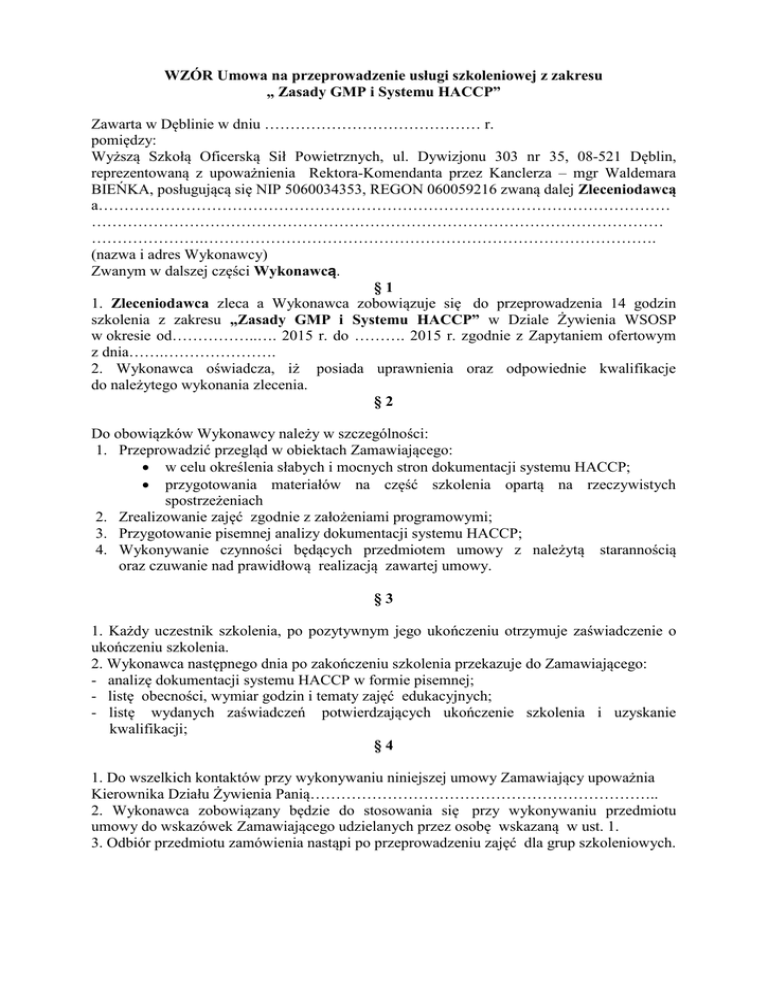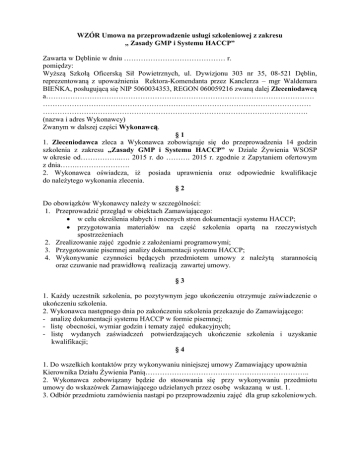 WZÓR Umowa na przeprowadzenie usługi szkoleniowej z zakresu „ Zasady GMP i Systemu HACCP” Zawarta w Dęblinie w dniu …………………………………… r. pomiędzy: Wyższą Szkołą Oficerską Sił Powietrznych, ul. Dywizjonu 303 nr 35, 08-521 Dęblin, reprezentowaną z upoważnienia Rektora-Komendanta przez Kanclerza – mgr Waldemara BIEŃKA, posługującą się NIP 5060034353, REGON 060059216 zwaną dalej Zleceniodawcą a………………………………………………………………………………………………… ………………………………………………………………………………………………… ………………….……………………………………………………………………………. (nazwa i adres Wykonawcy) Zwanym w dalszej części Wykonawcą. §1 1. Zleceniodawca zleca a Wykonawca zobowiązuje się do przeprowadzenia 14 godzin szkolenia z zakresu „Zasady GMP i Systemu HACCP” w Dziale Żywienia WSOSP w okresie od……………..…. 2015 r. do ………. 2015 r. zgodnie z Zapytaniem ofertowym z dnia…….…………………. 2. Wykonawca oświadcza, iż posiada uprawnienia oraz odpowiednie kwalifikacje do należytego wykonania zlecenia. §2 Do obowiązków Wykonawcy należy w szczególności: 1. Przeprowadzić przegląd w obiektach Zamawiającego: w celu określenia słabych i mocnych stron dokumentacji systemu HACCP; przygotowania materiałów na część szkolenia opartą na rzeczywistych spostrzeżeniach 2. Zrealizowanie zajęć zgodnie z założeniami programowymi; 3. Przygotowanie pisemnej analizy dokumentacji systemu HACCP; 4. Wykonywanie czynności będących przedmiotem umowy z należytą starannością oraz czuwanie nad prawidłową realizacją zawartej umowy. §3 1. Każdy uczestnik szkolenia, po pozytywnym jego ukończeniu otrzymuje zaświadczenie o ukończeniu szkolenia. 2. Wykonawca następnego dnia po zakończeniu szkolenia przekazuje do Zamawiającego: - analizę dokumentacji systemu HACCP w formie pisemnej; - listę obecności, wymiar godzin i tematy zajęć edukacyjnych; - listę wydanych zaświadczeń potwierdzających ukończenie szkolenia i uzyskanie kwalifikacji; §4 1. Do wszelkich kontaktów przy wykonywaniu niniejszej umowy Zamawiający upoważnia Kierownika Działu Żywienia Panią………………………………………………………….. 2. Wykonawca zobowiązany będzie do stosowania się przy wykonywaniu przedmiotu umowy do wskazówek Zamawiającego udzielanych przez osobę wskazaną w ust. 1. 3. Odbiór przedmiotu zamówienia nastąpi po przeprowadzeniu zajęć dla grup szkoleniowych. §5 1. Wynagrodzenie za wykonanie przedmiotu niniejszej umowy, określone w § 1 ust. 1, w wysokości …………………………. PLN brutto/brutto za panel szkoleniowy (dwa dni) „Zasady GMP i Systemu HACCP”, płatne będzie przelewem na konto Wykonawcy w terminie 14 dni po otrzymaniu faktury, po merytorycznym sprawdzeniu wykonania czynności. Konto Wykonawcy ………………….………………………………………………..………………… §6 1. Wykonawca zapłaci Zamawiającemu karę umowną w następujących przypadkach: a) w przypadku odstąpienia od umowy, z przyczyn obciążających Wykonawcę w wysokości 10% szacunkowej wartości przedmiotu umowy; b) w przypadku nieterminowej realizacji przedmiotu umowy określonego w § 1 umowy, w wysokości 5 % szacunkowej wartości przedmiotu umowy, za każdy dzień zwłoki licząc od dnia, na który ustalono zakończenie wykonania przedmiotu umowy. 2. Zamawiający zapłaci Wykonawcy karę umowną w przypadku odstąpienia od umowy z przyczyn obciążających Zamawiającego, w wysokości 10 % szacunkowej wartości przedmiotu umowy. 3. Zamawiający może dochodzić odszkodowania na zasadach ogólnych określonych w kodeksie cywilnym w wysokości przekraczającej wysokość kar umownych. §7 Zamawiający może odstąpić od umowy z zachowaniem prawa do kary umownej, o której mowa w § 6 w przypadku: 1. Wykonawca nie rozpoczął realizacji przedmiotu umowy bez uzasadnionych przyczyn oraz nie kontynuuje jej pomimo wezwania Zamawiającego złożonego na piśmie. 2. Stwierdzonych przez kierownika Działu Żywienia, osoby kontrolujące niedbałości w prowadzeniu zajęć pod względem organizacyjnym, merytorycznym lub metodycznym, a także niskiej efektywności szkolenia §8 Wykonawca, zobowiązany jest do zachowania tajemnicy wobec osób trzecich na temat wszystkich danych i informacji uzyskanych w trakcie realizacji niniejszej umowy. Obowiązek zachowania tajemnicy obowiązuje Wykonawcę także po zakończeniu realizacji umowy. §9 Wykonawca nie może powierzyć w całości ani w części wykonywania przedmiotu umowy innym osobom lub instytucjom bez pisemnej zgody Zamawiającego. § 10 Wszelkie zmiany niniejszej umowy wymagają zachowania formy pisemnej pod rygorem nieważności. § 11 W sprawach nie uregulowanych postanowieniami niniejszej umowy mają zastosowanie przepisy Kodeksu Cywilnego. § 12 Ewentualne spory wynikające z realizacji niniejszej umowy będą rozstrzygane przez strony polubownie. W przypadku nie dojścia do porozumienia spory rozstrzygane będą przez Sąd właściwy dla siedziby WSOSP. § 13 Umowę sporządzono w dwóch jednobrzmiących egzemplarzach po jednym dla każdej ze stron. …………………………………… (data, czytelny podpis Zamawiającego) ………..……......……………………… (data, czytelny podpis Wykonawcy)