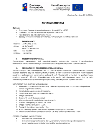 Ciechanów, dnia 11.10.2016 r. ZAPYTANIE OFERTOWE Dotyczy: Programu Operacyjnego Inteligentny Rozwój 2014 – 2020 Działania 3.2 Wsparcie wdroŜeń wyników prac B+R Poddziałania 3.2.1 Badania na rynek Zasady konkurencyjności określonej w Wytycznych kwalifikowalności I. Nazwa: Adres: ZAMAWIAJĄCY JAWAR Sp. z o.o. ul. Sońska 89 06-400 Ciechanów NIP: 5661833509 REGON: 130920790 II. PRZEDMIOT ZAMÓWIENIA Przedmiotem zamówienia jest zaprojektowanie, wykonanie, montaŜ i uruchomienie elementów węzła betoniarskiego dla linii do produkcji prefabrykatów z perlito-betonu. III. SZCZEGÓŁOWY OPIS PRZEDMIOTU ZAMÓWIENIA Elementy węzła betoniarskiego dla linii do produkcji prefabrykatów z perlito-betonu powinny być tak dobrane aby nie niszczyły struktury perlitu a cały węzeł betoniarski był rozmieszczone zgodnie z załączonym schematem załącznik nr1. Wydajność wytwórni na prefabrykację powinna wynosić 20m³/h. Wszystkie elementy węzła betoniarskiego muszą być w pełni zautomatyzowane i sprzęŜone z linią do produkcji prefabrykatów z perlito-betonu. URZĄDZENIA WCHODZĄCE W SKŁAD LINII: 1. Mieszarka o pojemności zasypowej 1000 dm³ z przyłączem do podawania perlitu + sonda wilgotności betonu, 2. Konstrukcja wsporcza pod mieszarkę, 3. Urządzenie wciągająco – napełniające, 4. Waga cementu, 5. Dozownik wody (waga wody), 6. Waga- dozownik dodatków chemicznych, 7. Zbiornik szeregowy kruszywa 2 x 15m³, 8. Waga taśmowa kruszyw ~7,5m, 9. Podajnik ślimakowy cementu ~9m, 10. Komputerowy system sterowania wytwórni z oprogramowaniem, 11. Wózek z torowiskiem podający beton lub inny system podawania ~15m. OFERTA POWINNA UWZGLĘDNIAĆ: • MontaŜ i uruchomienie linii, • Dokumentację techniczną do wykonania fundamentów pod urządzenia, ewentualnie wykonanie fundamentów pod urządzenia, 1 • • • • • Dokumentacja techniczna uwzględniające posadowienie urządzeń względem wysokości od poziomu 0,00 i pozostałych urządzeń wchodzących w skład wytwórni. Oprogramowanie do sterowania linią, Szkolenie dla operatorów, Serwis i gwarancję, Transport, IV. KRYTERIUM DOPUSZCZAJĄCE 1. Wykonawca musi wykazać się doświadczeniem w produkcji urządzeń oraz montaŜu linii do produkcji betonów lekkich - udokumentowanie produkcji i montaŜu w co najmniej 2 zakładach w ciągu ostatnich 3 lat, 2. Wykonawca musi posiadać co najmniej jeden punkt serwisowy na terenie Polski, V. TERMIN REALIZACJI ZAMÓWIENIA Termin realizacji przedmiotu zamówienia: − rozpoczęcie realizacji zamówienia: 20-02-2017 r. − zakończenie realizacji zamówienia: 31-03-2017 r. VI. MIEJSCE DOSTAWY PRZEDMIOTU ZAMÓWIENIA Gmina Glinojeck, Obręb Zygmuntowo działka 145/9 VII. SPOSÓB PRZYGOTOWANIA I WARUNKI SKŁADANIA OFERT Wymagania, co do sposobu przygotowania oferty i warunków jej składania są następujące: 1. Ofertę naleŜy sporządzić na załączonym formularzu (załącznik nr 2 do zapytania ofertowego). Wszystkie niezbędne informacje naleŜy zawrzeć w ofercie głównej, i jeśli jest taka konieczność załączyć niezbędne załączniki, wymieniając je w ofercie. Oferty nie złoŜone na formularzu nie będą rozpatrywane. 2. Ofertę naleŜy złoŜyć w formie określonej w pkt VIII. 3. Oferta musi być wypełniona pismem komputerowym lub odręcznym, opatrzona pieczątką Oferenta i podpisana przez osobę/y upowaŜnione do reprezentowania Oferenta. 4. Jeden Oferent moŜe złoŜyć tylko jedną ofertę. 5. Zamawiający wymaga ofert w PLN. 6. Oferty złoŜone po terminie nie będą rozpatrywane. Pod uwagę brany jest termin wpływu oferty. 7. Oferent moŜe przed upływem terminu składania ofert zmienić lub wycofać swoją ofertę. 8. Nie dopuszcza się składania ofert przez podmioty powiązane osobowo lub kapitałowo. VIII. FORMA i MIEJSCE SKŁADANIA OFERT Oferty naleŜy składać poprzez jeden, dogodny dla Wykonawcy sposób: w formie elektronicznej, jako skan podpisanej oferty - mailowo na adres [email protected] w formie papierowej - za pośrednictwem poczty bądź kuriera na adres: ul. Sońska 89 ; 06-400 Ciechanów w formie papierowej - osobiście pod adresem: ul. Sońska 89 ; 06-400 Ciechanów 2 IX. KRYTERIA OCENY OFERT Wybór najkorzystniejszej oferty zostanie dokonany w oparciu o następujące kryteria: cena netto (PLN) - waga 90%, okres gwarancji (w latach) – waga 10% Przyjmuje się, iŜ 1% wagi kryterium = 1 pkt. Zamawiający dokona wyboru najkorzystniejszego przedmiotu zamówienia poprzez przyznanie punktów za spełnienie kryteriów. Ocenie podlegać będzie łącznie cała oferta. Za najkorzystniejszą ofertę zostanie uznana ta, która zdobędzie największą ilość punktów, przy czym zasady przyznawania punktów są następujące: Kryterium „cena netto (PLN)”: Oferta z najniŜszą ceną netto otrzymuje 90 punktów. Pozostałe oferty będą punktowane liniowo (do 2 miejsc po przecinku) wedle następującej formuły arytmetycznej: (X÷Y) x 90, gdzie: X = najniŜsza cena, Y = cena ocenianej oferty. Kryterium „okres gwarancji (w latach)”: Oferta z najdłuŜszym okresem gwarancji otrzymuje 10 punktów. Pozostałe oferty będą punktowane liniowo (do 2 miejsc po przecinku) wedle następującej formuły arytmetycznej: (X÷Y) x 10, gdzie: X = okres gwarancji ocenianej oferty. Y = najdłuŜszy okres gwarancji, X. TERMIN SKŁADANIA OFERT Oferty naleŜy składać do 16-11-2016 r. do godz. 15:00. XI. OFERTY CZĘŚCIOWE I WARIANTOWE Nie dopuszcza się składania ofert częściowych i wariantowych. XII. WYBÓR NAJKORZYSTNIEJSZEJ OFERTY Wybór najkorzystniejszej oferty nastąpi w dniu 21-11-2016 r. Zamawiający maksymalnie w terminie 7-miu dni roboczych od wyboru najkorzystniejszej oferty zawiadomi Oferentów, o wynikach przeprowadzonego postępowania oraz umieści toŜsamą informację na swojej stronie internetowej, stronie internetowej PARP oraz w Dzienniku Urzędowym UE. XIII. ZASTRZEśENIA 1. Zamawiający zastrzega sobie prawo do wydłuŜenia t