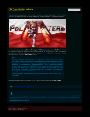 POL-Team: Kapitan wybrany Data publikacji : 10.06.2011 Ocena: 5/5 (2) Wczoraj zakończyły się trzecie w historii wybory na kapitana reprezentacji polski w grze StarCraft 2. Zwycięzca od samego początku nie dawał cienia szans swojemu rywalowi, a tym szczęśliwcem jest... ... wybrany na drugą kadencję Robert "Pentagram" Malinkiewicz. Jego rywal, ProTerran darował mu żmudne przeliczanie głosów i wczoraj przed godziną 18 zrezygnował ze swej kandydatury. Oświadczenie związane z tą decyzją umieścił na stronie NetWars.pl. Zwycięzca referendum również się wypowiedział, na stronie POL-Teamu czytamy: Wczoraj w godzinach wieczornych jeden z kandydatów do objęcia stanowiska Kapitana POL-Teamu - [FBI]ProTerran - wycofał swoją kandydaturę (oficjalne oświadczenie znaleźć możecie na forum Netwars).W związku z tym nie pozostaje mi nic innego, jak ogłosić, że Kapitanem na następną kadencję zostaje Pentagram - czyli ja. Zgodnie z regulaminem termin następnych wyborów to 23.09.2011. Mam nadzieję, że kolejne 3 miesiące, jakie przyjdzie nam razem spędzić, upłyną pod dobrym znakiem. Że towarzyszyły nam będą same sukcesy, a ewentualne porażki nie okażą się ziarnem niezgody, a jedynie impulsem do wyciągania wniosków na przyszłość. Dziękuję wszystkim, którzy aktywnie wzięli udział w wyborach i liczę na dalszy udział w życiu Kadry. Pozostaje nam pogratulować zwycięzcy i życzyć kadencji owocnej w zwycięstwa POL-Teamu. Tagi: POL-Team, wybory, Pentagram, ProTerran Uprasza się osoby kopiujące w całości newsy z naszej witryny na swoje strony lub fora o wstawianie widocznych klikalnych linków, bezpośrednio do pobranego tekstu. W przypadku braku widocznego linku, skopiowanie tekstu uważa się za kradzież własności intelektualnej. Dziękujemy: Administratorzy serwisu. Autor: Robert "Xrasnolud" Rojek Data publikacji : 10.06.2011 Liczba wyświetleń tekstu: 2145 Komentarz (6) dodaj komentarz Wiedziałem, że tak będzie! Nawet nie trzeba było oddawać swojego głosu by Pentagram został kapitanem POL-Teamu! Dla tego nie brałem udziału w tym głosowaniu, bo był to po prostu głupi żart ProTerrana. Chciał chyba ośmieszyć te wybory i to mu się udało :)~Thebisre 2011/06/10 11:36 @up Ja zrobiłem dokładnie to samo. Cieszę się że pentagram będzie dalej sprawował tą funkcję, życzę mu dużo sukcesów z naszą reprezentacją. GL HF ;)~luk1230 2011/06/10 12:15 Wybory prawie takie same jak te na prezydenta Białorusi. Niby kontrkandydat jest, ale tak naprawdę to go nie ma. A szkoda, bo moim zdaniem Pentagram jest w najlepszym razie średnim kapitanem. Na plus mu liczę, że dogaduje się jakoś ze wszystkimi reprezentantami. Na minus to, że w pol-team masz 1 event na 3 tygodnie-miesiąc tak naprawdę, bo dawanie info o tym, że za tydzień będzie info o turnieju za kolejny tydzień ciężko nazwać eventem. Moim zdaniem obecny kapitan po prostu się opier***a. Mógłby zacząć coś organizować z innymi reprezentacjami, a jak zawodnicy są zajęci (turnieje) to dawać jakieś info o tym jak naszym reprezentantom tam idzie.~Rivel 2011/06/10 12:22 bylo to juz walkowane ze inne kraje zwykle sie nie bawia w takie teamy~Razor 2011/06/10 14:03 Wybory były żałosne i tak samo olałem je:) Pentagram chyba jest fanem Lukaszenki.~Norcon 2011/06/10 18:07 Pentagram jak Pentagram - jaki jest każdy widzi, ale jakie logo wyczesane! Dziewczyny na jetpacki!~Bor5uczka 2011/06/10 18:30 dodaj komentarz 08.10.2015 Kampania "Szepty o zagładzie" dostępna za darmo (0 komentarzy) 27.09.2015 Kolejni bohaterowie w trybie Sprzymierzonych Dowódców (0 komentarzy) 22.09.2015 Cyfrowe gadżety za udział w BlizzCon 2015 (0 komentarzy) 15.07.2015 Legacy of the Void dostępne w przedsprzedaży! (0 komentarzy) 17.06.2015 Informacje z E3 - prolog kampanii Legacy of the Void (0 komentarzy) 30.05.2015 WCS Europe - sobota (30 maja) 18.00 grupa G - MaNa! (0 komentarzy) 07.05.2015 DreamHack Open France 2015 - już 8 maja - MaNa! (0 komentarzy) 03.05.2015 Na wesoło: postacie E-sportu 50 (0 komentarzy) 03.05.2015 IEM Katowice 2015 - jeszcze raz! (0 komentarzy) 03.05.2015 KeSPA Cup 2015 Season 1 - live! (0 komentarzy) 26.04.2015 Proleague - Top5 gier miesiąca (0 komentarzy) 26.04.2015 CJ Entus wygrywa 2 runde Proleague! (0 komentarzy) 18.04.2015 Wersja beta Legacy of the Void – aktualizacja 2.5.1 (0 komentarzy) 18.04.2015 WCS finals 2015 - galeria (0 komentarzy) 18.04.2015 Omówienie zmian w balansie Legacy of the Void (0 komentarzy) 11.04.2015 WCS Europe kwalifikacje z Polakami - dziś (sobota) 18.00 (0 komentarzy) 11.04.2015 Aktualizacja balansu Heart of the Swarm – 9 kwietnia (0 komentarzy) 11.04.2015 GSL Season1 2015 - galeria (0 komentarzy) 11.04.2015 Zbanowane konta w StarCraft II (0 komentarzy) 04.04.2015 Red Bull Battle Grounds powraca jesienią 2015 (0 komentarzy) (zobacz wszystkie)