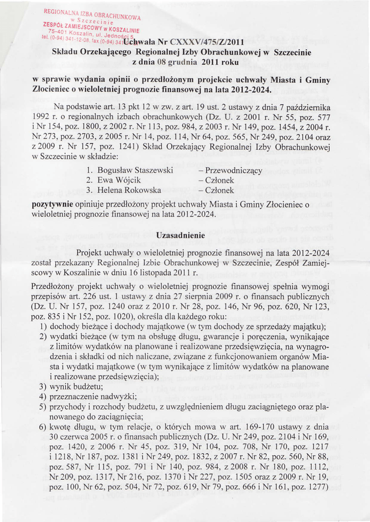 zoslał.ptzekazany Regionalnej Izbie obrachunkowej w Szczecinie, Zesp<ńZam\ejscowyw Koszaliniew dniu 16 listopada201I r.