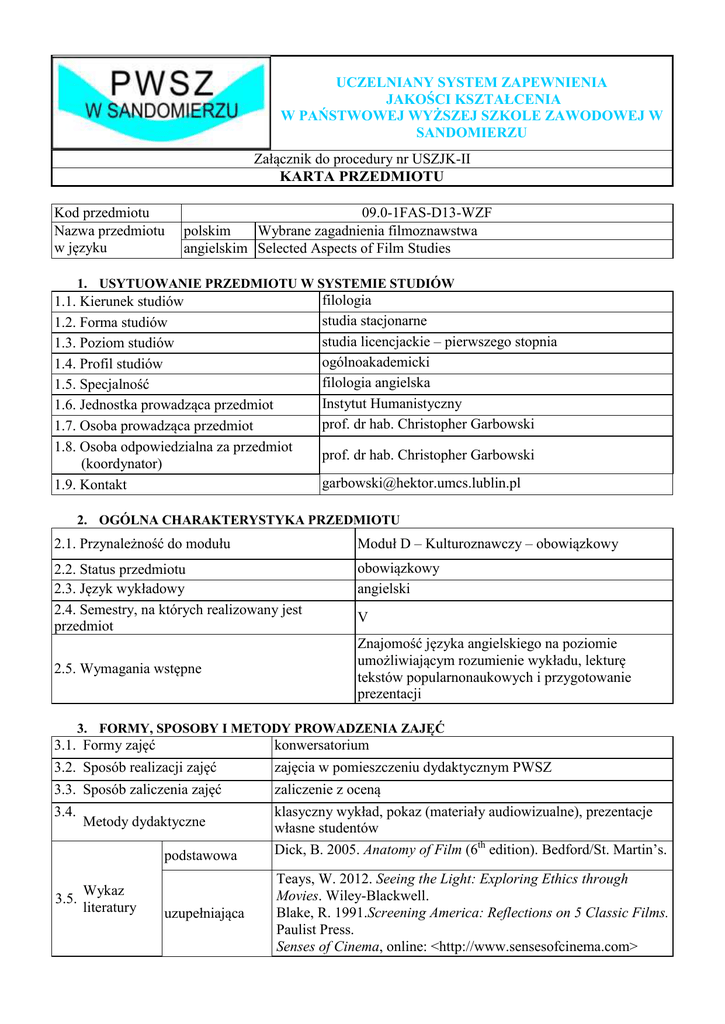 UCZELNIANY SYSTEM ZAPEWNIENIA JAKOŚCI KSZTAŁCENIA W PAŃSTWOWEJ WYŻSZEJ SZKOLE ZAWODOWEJ W SANDOMIERZU Załącznik do procedury nr USZJK-II KARTA PRZEDMIOTU Kod przedmiotu Nazwa przedmiotu w języku 09.0-1FAS-D13-WZF polskim Wybrane zagadnienia filmoznawstwa językowego angielskim Selected Aspects of Film Studies 1. USYTUOWANIE PRZEDMIOTU W SYSTEMIE STUDIÓW 1.1. Kierunek studiów 1.2. Forma studiów 1.3. Poziom studiów 1.4. Profil studiów 1.5. Specjalność 1.6. Jednostka prowadząca przedmiot 1.7. Osoba prowadząca przedmiot 1.8. Osoba odpowiedzialna za przedmiot (koordynator) 1.9. Kontakt filologia studia stacjonarne studia licencjackie – pierwszego stopnia ogólnoakademicki filologia angielska Instytut Humanistyczny prof. dr hab. Christopher Garbowski prof. dr hab. Christopher Garbowski [email protected] 2. OGÓLNA CHARAKTERYSTYKA PRZEDMIOTU 2.1. Przynależność do modułu Moduł D – Kulturoznawczy – obowiązkowy 2.2. Status przedmiotu 2.3. Język wykładowy 2.4. Semestry, na których realizowany jest przedmiot obowiązkowy angielski 2.5. Wymagania wstępne V Znajomość języka angielskiego na poziomie umożliwiającym rozumienie wykładu, lekturę tekstów popularnonaukowych i przygotowanie prezentacji 3. FORMY, SPOSOBY I METODY PROWADZENIA ZAJĘĆ 3.1. Formy zajęć konwersatorium 3.2. Sposób realizacji zajęć zajęcia w pomieszczeniu dydaktycznym PWSZ 3.3. Sposób zaliczenia zajęć zaliczenie z oceną 3.4. klasyczny wykład, pokaz (materiały audiowizualne), prezentacje własne studentów Dick, B. 2005. Anatomy of Film (6th edition). Bedford/St. Martin’s. Metody dydaktyczne podstawowa Wykaz 3.5. literatury uzupełniająca Teays, W. 2012. Seeing the Light: Exploring Ethics through Movies. Wiley-Blackwell. Blake, R. 1991.Screening America: Reflections on 5 Classic Films. Paulist Press. Senses of Cinema, online: <http://www.sensesofcinema.com> 4. CELE, TREŚCI I EFEKTY KSZTAŁCENIA 4.1. Cele przedmiotu Cl – Zapoznanie studentów z zarysem współczesnej kultury anglosaskiej (tj. względem filmów) w Stanach Zjednoczonych. C2 – Wskazanie na rozwój instytucji kulturowych (tj. względem filmów) w omawianym obszarze. C3 – Ukazanie znaczenia kultury anglosaskiej (tj. względem filmów) dla rozwoju społeczeństwo obywatelskiego. 4.2. Treści programowe 1. Film, jako sztuka masowa 2. Produkcja oraz dystrybucja filmu (Hollywoodzki, Europejski, etc.) 3. Forma oraz funkcja filmu 4. Narracja filmowa 5. Filmowe gatunki 6. Mise-en-scene filmowy 7. Kino stylu zerowego 8. Zdjęcia, ujęcia, montaż, itp. 9. Dźwięk w kinie 10. Intertekstualność w kinie, itp. 4.3. Efekty kształcenia Student, który zaliczył przedmiot Kod W01 W02 U01 U02 U03 K01 4.4. w zakresie WIEDZY: ma uporządkowaną ogólną wiedzę na temat kultury (tj. filmów) krajów anglosaskich. wymienia instytucje kultury (tj. filmów) i orientuje się we współczesnym życiu kulturalnym obszaru kulturowego języka specjalności. w zakresie UMIEJĘTNOŚCI: potrafi refleksyjnie odnosić się do własnych prac pisemnych i wypowiedzi ustnych oraz modyfikować je pod kontrolą wykładowcy. potrafi właściwie analizować przyczyny i przebieg konkretnych zjawisk kulturowych, społecznych i in. posiada umiejętności przygotowania wystąpień ustnych w języku specjalności i w języku polskim, dotyczących zagadnień wiedzy o kulturze. w zakresie KOMPETENCJI SPOŁECZNYCH: ma świadomość wartości dziedzictwa kulturowego (tj. filmów) obszaru językowego specjalności. FIL1A_W02 H1A_W02 FIL1A_W11 H1A_W10 FIL1A_U05 H1A_U03 FIL1A_U06 H1A_U04 FIL1A_U14 H1A_U10 FIL1A_K08 H1A_K05 Metody weryfikacji efektów kształcenia Efekt kształcenia W01 W02 U01 Odniesienie do efektów kształcenia dla kierunku dla obszaru Forma oceny Egzamin Egzamin Kolok Zadania do Referat Projekt Dyskusje Inne ustny pisemny wium wykonania Sprawozdanie ++ ++ + U02 U03 K01 ++ ++ + ++ 4.5.Kryteria jakościowe uzyskania oceny w danym zakresie efektów kształcenia Efekt kształcenia W01-WO2 U01-U03 K01 dostateczny/dostateczny plus (3/ 3,5) Ma podstawową wiedzę z zakresu filmów krajów anglosaskich, identyfikuje główne instytucje kultury (tj. filmów) i orientuje się we współczesnym życiu kulturalnym obszaru kulturowego języka specjalności, ale nie wykazuje szczegółowej znajomości treści pokazanych filmów. Nie zawsze jest w stanie umieścić omawiane filmy w szerszym kontekście historii i kultury anglosaskiej. Potrafi odnosić się krytycznie do własnych prac pisemnych i wypowiedzi ustnych w sposób podstawowy oraz modyfikować je pod ścisłą kontrolą wykładowcy. Ma świadomość wartości dziedzictwa kulturowego (tj. filmów) angielskiego obszaru językowego, ale nie wykazuje otwartości na nowe idee oraz samodzielności w poszukiwaniu nowych informacji. Nie zawsze realizuje powierzone zadania i ma pewne problemy z efektywnym organizowaniem pracy. Ocena dobry/ dobry plus (4/ 4,5) bardzo dobry (5) Zna większość spośród omawianych filmów krajów anglosaskich, identyfikuje główne instytucje kultury (tj. filmów) i dobrze orientuje się we współczesnym życiu kulturalnym obszaru kulturowego języka specjalności. Dobrze rozumie omawiane filmy w szerszym kontekście historii i kultury anglosaskiej. Ma gruntowną znajomość twórczości i ogólną wiedzę z zakresu filmów krajów anglosaskich, świetnie identyfikuje główne instytucje kultury (tj. filmów) i orientuje się we współczesnym życiu kulturalnym obszaru kulturowego języka specjalności, a także wykazuje szczegółową znajomość treści omawianych filmów. Potrafi refleksyjnie odnosić się do własnych prac pisemnych i wypowiedzi ustnych w sposób dość samodzielny oraz modyfikować je pod umiarkowaną kontrolą wykładowcy. Potrafi refleksyjnie i dogłębnie odnosić się do własnych prac pisemnych i wypowiedzi ustnych oraz modyfikować je pod minimalną kontrolą wykładowcy. Ma świadomość wartości dziedzictwa kulturowego (tj. filmów) angi