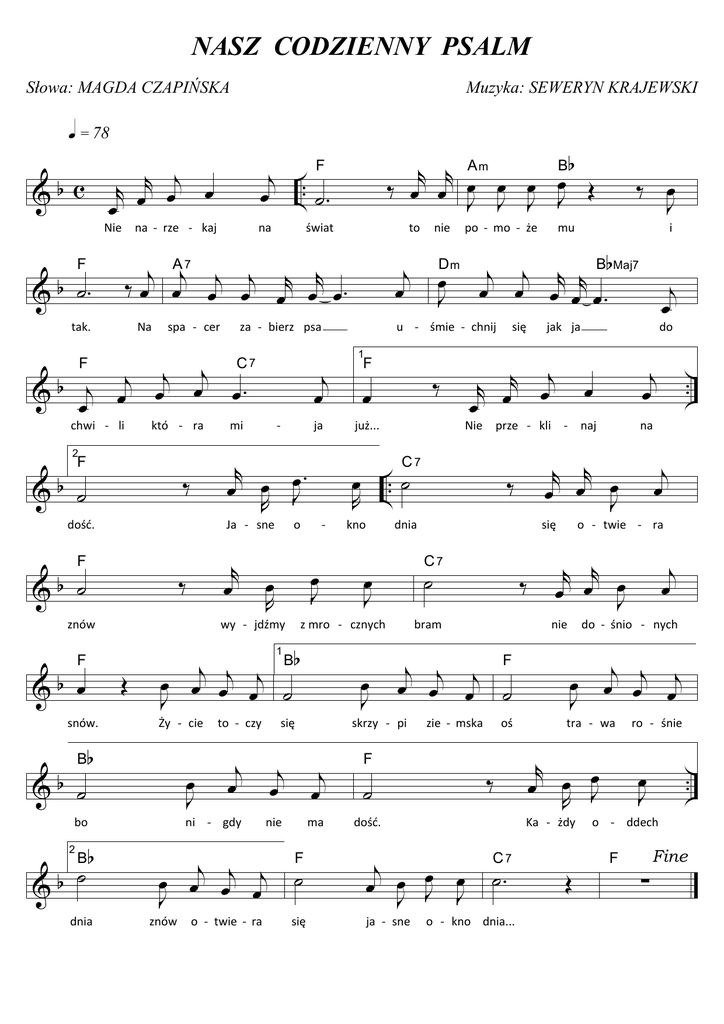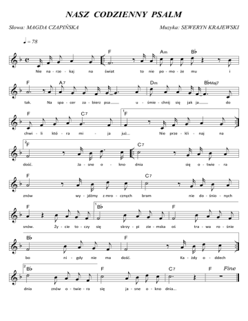 NASZ CODZIENNY PSALM Słowa: MAGDA CZAPIŃSKA Muzyka: SEWERYN KRAJEWSKI q = 78 r j &b c r œ œ œ œ Nie na -‐ rze -‐ kaj na & b ˙. tak. Na spa -‐ cer chwi -‐ li któ -‐ ra 2 &b ˙ dość. &b ˙ znów bo ˙ &b 2 B r œ ‰ b dnia ja o -‐ œ J œ R wy -‐ jdźmy Œ b -‐ Ja -‐ sne F snów. mi r œ œ œJ . R ‰ F &b ˙ j œ C7 &b œ to j j j Bb œ œ œ œ ˙ J Ży -‐ cie œ J to -‐ czy ni -‐ gdy nie ma F j j j œ œ œ œ ˙ J znów o -‐ twie -‐ ra ‰ œ już... œ R się się .. ˙ ‰ dnia œ J ˙ ‰ bram naj zie -‐ mska oś ‰ F ˙ dość. ˙. C7 o -‐ kno dnia... .. na j œ r r œ œ œ J j œ o -‐ twie -‐ ra do -‐ śnio -‐ nych j œ œ œj œj J tra -‐ wa r œ œ œJ R Ka -‐ żdy j œ œ œJ œJ J do r r œ œ œ J nie j j j F œ œ œ ˙ j œ j œ œ się C7 ja -‐ sne i jak ja prze -‐ kli -‐ C7 kno mu r œr œj œ Nie skrzy -‐ pi j j œ œ œj œ J F ‰ œ J j j r r B bMaj7 œ œ œ œ œ. Dm 1 œ J się po -‐ mo -‐ że u -‐ śmie -‐ chnij z mro -‐ cznych 1 nie j œ za -‐ bierz psa j j œj . b j & œ œ œ œ F B świat A7 j ‰ œ œj œj œj œr œr œ . F F r r Aœ m œ œ Bœ b ‰ œ œ J J J J Œ j .. F œ ˙. Œ ro -‐ śnie œ J .. ∑ Fine o -‐ ddech F