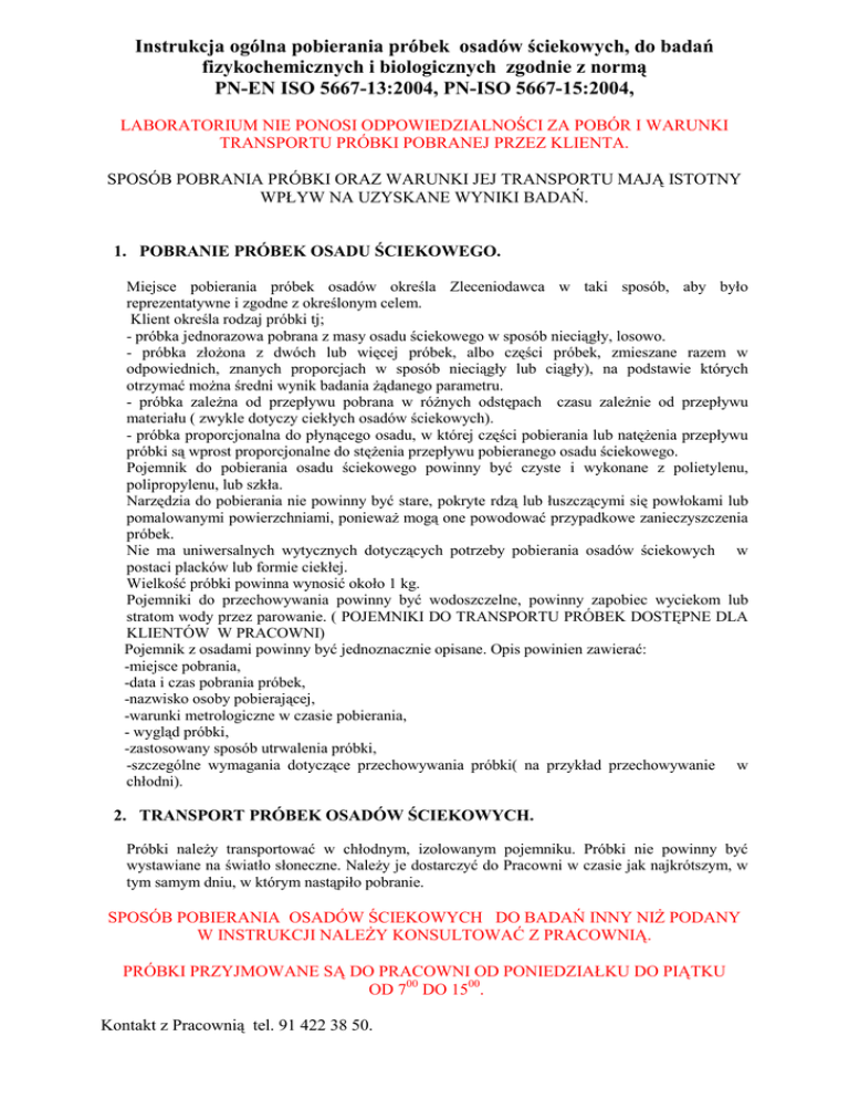 Instrukcja ogólna pobierania próbek osadów ściekowych, do badań fizykochemicznych i biologicznych zgodnie z normą PN-EN ISO 5667-13:2004, PN-ISO 5667-15:2004, LABORATORIUM NIE PONOSI ODPOWIEDZIALNOŚCI ZA POBÓR I WARUNKI TRANSPORTU PRÓBKI POBRANEJ PRZEZ KLIENTA. SPOSÓB POBRANIA PRÓBKI ORAZ WARUNKI JEJ TRANSPORTU MAJĄ ISTOTNY WPŁYW NA UZYSKANE WYNIKI BADAŃ. 1. POBRANIE PRÓBEK OSADU ŚCIEKOWEGO. Miejsce pobierania próbek osadów określa Zleceniodawca w taki sposób, aby było reprezentatywne i zgodne z określonym celem. Klient określa rodzaj próbki tj; - próbka jednorazowa pobrana z masy osadu ściekowego w sposób nieciągły, losowo. - próbka złoŜona z dwóch lub więcej próbek, albo części próbek, zmieszane razem w odpowiednich, znanych proporcjach w sposób nieciągły lub ciągły), na podstawie których otrzymać moŜna średni wynik badania Ŝądanego parametru. - próbka zaleŜna od przepływu pobrana w róŜnych odstępach czasu zaleŜnie od przepływu materiału ( zwykle dotyczy ciekłych osadów ściekowych). - próbka proporcjonalna do płynącego osadu, w której części pobierania lub natęŜenia przepływu próbki są wprost proporcjonalne do stęŜenia przepływu pobieranego osadu ściekowego. Pojemnik do pobierania osadu ściekowego powinny być czyste i wykonane z polietylenu, polipropylenu, lub szkła. Narzędzia do pobierania nie powinny być stare, pokryte rdzą lub łuszczącymi się powłokami lub pomalowanymi powierzchniami, poniewaŜ mogą one powodować przypadkowe zanieczyszczenia próbek. Nie ma uniwersalnych wytycznych dotyczących potrzeby pobierania osadów ściekowych w postaci placków lub formie ciekłej. Wielkość próbki powinna wynosić około 1 kg. Pojemniki do przechowywania powinny być wodoszczelne, powinny zapobiec wyciekom lub stratom wody przez parowanie. ( POJEMNIKI DO TRANSPORTU PRÓBEK DOSTĘPNE DLA KLIENTÓW W PRACOWNI) Pojemnik z osadami powinny być jednoznacznie opisane. Opis powinien zawierać: -miejsce pobrania, -data i czas pobrania próbek, -nazwisko osoby pobierającej, -warunki metrologiczne w czasie pobierania, - wygląd próbki, -zastosowany sposób utrwalenia próbki, -szczególne wymagania dotyczące przechowywania próbki( na przykład przechowywanie w chłodni). 2. TRANSPORT PRÓBEK OSADÓW ŚCIEKOWYCH. Próbki naleŜy transportować w chłodnym, izolowanym pojemniku. Próbki nie powinny być wystawiane na światło słoneczne. NaleŜy je dostarczyć do Pracowni w czasie jak najkrótszym, w tym samym dniu, w którym nastąpiło pobranie. SPOSÓB POBIERANIA OSADÓW ŚCIEKOWYCH DO BADAŃ INNY NIś PODANY W INSTRUKCJI NALEśY KONSULTOWAĆ Z PRACOWNIĄ. PRÓBKI PRZYJMOWANE SĄ DO PRACOWNI OD PONIEDZIAŁKU DO PIĄTKU OD 700 DO 1500. Kontakt z Pracownią tel. 91 422 38 50.