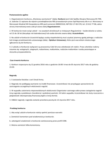 Postanowienia ogólne 1. Organizatorem konkursu „Klockowy asortyment” (dalej: Konkurs) jest Cobi Spółka Akcyjna Warszawa 04-709, ul. Jaskrów 11 wpisana do rejestru przedsiębiorców KRS prowadzonym przez Sąd Rejonowy dla m.st. Warszawy w Warszawie Wydział XIII Gospodarczy KRS pod numerem 000025310, NIP 952-17-83-570, tel. 22 612 77 86, adres strony internetowej www.cobi.pl zwana dalej Organizatorem. 2. W konkursie może wziąć udział – na zasadach określonych w niniejszym Regulaminie – każde dziecko w wieku od 13 do 18 lat (decyduje rok kalendarzowy) lub osoba dorosła zwana dalej: Uczestnikiem. 3. Na udział w Konkursie Uczestnik będący osobą niepełnoletnią musi uzyskać pisemną zgodę jednego z rodziców lub innego przedstawiciela ustawowego (dalej : Opiekun Ustawowy), która jest warunkiem skutecznego zgłoszenia się do Konkursu. 4. Z udziału w Konkursie wyłączeni są pracownicy Cobi SA oraz członkowie ich rodzin. Przez członków rodziny rozumie się: wstępnych, zstępnych, rodzeństwo, małżonków, rodziców małżonków i osoby pozostające w stosunku przysposobienia. Czas trwania konkursu 1. Konkurs rozpoczyna się 12 grudnia 2016 roku o godzinie 16:00 i trwa do 05 stycznia 2017 roku do godziny 23:59. Nagrody 1. 5 zestawów klocków z serii Small Army. 2. Nagrody nie podlegają wymianie na środki finansowe. Uczestnikowi nie przysługuje uprawnienie do zastrzegania szczególnych właściwości nagród. 3. W wypadku zaistnienia nieprzewidzianych okoliczności Organizator zastrzega sobie prawo zastąpienia nagród inną nagrodą o podobnym charakterze i podobnej wartości. W takim wypadku Uczestnikowi nie służy roszczenie o jakąkolwiek rekompensatę finansową bądź w innej formie. 4. Odbiór nagrody: nagroda zostanie przesłana pocztą do 12 stycznia 2017 roku. Przebieg konkursu 1. Aby wziąć udział w konkursie należy spełnić poniższe warunki: a. Zamieścić komentarz pod wiadomością o konkursie. b. udostępnić wiadomość o konkursie zamieszczoną przez profil COBI. 2. Można zamieścić kilka komentarzy. 3. Osoba dodająca komentarz musi być jego autorem. Niedopuszczalne jest kopiowanie komentarzy innych użytkowników oraz jakichkolwiek innych osób. 4. Zgłoszenie do konkursu może nastąpić najpóźniej do dnia 05 stycznia 2017 roku do godziny 23:59. 5. Pięciu Uczestników którzy zamieszczą najbardziej merytoryczne komentarze, będą aktywni w dyskusji itd. zostanie nagrodzonych po jednym z 5 zestawów Small Army. Decyzję o przyznaniu nagród podejmie Organizator. Decyzja ta jest ostateczna i niepodważalna. 6. Rozstrzygniecie konkursu nastąpi 07 stycznia 2017 roku. 7. Wyniki konkursu zostaną opublikowane na profilu Cobi na Facebooku. 8. Zwycięzcy zostaną powiadomieni o wygranej w komentarzu pod swoim wpisem konkursowym. 9. Komentarze obraźliwe, wulgarne, niestosowne, nie będące odpowiedzią na postawione pytanie, będące spamem itp. będą dyskwalifikowane z konkursu. Decyzja o dyskwalifikacji jest ostateczna i niepodważalna. Przetwarzanie danych osobowych Uczestników Konkursu 1. Administratorem danych jest Organizator, który przetwarza informacje dotyczące Uczestników – tylko w celu realizacji konkursu zgodnie z niniejszym regulaminem, w tym wysyłki nagrody, a także w celach dowodowych. 2. Dane osobowe podlegają ochronie na podstawie Ustawy z dn. 29 sierpnia 1997 r. o ochronie danych osobowych. Uczestnikom przysługuje prawo dostępu do danych osobowych, które ich dotyczą oraz prawo ich poprawiania zgodnie z ustawą o ochronie danych osobowych (tj. Dz.U. z 2002 r., nr 101, poz. 926 ze zm.). 3. Przetwarzanie danych Uczestnika nastąpi wyłącznie w przypadku wyrażenia zgody na ich przetwarzanie. 4. Ww. dane osobowe zostaną usunięte przez Organizatorów, niezwłocznie po dostarczeniu Nagród do Uczestników, nie później niż 4 miesiące po zakończeniu Konkursu. 5. Organizator informuje, że dane Uczestników konkursu, dotyczące osób do 18 roku życia muszą być przekazane wyłącznie przez rodziców lub opiekunów prawnych Uczestnika (Opiekunów ustawowych). 6. Organizator informuje, że podanie przez Uczestnika danych jest dobrowolne. Postanowienia końcowe 1. Niniejszy Konkurs, którego warunki zostały określone przez Organizatora nie jest grą losową ani zakładem wzajemnym w rozumieniu art. 2 ustawy z dnia 29 lipca 1992 o grach i zakładach wzajemnych (Dz. U. 2004 r. Nr 4 poz. 27). 2. Poprzez zgłoszenie udziału w Konkursie uczestnicy wyrażają zgodę i upoważniają Organizatora do przetwarzania ich danych osobowych dla celów organizacji Konkursu, wyłonienia laureatów Konkursu oraz wydania nagród. 3. Przesłanie zgłoszenia jest także równoznaczne ze zgodą na publikacje zawartej w nim pracy wraz z danymi Uczestnika i Opiekuna Ustawowego w serwisie www.cobi.pl, w szczególności oznacza zgodę na bezpłatne utrwalanie i zwielokrotnianie pracy dowolną techniką oraz na publiczne udostępnianie pracy w taki sposób, aby każdy mógł mieć do niego dostęp w miejscu i w czasie przez siebie wybranym przez Organizatora. 4. Wzięcie udziału w konkursie jest także równoznaczne z bezpłatnym upoważnieniem Organizatora do wykonywania w jego imieniu autorskich praw osobistych do pracy, w szczególności do decydowania o pierwszym udostępnieniu, o wycofaniu, sposobie oznaczenia oraz nienaruszalności pracy. 5. Zgłaszając swój udział w Konkursie i biorąc w nim udział Uczestnik oraz jego Opiekun Ustawowy podporządkowują się postanowieniom niniejszego regulaminu Konkursu i wyrażają zgodę na jego treść. 6. Organizator Konkursu zastrzega sobie prawo zmiany Regulaminu, również w zakresie nagród i terminów rozstrzygnięcia Konkursu, co zostanie ogłoszone na stronie internetowej www.cobi.pl. 7. Organizator nie ponosi odpowiedzialności za usługi pocztowe lub za działalność osób trzecich. Dotyczy to również wszelkich uszkodzeń nagród powstałych w trakcie przesyłki nag