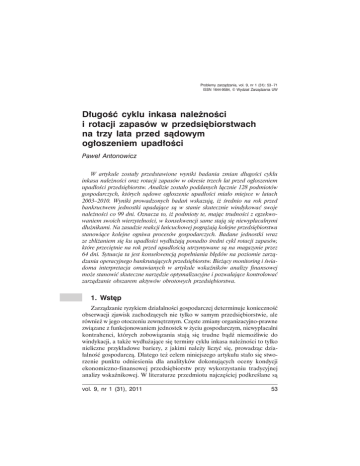Problemy zarzÈdzania, vol. 9, nr 1 (31): 53 – 71 ISSN 1644-9584, © Wydziaï ZarzÈdzania UW DïugoĂÊ cyklu inkasa naleĝnoĂci i rotacji zapasów w przedsiÚbiorstwach na trzy lata przed sÈdowym ogïoszeniem upadïoĂci Paweï Antonowicz W artykule zostaïy przedstawione wyniki badania zmian dïugoĂci cyklu inkasa naleĝnoĂci oraz rotacji zapasów w okresie trzech lat przed ogïoszeniem upadïoĂci przedsiÚbiorstw. Analizie zostaïo poddanych ïÈcznie 128 podmiotów gospodarczych, których sÈdowe ogïoszenie upadïoĂci miaïo miejsce w latach 2003–2010. Wyniki prowadzonych badañ wskazujÈ, iĝ Ărednio na rok przed bankructwem jednostki upadajÈce sÈ w stanie skutecznie windykowaÊ swoje naleĝnoĂci co 99 dni. Oznacza to, iĝ podmioty te, majÈc trudnoĂci z egzekwowaniem swoich wierzytelnoĂci, w konsekwencji same stajÈ siÚ niewypïacalnymi dïuĝnikami. Na zasadzie reakcji ïañcuchowej pogrÈĝajÈ kolejne przedsiÚbiorstwa stanowiÈce kolejne ogniwa procesów gospodarczych. Badane jednostki wraz ze zbliĝaniem siÚ ku upadïoĂci wydïuĝajÈ ponadto Ăredni cykl rotacji zapasów, które przeciÚtnie na rok przed upadïoĂciÈ utrzymywane sÈ na magazynie przez 64 dni. Sytuacja ta jest konsekwencjÈ popeïniania bïÚdów na poziomie zarzÈdzania operacyjnego bankrutujÈcych przedsiÚbiorstw. BieĝÈcy monitoring i Ăwiadoma interpretacja omawianych w artykule wskaěników analizy finansowej moĝe stanowiÊ skuteczne narzÚdzie optymalizacyjne i pozwalajÈce kontrolowaÊ zarzÈdzanie obszarem aktywów obrotowych przedsiÚbiorstwa. 1. WstÚp ZarzÈdzanie ryzykiem dziaïalnoĂci gospodarczej determinuje koniecznoĂÊ obserwacji zjawisk zachodzÈcych nie tylko w samym przedsiÚbiorstwie, ale równieĝ w jego otoczeniu zewnÚtrznym. CzÚste zmiany organizacyjno-prawne zwiÈzane z funkcjonowaniem jednostek w ĝyciu gospodarczym, niewypïacalni kontrahenci, których zobowiÈzania stajÈ siÚ trudne bÈdě niemoĝliwie do windykacji, a takĝe wydïuĝajÈce siÚ terminy cyklu inkasa naleĝnoĂci to tylko nieliczne przykïadowe bariery, z jakimi naleĝy liczyÊ siÚ, prowadzÈc dziaïalnoĂÊ gospodarczÈ. Dlatego teĝ celem niniejszego artykuïu staïo siÚ stworzenie punktu odniesienia dla analityków dokonujÈcych oceny kondycji ekonomiczno-finansowej przedsiÚbiorstw przy wykorzystaniu tradycyjnej analizy wskaěnikowej. W literaturze przedmiotu najczÚĂciej podkreĂlane sÈ vol. 9, nr 1 (31), 2011 53 Paweï Antonowicz bowiem wartoĂci brzegowe wybranych wskaěników, jakimi powinny charakteryzowaÊ siÚ jednostki o dobrej kondycji ekonomiczno-finansowej. W praktyce gospodarczej równie cennych informacji dostarczajÈ nam Ărednie wartoĂci, jakimi charakteryzujÈ siÚ podmioty posiadajÈce trudnoĂci finansowe, niespïacajÈce na czas swoich zobowiÈzañ, czyli w ostatecznoĂci – przedsiÚbiorstwa podlegajÈce procesom upadïoĂciowym. Wiedza w tym zakresie moĝe okazaÊ siÚ pomocna w predykcji upadïoĂci kooperantów, a takĝe moĝe staÊ siÚ narzÚdziem wspomagajÈcym podejmowanie decyzji na potrzeby wïasnego przedsiÚbiorstwa. W niniejszym artykule skoncentrowano uwagÚ na dwóch wybranych wskaěnikach analizy finansowej (wzory 1 i 2), które pozwalajÈ oceniÊ efektywnoĂÊ zarzÈdzania aktywami obrotowymi przedsiÚbiorstwa: Wskaěnik cyklu inkasa naleĝnoĂci = Wskaěnik cyklu rotacji zapasów = ¥rednioroczny stan naleĝnoĂci × 365 Przychody ze sprzedaĝy . (1) ¥rednioroczny stan zapasów × 365 Przychody ze sprzedaĝy . (2) Omówione w artykule wskaěniki, stanowiÈce de facto skïadowe cyklu operacyjnego przedsiÚbiorstwa, stanowiÈ dwie spoĂród trzydziestu róĝnych miar analizy finansowej, które zostaïy poddane przez autora szerszym badaniom na próbie przedsiÚbiorstw upadïych. Naleĝy jednak pamiÚtaÊ, iĝ ich analiza moĝe dostarczyÊ wartoĂciowych informacji jedynie pod warunkiem poddania badaniom wiarygodnych i rzetelnych sprawozdañ finansowych. CzÚsto jednak tak rozumiany warunek konieczny (conditio sine qua non) dokonywanej analizy w odniesieniu do przedsiÚbiorstw upadajÈcych nie jest w praktyce speïniony, co moĝe istotnie podwaĝaÊ zasadnoĂÊ prowadzonych badañ. Wedïug B. Micherdy naleĝy pamiÚtaÊ o trzech dziedzinach ksztaïtujÈcych wiarygodnoĂÊ obrazu dziaïalnoĂci jednostki gospodarczej: rachunkowoĂci, analizie finansowej, badaniu sprawozdania finansowego (Micherda 2006: 20–23). To pozwala w pewnym stopniu dystansowaÊ siÚ od dokonywania oceny podmiotu wyïÈcznie przez pryzmat samej analizy sprawozdañ finansowych, lecz naleĝy pamiÚtaÊ, iĝ analiza ta jest jednoczeĂnie „koniecznym (…) i integralnym skïadnikiem audytu” przedsiÚbiorstwa (Gabrusewicz 2010: 95–98). Pierwszy z analizowanych wskaěników pozwala oceniÊ rotacjÚ naleĝnoĂci w dniach. Wskaěnik ten nazywany jest równieĝ cyklem inkasa naleĝnoĂci, gdyĝ jego wartoĂÊ (wyraĝona w dniach) wskazuje na skutecznoĂÊ windykowania przez przedsiÚbiorstwo swoich wierzytelnoĂci. Wskaěnik ten uwaĝany jest za jeden z najlepszych predyktorów (obok wskaěników z grupy pïynnoĂci finansowej), którego postaÊ relatywnie czÚsto wystÚpuje w konstrukcji polskich modeli dyskryminacyjnych, stanowiÈcych Systemy Wczesnego Ostrzegania (SWO) przedsiÚbiorstw przed zagroĝeniem upadïoĂciÈ (Antonowicz 2010: 203–215). Jednostki upadajÈce, mimo iĝ w statystyce podmio54 Problemy zarzÈdzania DïugoĂÊ cyklu inkasa naleĝnoĂci i rotacji zapasów w przedsiÚbiorstwach... tów funkcjonujÈcych w Polsce nie stanowiÈ duĝego udziaïu, czÚsto pogrÈĝajÈ swojÈ upadïoĂciÈ wierzycieli, których naleĝnoĂci stajÈ siÚ niezwykle trudne, a czÚsto wrÚcz praktycznie niemoĝliwe do windykacji. W drugiej czÚĂci artykuïu zostaïa natomiast opisana charakterystyka innego z czÚsto stosowanych w praktyce analitycznej wskaěników aktywnoĂci i obrotowoĂci, mianowicie wskaěnika rotacji zapasów w dniach. Jego wartoĂÊ bÚdzie bowiem mówiïa 