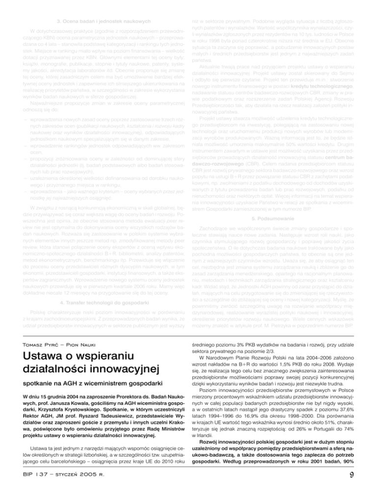 3. Ocena badań i jednostek naukowych W dotychczasowej praktyce (zgodnie z rozporządzeniem przewodniczącego KBN) ocena parametryczna jednostek naukowych – przeprowadzana co 4 lata – stanowiła podstawę kategoryzacji i rankingu tych jednostek. Miejsce w rankingu miało wpływ na poziom finansowania – wielkość dotacji przyznawanej przez KBN. Głównymi elementami tej oceny były; książki, monografie, publikacje, stopnie i tytuły naukowe, patenty, systemy jakości, akredytacja laboratoriów itd. Obecnie proponuje się zmianę tej oceny, której zasadniczym celem ma być umożliwienie bardziej efektywnej oceny jednostek i zapewnienie ich silniejszego ukierunkowania na realizację priorytetów państwa, w szczególności w zakresie wykorzystania wyników badań naukowych w sferze gospodarczej. Najważniejsze propozycje zmian w zakresie oceny parametrycznej odnoszą się do: – wprowadzenia nowych zasad oceny poprzez zastosowanie trzech różnych zakresów ocen (publikacji naukowych, kształcenia i rozwoju kadry naukowej oraz wyników działalności innowacyjnej), odpowiadających jednostkom naukowym specjalizującym się w danym zakresie, – wprowadzenie rankingów jednostek odpowiadających ww. zakresom ocen, – propozycji zróżnicowania oceny w zależności od dominującej sfery działalności jednostki (tj. badań podstawowych albo badań stosowanych lub prac rozwojowych), – uzależnienia określonej wielkości dofinansowania od dorobku naukowego i przyznanego miejsca w rankingu, – wprowadzenia – jako ważnego kryterium – oceny wybranych przez jednostkę jej najważniejszych osiągnięć. W związku z rosnącą konkurencją ekonomiczną w skali globalnej, będzie przywiązywać się coraz większa wagę do oceny badań i rozwoju. Powszechna jest opinia, że obecnie stosowana metoda ewaluacji peer review nie jest optymalna do dokonywania oceny wszystkich rodzajów badań naukowych. Rozważa się zastosowanie w polskim systemie wybranych elementów innych jeszcze metod np. zmodyfikowanej metody peer review, która stanowi połączenie oceny ekspertów z oceną wpływu ekonomiczno-społecznego działalności B+R, bibliometrii, analizy patentów, metod ekonometrycznych, benchmarkingu itp. Przewiduje się włączenie do procesu oceny przedstawicieli różnych dyscyplin naukowych, w tym ekonomii, przedstawicieli gospodarki, instytucji finansowych, a także ekspertów zagranicznych. Wprowadzenie nowego systemu oceny jednostek naukowych przewiduje się w pierwszym kwartale 2006 roku. Mamy więc dokładnie niecałe 12 miesięcy na przygotowanie się do tej oceny. 4. Transfer technologii do gospodarki Polskę charakteryzuje niski poziom innowacyjności w porównaniu z krajami zachodnioeuropejskimi. Z przeprowadzonych badań wynika, że udział przedsiębiorstw innowacyjnych w sektorze publicznym jest wyższy Tomasz Pyrć – Pion Nauki Ustawa o wspieraniu działalności innowacyjnej spotkanie na AGH z wiceministrem gospodarki W dniu 15 grudnia 2004 na zaproszenie Prorektora ds. Badań Naukowych, prof. Janusza Kowala, gościliśmy na AGH wiceministra gospodarki, Krzysztofa Krystowskiego. Spotkanie, w którym uczestniczyli Rektor AGH, JM prof. Ryszard Tadeusiewicz, przedstawiciele Wydziałów oraz zaproszeni goście z przemysłu i innych uczelni Krakowa, poświęcone było omówieniu przyjętego przez Radę Ministrów projektu ustawy o wspieraniu działalności innowacyjnej. Ustawa ta jest jednym z narzędzi mających wspomóc osiągnięcie celów określonych w strategii lizbońskiej, a w szczególności tzw. uzupełniającego celu barcelońskiego – osiągnięcia przez kraje UE do 2010 roku BIP 137 – styczeń 2005 r. niż w sektorze prywatnym. Podobnie wygląda sytuacja z liczbą zgłoszonych patentów i wynalazków. Wartość współczynnika wynalazczości, czyli wynalazków zgłoszonych przez rezydentów na 10 tys. ludności w Polsce w roku 1998 była ponad czterokrotnie niższa niż średnia w EU. Obecnie sytuacja ta zaczyna się poprawiać, a pobudzenie innowacyjnych postaw małych i średnich przedsiębiorstw jest jednym z najważniejszych zadań państwa. Aktualnie trwają prace nad przyjęciem projektu ustawy o wspieraniu działalności innowacyjnej. Projekt ustawy został skierowany do Sejmu i odbyło się pierwsze czytanie. Projekt ten przewiduje m.in.: stworzenie nowego instrumentu finansowego w postaci kredytu technologicznego, nadawanie statusu centrów badawczo-rozwojowych CBR, zmiany w prawie podatkowym oraz rozszerzenie zadań Polskiej Agencji Rozwoju Przedsiębiorczości tak, aby działała na rzecz realizacji założeń polityki innowacyjnej państwa. Projekt ustawy stwarza możliwość udzielenia kredytu technologicznego przedsiębiorcom na inwestycję, polegającą na zastosowaniu nowej technologii oraz uruchomieniu produkcji nowych wyrobów lub modernizacji wyrobów produkowanych. Ważną informacją jest to, że będzie istniała możliwość umorzenia maksymalnie 50% wartości kredytu. Drugim instrumentem zawartym w ustawie jest możliwość uzyskania przez przedsiębiorców prowadzących działalność innowacyjną statusu centrum badawczo-rozwojowego (CBR). Celem nadania przedsiębiorcom statusu CBR jest rozwój prywatnego sektora badawczo-rozwojowego oraz wzrost popytu na usługi B+R przez powiązanie statusu CBR z zachętami podatkowymi, np. zwolnieniami z podatku dochodowego od dochodów uzyskiwanych z tytułu prowadzenia badań lub prac rozwojowych, podatku od nieruchomości oraz niektórych opłat. Więcej informacji na temat wspierania innowacyjności uzyskacie Państwo w relacji ze spotkania z wiceministrem Gospodarki zamieszczonej w tym numerze BIP. 5. Podsumowanie Zachodzące we współczesnym świecie zmiany gospodarcze i społeczne stawiają nauce nowe zadania. Następuje wzrost roli nauki, jako czynnika stymulującego rozwój gospodarczy i poprawę jakości życia społeczeństwa. O ile dotychczas badania naukowe traktowane były jako 