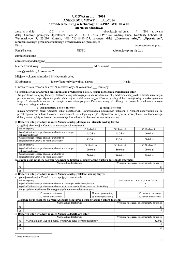 UMOWA nr …/…/2014 ANEKS DO UMOWY nr …/…/2014 o świadczenie usług w technologii BEZPRZEWODOWEJ oferta standardowa zawarta w dniu: ____/____/201__ r. w _________________________ obowiązuje od dnia: ____/____/201__ r. zwana dalej „Umową”, pomiędzy Operatorem Sieci: Z. P. U. I. „KEYCOM” s.c. Andrzej Buda, Konstanty Łoboda, ul. Wyszyńskiego 5, 23-210 Kraśnik, NIP 715-16-60-175, zwanym dalej „Dostawcą usług”, „Operatorem”, reprezentowanego przez upoważnionego Przedstawiciela Operatora, a: Firmą: __________________________________________________________________________ reprezentowaną przez: Panią/Panem:______________________________PESEL:_________________legitymującą(ym) się d.o.:_____________ zamieszkałą(ym):____________________________________________________________________________________ adres korespondencyjny:______________________________________________________________________________ telefon kontaktowy1: ___________________________________ adres e-mail1: __________________________________ zwaną(ym) dalej „Abonentem”. Miejsce wykonania instalacji i świadczenia usług___________________________________________________________ ID Abonenta: ____________ Identyfikator użytkownika / nazwa: ___________________ Hasło: ____________________ Umowa została zawarta na czas: □ nieokreślony / □ określony: ___ miesięcy §1 Przedmiot Umowy, termin oczekiwania na przyłączenie do sieci, termin rozpoczęcia świadczenia usług. 1. Na podstawie niniejszej Umowy Dostawca usług zobowiązuje się do świadczenia usług telekomunikacyjnych w lokalu wskazanym przez Abonenta, po przyłączeniu go do publicznej sieci telekomunikacyjnej Dostawcy usług i/lub aktywacji usług, z wykorzystaniem urządzeń własnych Abonenta lub sprzętu udostępnionego przez Dostawcę usług, określonego w protokole przekazania sprzętu i aktywacji usług, w zakresie: □ usługi dostępu do sieci Internet □ usługi Telefonii innych wybranych przez Abonenta usług dodatkowych, towarzyszących powyższym usługom, a Abonent zobowiązuje się do przestrzegania warunków Umowy i stanowiących jej integralną część załączników, w tym w szczególności do terminowego dokonywania zapłaty za świadczone mu usługi, których zakres określono w niniejszej umowie. 2. Dostawca usług świadczy na rzecz Abonenta usługę dostępu do Internetu według taryfy: □ ogólnej określonej w Cenniku na następujących warunkach: Pakiet taryfowy □ Radio 2,4 Wysokość miesięcznego abonamentu brutto w wybranym pakiecie taryfowym Wysokość miesięcznego abonamentu brutto po przekształceniu Umowy na czas nieokreślony Pakiet taryfowy Wysokość miesięcznego abonamentu brutto w wybranym pakiecie taryfowym Wysokość miesięcznego abonamentu brutto po przekształceniu Umowy na czas nieokreślony □ 5Radio - 2 □ 5Radio - 4 45,36 zł 45,36 zł 60,00 zł 45,36 zł 45,36 zł 60,00 zł □ 5Radio - 6 □ 5Radio - 8 □ 5Radio - 10 70,00 zł 80,00 zł 99,00 zł 70,00 zł 80,00 zł 99,00 zł Dostawca usług świadczy na rzecz Abonenta dodatkowe usługi związane z usługą dostępu do Internetu: Nazwa usługi dodatkowej Wysokość miesięcznego abonamentu za usługę zł zł □ □ 3. Dostawca usług świadczy na rzecz Abonenta usługę Telefonii według taryfy: □ ogólnej określonej w Cenniku na następujących warunkach: Pakiet taryfowy Wysokość miesięcznego abonamentu brutto w wybranym pakiecie taryfowym: Wysokość miesięcznego abonamentu brutto po przekształceniu Umowy na czas nieokreślony: Tani telefon w Z. P. U. I. „KEYCOM” s.c. …………… zł …………… zł Usługa będzie świadczona dla następujących numerów telefonicznych: □ numer przeniesiony □ numer tymczasowy □ numer przeniesiony □ numer tymczasowy □ numer przeniesiony □ numer tymczasowy Dostawca usług świadczy na rzecz Abonenta dodatkowe usługi związane z usługą Telefonii: Nazwa usługi dodatkowej Wysokość miesięcznego abonamentu za usługę zł zł □ □ 4. Dostawca usług świadczy na rzecz Abonenta dodatkowe usługi: Nazwa usługi dodatkowej □ □ □ 1 Wysyłka faktur VAT na podany w umowie adres korespondencyjny Wysokość miesięcznego abonamentu za usługę 5,00 zł zł zł Dane nieobowiązkowe 1 5. Operator w związku ze świadczeniem usług udziela Abonentowi ulgi: Nazwa Wysokość miesięcznej ulgi Czas obowiązywania ulgi zł zł zł □ □ □ 6. W związku z rozpoczęciem świadczenia usług Abonent ponosi koszty aktywacji, instalacji, wykonania przyłącza: Wysokość opłaty Wysokość ulgi Do zapłaty zł zł □ Montaż / instalacja zł zł □ Aktywacja usług(i) zł zł □ Razem: zł zł zł zł zł zł 7. Inne koszty związane z uruchomieniem usługi: Wysokość opłaty □ □ □ Opłata uzupełniająca Razem: Wysokość ulgi zł zł zł zł Do zapłaty zł zł zł zł zł zł zł zł 8. Miejsce wykonania instalacji i świadczenia usług zostało wskazane w preambule do umowy. Abonent oświadcza i zapewnia, że posiada tytuł prawny do w/w lokalu, oraz zobowiązuje się zachować go przez okres na jaki zawarł Umowę. 9. Wykonanie instalacji i podłączenie Abonenta do sieci Dostawcy usług nastąpi nie później niż w ciągu 14 dni roboczych od podpisania niniejszej Umowy, w terminie wspólnie uzgodnionym przez strony Umowy. Rozpoczęcie świadczenia usług (Aktywacja) nastąpi nie później niż w ciągu 14 od wykonania przyłączenia do sieci Dostawcy usług, a jeśli Abonent ma już wykonane przyłączenie, wtedy w ciągu 7 od podpisania niniejszej Umowy. 10. Wysokość przyznanych ulg stanowi różnicę w wysokości opłat określonych dla umowy zawieranej na czas nieokreślony a wysokością opłat stosowanych w przypadku zawarcia umowy na czas określony na warunkach promocyjnych. 11. Opłata z tytułu wykonania przyłącza, montażu / instalacji pobierana jest wyłącznie w przypadku wykonania przyłącza, instalacji w lokalu Abonenta