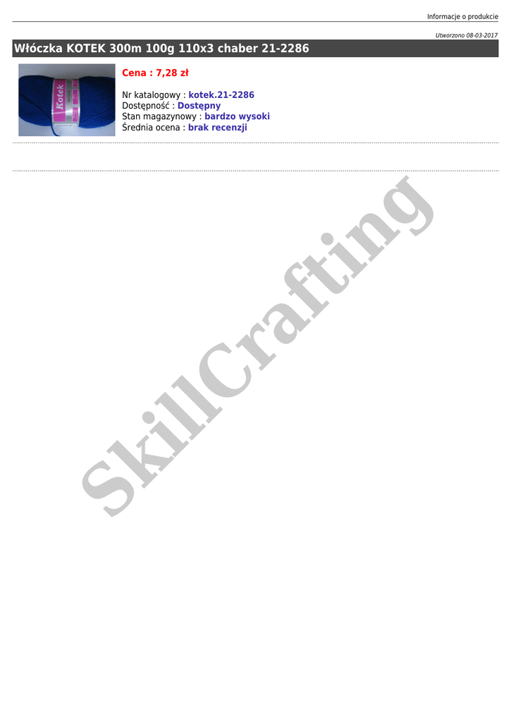 Informacje o produkcie Utworzono 08-03-2017 Włóczka KOTEK 300m 100g 110x3 chaber 21-2286 Cena : 7,28 zł Sk ill C ra ft in g Nr katalogowy : kotek.21-2286 Dostępność : Dostępny Stan magazynowy : bardzo wysoki Średnia ocena : brak recenzji