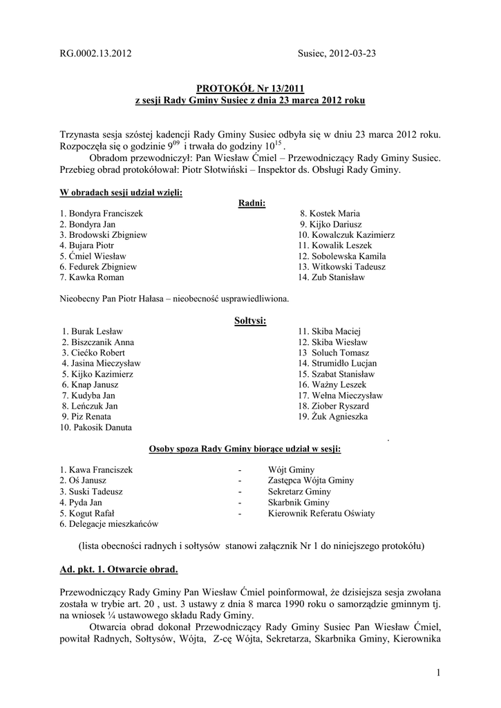 RG.0002.13.2012 Susiec, 2012-03-23 PROTOKÓŁ Nr 13/2011 z sesji Rady Gminy Susiec z dnia 23 marca 2012 roku Trzynasta sesja szóstej kadencji Rady Gminy Susiec odbyła się w dniu 23 marca 2012 roku. Rozpoczęła się o godzinie 909 i trwała do godziny 1015 . Obradom przewodniczył: Pan Wiesław Ćmiel – Przewodniczący Rady Gminy Susiec. Przebieg obrad protokółował: Piotr Słotwiński – Inspektor ds. Obsługi Rady Gminy. W obradach sesji udział wzięli: Radni: 1. Bondyra Franciszek 2. Bondyra Jan 3. Brodowski Zbigniew 4. Bujara Piotr 5. Ćmiel Wiesław 6. Fedurek Zbigniew 7. Kawka Roman 8. Kostek Maria 9. Kijko Dariusz 10. Kowalczuk Kazimierz 11. Kowalik Leszek 12. Sobolewska Kamila 13. Witkowski Tadeusz 14. Zub Stanisław Nieobecny Pan Piotr Hałasa – nieobecność usprawiedliwiona. Sołtysi: 1. Burak Lesław 2. Biszczanik Anna 3. Ciećko Robert 4. Jasina Mieczysław 5. Kijko Kazimierz 6. Knap Janusz 7. Kudyba Jan 8. Leńczuk Jan 9. Piz Renata 10. Pakosik Danuta 11. Skiba Maciej 12. Skiba Wiesław 13 Soluch Tomasz 14. Strumidło Lucjan 15. Szabat Stanisław 16. Ważny Leszek 17. Wełna Mieczysław 18. Ziober Ryszard 19. Żuk Agnieszka . Osoby spoza Rady Gminy biorące udział w sesji: 1. Kawa Franciszek 2. Oś Janusz 3. Suski Tadeusz 4. Pyda Jan 5. Kogut Rafał 6. Delegacje mieszkańców - - Wójt Gminy Zastępca Wójta Gminy Sekretarz Gminy Skarbnik Gminy Kierownik Referatu Oświaty (lista obecności radnych i sołtysów stanowi załącznik Nr 1 do niniejszego protokółu) Ad. pkt. 1. Otwarcie obrad. Przewodniczący Rady Gminy Pan Wiesław Ćmiel poinformował, że dzisiejsza sesja zwołana została w trybie art. 20 , ust. 3 ustawy z dnia 8 marca 1990 roku o samorządzie gminnym tj. na wniosek ¼ ustawowego składu Rady Gminy. Otwarcia obrad dokonał Przewodniczący Rady Gminy Susiec Pan Wiesław Ćmiel, powitał Radnych, Sołtysów, Wójta, Z-cę Wójta, Sekretarza, Skarbnika Gminy, Kierownika 1 Ref. Oświaty oraz delegacje mieszkańców miejscowości, w których planuje się utworzyć filie Zespołu Szkół Publicznych w Suścu tj. w Grabowicy Paarach i Kunkach. Ad. pkt . 2. Stwierdzenie quorum. Na podstawie listy obecności Przewodniczący Rady Gminy Pan Wiesław Ćmiel stwierdził, że na stan 15-tu radnych ustawowego składu Rady Gminy w sesji uczestniczy 14tu, co upoważnia Radę Gminy do podejmowania prawomocnych uchwał. Ad. pkt. 3. Przyjęcie porządku obrad. Przewodniczący Rady Gminy Pan Wiesław Ćmiel poinformował, że radni na dzisiejszą sesję otrzymali materiały oraz zaproszenia z ustalonym porządkiem obrad. Zapytał czy są uwagi lub wnioski w stosunku do proponowanego porządku obrad. Pan Kowalik Leszek wystąpił z wnioskiem o utworzenie filii Zespołu Szkół w Majdanie Sopockim z siedzibą w Ciotuszy Starej. Przewodniczący Rady Gminy Pan Wiesław Ćmiel poddał rozpatrzenie wniosku przez grupę radnych, którzy wystąpili z wnioskiem o zwołanie sesji. Wniosek został rozpatrzony pozytywnie w głosowaniu jawnym 4-ma głosami „za”. Przewodniczący Rady Gminy Pan Wiesław Ćmiel poddał pod głosowanie jawne przyjęcie porządku obrad przez grupę radnych, którzy wystąpili z wnioskiem o zwołanie sesji. z uwzględnieniem wniosku Pan Kowalika Leszka. Porządek obrad został przyjęty w sposób jednomyślny tj.: 4- ma głosami „za” i przedstawia się następująco: 1. 2. 3. 4. a) b) c) d) Otwarcie obrad sesji. Stwierdzenie quorum. Przyjęcie porządku obrad. Podjecie uchwał w następujących sprawach: powołania Filii Zespołu Szkół Publicznych w Suścu w Grabowicy (Oddz..0-III), powołania Filii Zespołu Szkół Publicznych w Suścu w Kunkach (Oddz. 0-III), powołania Filii Zespołu Szkół Publicznych w Suścu w Paarach (Oddz. 0-III), powołania Filii Zespołu Szkół w Majdanie Sopockim Pierwszym w Ciotuszy Starej (Oddz. 0-III). 5. Zakończenie obrad. Ad. pkt 9 Podjęcie uchwał w następujących sprawach: a) powołania Filii Zespołu Szkół Publicznych w Suścu w Grabowicy (Oddz. 0-III), Pan Brodowski Zbigniew zapytał jakie jest stanowisko Wójta Gminy w sprawie utworzenia szkół filialnych w Grabowicy, Kunkach, Paarach i Ciotuszy Starej. Wójt Gminy Pan Franciszek Kawa poinformował, że przygotowując budżet gminy na rok 2012 założył, że wszystkie małe szkoły zostaną zlikwidowane. Ci radni, którzy zagłosują za utworzeniem filii, będą przeciw prowadzeniu inwestycji w naszej gminie. Liczba dzieci w szkołach filialnych byłaby bardzo mała. Jedynie w szkole w Łuszczaczu jest taka ilość dzieci, która pozwoliłaby utworzyć filię lub prowadzenie powierzyć stowarzyszeniu. Rodzice dzieci uczęszczających do szkoły w Kunkach zdeklarowali, że ich dzieci będą uczęszczały do szkoły w Kunkach, ale jedno z rodziców złożyło kartę zgłoszenia do przedszkola w Tomaszowie Lubelskim, chociaż dziecko to mogłoby uczęszczać do oddziału przedszkolnego w Kunkach. Podobna sytuacja jest w Paarach. Rodzice również złożyli deklaracje, że ich dzieci będą 2 uczęszczać do szkoły w Paarach, a jest mi wiadomo że czwórka z nich pośle swoje dzieci do szkoły w Suścu. Powołując szkoły filialne będziemy mieć powtórkę związaną z prowadzeniem Szkoły Podstawowej w Ciotuszy Starej. Będziemy nauczycielom płacić za gotowość do pracy. Nikt nie może nam dzisiaj zagwarantować, że wszyscy rodzice poślą swoje dzieci do utworzonych szkół filialnych. Pani Maria Kostek zapytała, czy stowarzyszenie może powstać w Grabowicy. Kierownik Referatu Pan Rafał Kogut poinformował, że stowarzyszenie może prowadzić wszystkie małe szkoły. Wójt Gminy Pan Franciszek Kawa poinformował, że szkołę w Grabowicy może prowadzić stowarzyszenie utworzone w miejscowości Łuszczacz. Byłoby to bardziej ekonomiczne dla budżetu gminy, stowarzyszenia i nauczycieli. Nauczyciele mogliby uczyć w jednej i drugiej szkole jeżeli w Łuszczaczu brakowałoby im godzin do pełnego etatu. Jednak Pani Agnieszka Żuk obawia si