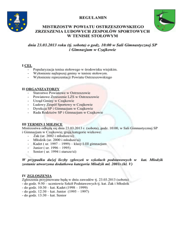REGULAMIN MISTRZOSTW POWIATU OSTRZESZOWSKIEGO ZRZESZENIA LUDOWYCH ZESPOŁÓW SPORTOWYCH W TENISIE STOŁOWYM dnia 23.03.2013 roku (tj. sobota) o godz. 10:00 w Sali Gimnastycznej SP i Gimnazjum w Czajkowie I CEL - Popularyzacja tenisa stołowego w środowisku wiejskim. - Wyłonienie najlepszej gminy w tenisie stołowym. - Wyłonienie reprezentacji Powiatu Ostrzeszowskiego II ORGANIZATORZY - Starostwo Powiatowe w Ostrzeszowie - Powiatowe Zrzeszenie LZS w Ostrzeszowie - Urząd Gminy w Czajkowie - Ludowy Zespół Sportowy w Czajkowie - Dyrekcja SP i Gimnazjum w Czajkowie - Rada Rodziców SP i Gimnazjum w Czajkowie III TERMIN I MIEJSCE Mistrzostwa odbędą się dnia 23.03.2013 r. (sobota), godz. 10:00, w Sali Gimnastycznej SP i Gimnazjum w Czajkowie, grają kategorie wiekowe: - Żak (ur. 2002 i młodsze/si) - Młodzik (ur. 2000 i młodsze/si) - Kadet ( ur. 1997 – 1999) – klasy I-III gimnazjum - Junior ( ur. 1996 – 1995) - Senior ( ur. 1994 i starsze/si) W przypadku dużej liczby zgłoszeń w szkołach podstawowych w zostanie utworzona dodatkowa kategoria Młodzik mł. 2001r.(kl. V) IV ZGŁOSZENIA Zgłoszenia przyjmowane będą w dniu zawodów tj. 23.03.2013 (sobota) - do godz. 9:50 – uczniowie Szkół Podstawowych tj. kat. Żak i Młodzik - do godz. 10:30 – kat. Kadet (1998 – 1999) - do godz. 12:30 – kat. Junior (1995 – 1997) - do godz. 13:30 – kat. Senior kat. Młodzik V ZASADY UCZESTNICTWA - Zawodnicy winni posiadać ważne badania lekarskie – odpowiedzialni opiekunowie i kierownicy ekip. - System gry zależny będzie od ilości zawodników - Sprawy sporne rozstrzyga komisja sędziowska - W zawodach mają prawo startu mieszkańcy powiatu Ostrzeszowskiego – zawodnicy/ki będący członkami Zrzeszenia LZS lub niezrzeszeni. - Liczba osób wymagana do rozegrania danej kategorii to 3 zawodników. VI SPOSÓB PRZEPROWADZENIA Sposób przeprowadzenia rozgrywek zostanie ustalony przed rozgrywkami w danej kategorii wiekowej. VII NAGRODY - za I miejsce – statuetka za miejsce I-III - medale i dyplomy VIII ZASADY FINANSOWANIA - Koszty organizacyjne i nagród w zawodach pokrywają organizatorzy. - Koszty przejazdów na zawody i diet pokrywają zainteresowane gminy i kluby sportowe. IX UWAGI KOŃCOWE - Za aktualne badania lekarskie odpowiedzialni są kierownicy ekip. - Wszelkie sprawy sporne i nie ujęte w niniejszym regulaminie rozstrzygają organizatorzy - Uczestnicy imprezy objęci są ubezpieczeniem zbiorowym, zawartym przez Wielkopolskie Zrzeszenie Ludowe Zespoły Sportowe w Poznaniu. - Organizator nie ponosi odpowiedzialności za pozostawione rakietki, telefony komórkowe oraz inne prywatne rzeczy uczestników. Serdecznie zapraszamy do udziału w turnieju Ze sportowym pozdrowieniem Prezes LZS Czajków Wiceprzewodniczący PZ LZS w Ostrzeszowie Jan Kędzia Edmund Tetlak