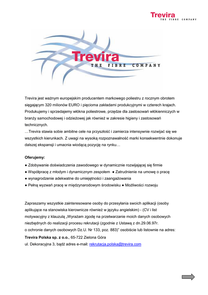 Trevira jest waŜnym europejskim producentem markowego poliestru z rocznym obrotem sięgającym 320 milionów EURO i pięcioma zakładami produkcyjnymi w czterech krajach. Produkujemy i sprzedajemy włókna poliestrowe, przędze dla zastosowań włókienniczych w branŜy samochodowej i odzieŜowej jak równieŜ w zakresie higieny i zastosowań technicznych. …Trevira stawia sobie ambitne cele na przyszłość i zamierza intensywnie rozwijać się we wszystkich kierunkach. Z uwagi na wysoką rozpoznawalność marki konsekwentnie dokonuje dalszej ekspansji i umacnia wiodącą pozycję na rynku… Oferujemy: ● Zdobywanie doświadczenia zawodowego w dynamicznie rozwijającej się firmie ● Współpracę z młodym i dynamicznym zespołem ● Zatrudnienie na umowę o pracę ● wynagrodzenie adekwatne do umiejętności i zaangaŜowania ● Pełną wyzwań pracę w międzynarodowym środowisku ● MoŜliwości rozwoju Zapraszamy wszystkie zainteresowane osoby do przesyłania swoich aplikacji (osoby aplikujące na stanowiska kierownicze równieŜ w języku angielskim) - (CV i list motywacyjny z klauzulą „WyraŜam zgodę na przetwarzanie moich danych osobowych niezbędnych do realizacji procesu rekrutacji (zgodnie z Ustawą z dn.29.06.97r. o ochronie danych osobowych Dz.U. Nr 133, poz. 883)” osobiście lub listownie na adres: Trevira Polska sp. z o.o., 65-722 Zielona Góra ul. Dekoracyjna 3, bądź adres e-mail: [email protected] USTAWIACZ MASZYN Wymagania: • • • • • • Preferowane wykształcenie min. zawodowe (techniczne), Dyspozycyjność (praca w systemie zmianowym), Dobry stan zdrowia, Wysoka motywacja do pracy, Umiejętność pracy w grupie, Sumienność i odpowiedzialność, Zakres obowiązków: • • • Ustawianie parametrów maszyny (maszyny włókiennicze), Obsługa i nadzór nad prawidłową pracą urządzeń, Dbałość o porządek. PRACOWNIK PRODUKCJI BEZPOŚREDNIEJ Wymagania: • • • • • • • Chęci do pracy, Dyspozycyjność (praca w systemie zmianowym), Dobry stan zdrowia, Wysoka motywacja do pracy, Umiejętność pracy w grupie, Sumienność i odpowiedzialność, Mile widziane doświadczenie w pracy na stanowisku operatora maszyn . Zakres obowiązków: • • • Ustawianie parametrów maszyny (maszyny włókiennicze), Obsługa i nadzór nad prawidłową pracą urządzeń, Dbałość o porządek w miejscu pracy. SPECJALISTA DS. JAKOŚCI Wymagania: • • • • • • • • wykształcenie wyŜsze, mile widziane w zakresie jakości, znajomość norm jakościowych ISO 9000/TS 16949, bardzo dobra znajomości pakietu MS Office, komunikatywna znajomość języka angielskiego, zdolność analitycznego myślenia, samodzielność, odporność na stres, komunikatywność i umiejętność pracy w zespole. Zakres obowiązków: • • • • tworzenie nowych oraz aktualizowanie istniejących specyfikacji kontroli, rozwiązywanie aktualnych problemów jakościowych, obsługa reklamacji, współpraca z innymi działami firmy w zakresie poprawy jakości, ustalania nowych standardów jakościowych oraz zatwierdzania wzorców. PRACOWNIK PRODUKCJI BEZPOŚREDNIEJ Wymagania: • • • • • • • Chęci do pracy, Dyspozycyjność (praca w systemie zmianowym), Dobry stan zdrowia, Wysoka motywacja do pracy, Umiejętność pracy w grupie, Sumienność i odpowiedzialność, Mile widziane doświadczenie w pracy na stanowisku operatora maszyn . Zakres obowiązków: • • • Ustawianie parametrów maszyny (maszyny włókiennicze), Obsługa i nadzór nad prawidłową pracą urządzeń, Dbałość o porządek w miejscu pracy. SPECJALISTA DS. KADR I PŁAC Wymagania: • • • • • • • • • wykształcenie minimum średnie, co najmniej dwuletnie doświadczenie w pracy na samodzielnym stanowisku związanym z administracją kadrową, praktyczna znajomość przepisów prawa pracy i ubezpieczeń społecznych, duŜa samodzielność, umiejętność analitycznego myślenia, bardzo dobra organizacja pracy i samodyscyplina, znajomość programu Płatnik, umiejętność obsługi komputera, pakietu MS Office, znajomość systemu PCBIZNES PrestiŜ/ SAP będzie dodatkowym atutem, bieŜące śledzenie zmian w przepisach oraz literatury fachowej. Zakres obowiązków: • • • • • • • sporządzanie dokumentów dotyczących nawiązywania i rozwiązywania stosunku pracy oraz umów cywilno – prawnych, naliczanie i rozliczanie wynagrodzeń dla pracowników zgodnie z przepisami prawa pracy i ubezpieczeń społecznych, prowadzenie dokumentacji kadrowo-płacowych i archiwizacja akt personalnych, przygotowanie informacji do ZUS o nowozatrudnionych i zwalnianych pracownikach oraz raportów dotyczących wynagrodzeń w wyznaczonych terminach poprzez program PŁATNIK, przygotowywanie raportów dla potrzeb działów finansowego i personalnego, prowadzenie ewidencji czasu pracy, współpraca ze specjalistą w zakresie BHP. ASYSTENT/-KA BIURA Wymagania: • • • • • • • • wykształcenie wyŜsze lub w trakcie studiów (studia zaoczne), min. roczne doświadczenie w pracy na stanowisku sekretarki lub asystentki, bardzo dobra znajomość j. angielskiego – częsty kontakt z obcokrajowcami, znajomość języka niemieckiego będzie dodatkowym atutem samodzielność, systematyczność, rzetelność, terminowość. Zakres obowiązków: • • • • zapewnienie wsparcia kierownictwa firmy i pracowników biura w codziennej pracy, kompleksowe prowadzenie sekretariatu firmy, administrowanie i zamawianie sprzętu, materiałów biurowych oraz innych artykułów, prowadzenie kalendarza Dyrektora Zakładu, • • • • • • koordynacja spraw administracyjnych biura, organizację spotkań, podróŜy słuŜbowych, przygotowywanie dokumentacji, raportów, tłumaczeń, prowadzenie i nadzór nad korespondencją, współpraca z firmami zewnętrznymi i instytucjami, dbanie o wizerunek firmy. ----------------------