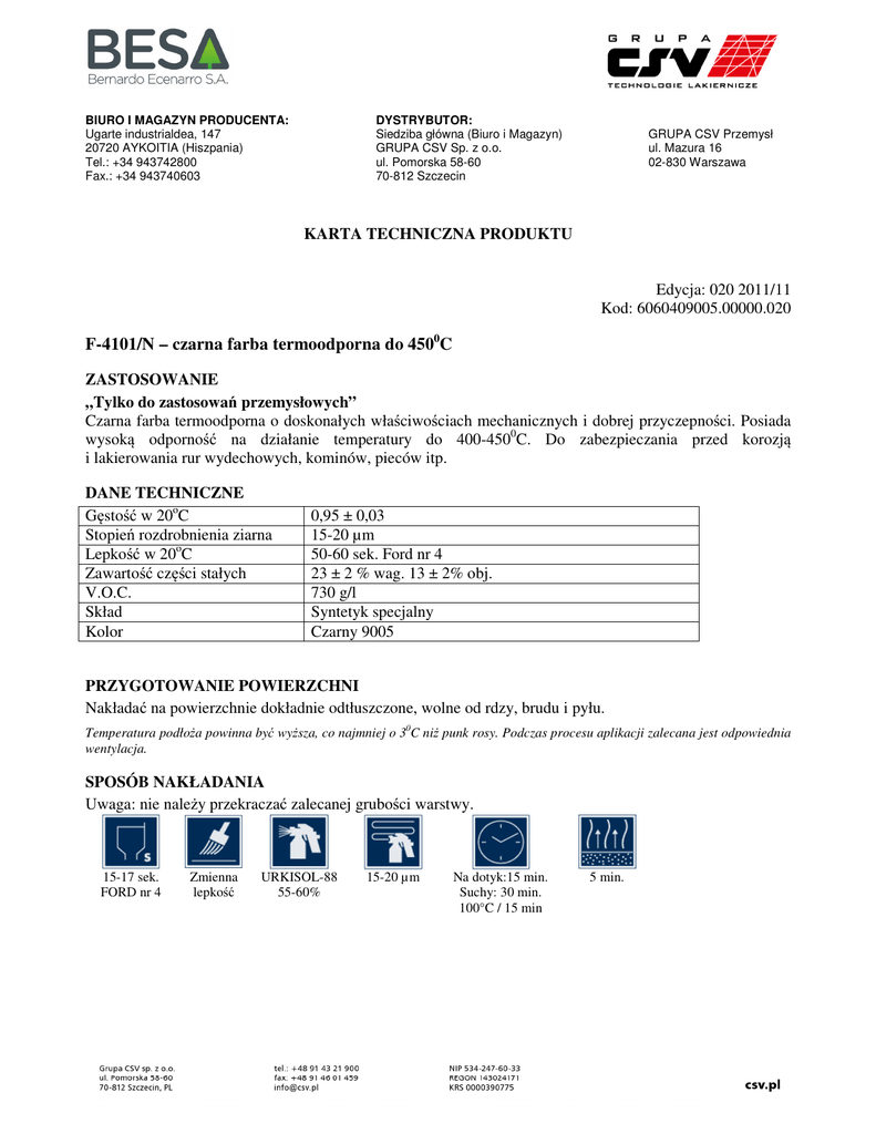 BIURO I MAGAZYN PRODUCENTA: Ugarte industrialdea, 147 20720 AYKOITIA (Hiszpania) Tel.: +34 943742800 Fax.: +34 943740603 DYSTRYBUTOR: Siedziba główna (Biuro i Magazyn) GRUPA CSV Sp. z o.o. ul. Pomorska 58-60 70-812 Szczecin GRUPA CSV Przemysł ul. Mazura 16 02-830 Warszawa KARTA TECHNICZNA PRODUKTU Edycja: 020 2011/11 Kod: 6060409005.00000.020 F-4101/N – czarna farba termoodporna do 4500C ZASTOSOWANIE „Tylko do zastosowań przemysłowych” Czarna farba termoodporna o doskonałych właściwościach mechanicznych i dobrej przyczepności. Posiada wysoką odporność na działanie temperatury do 400-4500C. Do zabezpieczania przed korozją i lakierowania rur wydechowych, kominów, pieców itp. DANE TECHNICZNE Gęstość w 20oC Stopień rozdrobnienia ziarna Lepkość w 20oC Zawartość części stałych V.O.C. Skład Kolor 0,95 ± 0,03 15-20 µm 50-60 sek. Ford nr 4 23 ± 2 % wag. 13 ± 2% obj. 730 g/l Syntetyk specjalny Czarny 9005 PRZYGOTOWANIE POWIERZCHNI Nakładać na powierzchnie dokładnie odtłuszczone, wolne od rdzy, brudu i pyłu. Temperatura podłoża powinna być wyższa, co najmniej o 30C niż punk rosy. Podczas procesu aplikacji zalecana jest odpowiednia wentylacja. SPOSÓB NAKŁADANIA Uwaga: nie należy przekraczać zalecanej grubości warstwy. 15-17 sek. FORD nr 4 Zmienna lepkość URKISOL-88 55-60% 15-20 µ m Na dotyk:15 min. Suchy: 30 min. 100°C / 15 min 5 min. CHARAKTERYSTYKA LAKIERU Wydajność teoretyczna 6 - 7 m2/l (20 μm) Połysk 60° – 60° gładki satynowy 10-15% Druga warstwa 1 godz. Jeżeli farba nie zostanie dobrze wysuszona, to nie uzyska swoich właściwości. (BE) Jeśli wymagana jest wyższa ochrona można nałożyć farbę termoodporną F-4101/N na grunt F-2105 na następny dzień (ok. 24 godzin). (BE) Uwaga. Produkt osiąga swoje właściwości jeśli jest utwardzany w podwyższonej temperaturze. SKŁADOWANIE Przechowywać w zamkniętych opakowaniach, w miejscach wietrzonych, chronić przed światłem słonecznym. Zalecana temperatura składowania 5-30 0C. Termin ważności – 2 lata w oryginalnie zamkniętych opakowaniach. Ograniczenia odpowiedzialności Informacje techniczne zawarte w niniejszej karcie technicznej produktu oparte są na badaniach laboratoryjnych producenta i odpowiadają naszej najlepszej wiedzy. Wszelkie odstępstwa od niniejszej karty technicznej, muszą być pisemnie uzgodnione z Działem Technicznym CSV. Produkt może być stosowany wyłącznie do celów określonych w niniejszej Karcie Technicznej, w sposób w niej określony i przez osoby z odpowiednią wiedzą techniczną w tym zakresie. CSV nie przyjmuje odpowiedzialności za straty i szkody wynikłe z zastosowania tegoż produktu w sposób niezgodny z kartą techniczną. Zastrzegamy sobie prawo do zmian w niniejszej karcie technicznej bez uprzedniego zawiadomienia. Do końcowego użytkownika należy upewnienie się czy posiada aktualną wersję karty technicznej, zwracając się z tym bezpośrednio do dystrybutora.