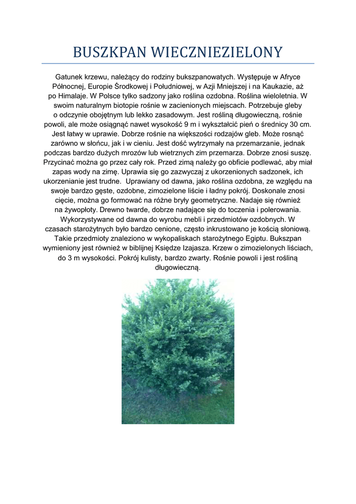 BUSZKPAN WIECZNIEZIELONY Gatunek krzewu, należący do rodziny bukszpanowatych. Występuje w Afryce Północnej, Europie Środkowej i Południowej, w Azji Mniejszej i na Kaukazie, aż po Himalaje. W Polsce tylko sadzony jako roślina ozdobna. Roślina wieloletnia. W swoim naturalnym biotopie rośnie w zacienionych miejscach. Potrzebuje gleby o odczynie obojętnym lub lekko zasadowym. Jest rośliną długowieczną, rośnie powoli, ale może osiągnąć nawet wysokość 9 m i wykształcić pień o średnicy 30 cm. Jest łatwy w uprawie. Dobrze rośnie na większości rodzajów gleb. Może rosnąć zarówno w słońcu, jak i w cieniu. Jest dość wytrzymały na przemarzanie, jednak podczas bardzo dużych mrozów lub wietrznych zim przemarza. Dobrze znosi suszę. Przycinać można go przez cały rok. Przed zimą należy go obficie podlewać, aby miał zapas wody na zimę. Uprawia się go zazwyczaj z ukorzenionych sadzonek, ich ukorzenianie jest trudne. Uprawiany od dawna, jako roślina ozdobna, ze względu na swoje bardzo gęste, ozdobne, zimozielone liście i ładny pokrój. Doskonale znosi cięcie, można go formować na różne bryły geometryczne. Nadaje się również na żywopłoty. Drewno twarde, dobrze nadające się do toczenia i polerowania. Wykorzystywane od dawna do wyrobu mebli i przedmiotów ozdobnych. W czasach starożytnych było bardzo cenione, często inkrustowano je kością słoniową. Takie przedmioty znaleziono w wykopaliskach starożytnego Egiptu. Bukszpan wymieniony jest również w biblijnej Księdze Izajasza. Krzew o zimozielonych liściach, do 3 m wysokości. Pokrój kulisty, bardzo zwarty. Rośnie powoli i jest rośliną długowieczną.