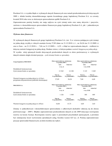 Prochem S.A. w wyniku błędu w wybranych danych finansowych oraz notach przekształceniowych dotyczących 2009 r. składa korektę skonsolidowanego raportu kwartalnego grupy kapitałowej Prochem S.A. za czwarty kwartał 2010 roku wraz ze skróconym sprawozdaniem spółki Prochem S.A. Zaprezentowane poniżej korekty nie mają wpływu na zysk (stratę) netto oraz sumę aktywów i pasywów, zarówno w skonsolidowanym sprawozdaniu finansowym grupy kapitałowej Prochem S.A. jak i jednostkowym sprawozdaniu Prochem S.A. Wybrane dane finansowe W wybranych danych finansowych grupy kapitałowej Prochem S.A. (str. 3) w wierszu podającym zysk (stratę) na jedną akcję zwykłą w złotych usunięto kwotę 27,89 (dane na 31.12.2010 r.) i , na 26,26 (na 31.12.2009 r.) oraz w Euro – na 31.12.2010 r. – 7,04, na 31.12.2009 r. – 6,39 - o błąd we wprowadzaniu danych – wielkości te dotyczą wartości księgowej na jedną akcję. Dodano wiersz, w którym podano wartość księgową na jedną akcję. W wyniku niżej opisanych korekt dotyczących przekształceń danych za okres porównawczy w wybranych danych zmianie uległa również pozycja – zysk (strata) brutto ze sprzedaży. Grupa Kapitałowa PROCHEM Okres sprawozdawczy zakończony 31 grudnia 2009 r. było Okres sprawozdawczy zakończony 31 grudnia 2009 r. winno być było w tys. zł Działalność kontynuowana Zysk (strata) brutto ze sprzedaży Wartość księgowa na jedną akcję (w zł./Eur) – przypisana akcjonariuszom jednostki dominującej PROCHEM S.A. 13 565 w tys. EUR 14 188 Stan na 31 grudnia2010 r. Stan na 31 grudnia2009 r 27,89 26,26 Okres sprawozdawczy zakończony 31 grudnia 2009 r. było winno być w tys. zł Działalność kontynuowana Zysk (strata) brutto ze sprzedaży 1 326 Stan na 31 grudnia2010 r. Wartość księgowa na jedną akcję (w zł/Eur) 16,04 winno być 3 125 3 269 Stan na Stan na 31 grudnia2010 r. 31 grudnia2009 r. 7,04 6,40 Okres sprawozdawczy zakończony 31 grudnia 2009 r. było winno być w tys. EUR 1 949 Stan na 31 grudnia2009 r 15,75 305 449 Stan na Stan na 31 grudnia2010 r. 31 grudnia2009 r. 4,05 3,83 Zmiany w jednostkowym i skonsolidowanym sprawozdaniu z całkowitych dochodów odnoszą się do okresu porównawczego – 2009 r. Błędnie zaprezentowano przekształcenie danych za rok 2009 dotyczące rozwiązania rezerwy na koszty licencji. Rozwiązanie rezerwy ujęto w pozostałych przychodach operacyjnych, a powinien być zmniejszony koszt wytworzenia sprzedanych usług. Korekta wynosi 623 tys. zł. Poniżej zaprezentowano pozycje sprawozdań finansowych, na które korekta ma wpływ. Skonsolidowane sprawozdanie z całkowitych dochodów Koszt sprzedanych usług, towarów i materiałów, w tym: Koszt wytworzenia sprzedanych produktów Zysk (strata) brutto ze sprzedaży Pozostałe przychody Czwarty kwartał 2009 r. od 01.10.2009 r. do 31.12.2009 r. (przekształcone) było Czwarty kwartał 2009 r. od 01.10.2009 r. do 31.12.2009 r. (przekształcone) winno być Okres zakończony 31.12.2009 r. (przekształcone) było Okres zakończony 31.12.2009 r. (przekształcone) winno być 27 204 26 581 157 023 156 400 26 175 2 645 6 627 25 552 3 268 6 004 150 430 13 565 11 177 149 807 14 188 10 554 Wprowadzenie korekty do sprawozdania spowodowało również zmianę w udziale w zysku (stracie) netto oraz całkowitych dochodach akcjonariuszy jednostki dominującej oraz udziałów niekontrolujących. Skonsolidowane sprawozdanie z całkowitych dochodów Całkowite dochody ogółem Całkowite dochody netto przypadające na: Akcjonariuszy jednostki dominującej Udziały niekontrolujące Razem Całkowity dochód na jedną akcję zwykłą (w zł/gr. na jedną akcję) – przypadający na właścicieli jednostki dominującej z działalności kontynuowanej Czwarty kwartał 2009 r. od 01.10.2009 r. do 31.12.2009 r. (przekształcone) było Czwarty kwartał 2009 r. od 01.10.2009 r. do 31.12.2009 r. (przekształcone) winno być Okres zakończony 31.12.2009 r. (przekształcone) było Okres zakończony 31.12.2009 r. (przekształcone) winno być 82 82 0 980 -2 283 2 283 0 -1 846 1 928 82 -2 283 2 283 0 -1 303 2 283 980 0,02 -0,47 0,00 -0,33 13 533 12 910 104 382 103 759 13 529 -1 428 603 12 906 -805 -20 102 688 1 326 2 538 102 065 1 949 1 915 Jednostkowe sprawozdanie z całkowitych dochodów Koszt sprzedanych usług, towarów i materiałów, w tym: Koszt wytworzenia sprzedanych produktów Zysk (strata) brutto ze sprzedaży Pozostałe przychody Zmiana prezentacji dotyczy również noty segmenty operacyjne grupy kapitałowej Prochem S.A i Prochem S.A. za rok 2009. Korekta polega na przesunięciu z zysku (straty) z pozostałej działalności operacyjnej do zysk (strata) segmentu generalnego wykonawstwa kwoty 1 467 tys. zł. Grupa kapitałowa Prochem S.A. Generalne wykonawstwo było Generalne wykonawstwo winno być -10 871 -11 060 Razem było Razem winno być -12 248 -4 142 7 602 -5 609 9 069 -12 527 -7 243 -111 -8 710 1 356 Wynik Zysk (strata) segmentu Zysk (strata) z pozostałej działalności operacyjnej Prochem S.A. Wynik Zysk (strata) segmentu Zysk (strata) z pozostałej działalności operacyjnej Skorygowany również został błąd powstały przy wprowadzaniu danych do jednostkowego sprawozdania z sytuacji finansowej na dzień 31 grudnia 2010 r. pozycja -zobowiązania, razem winno być 42 539.