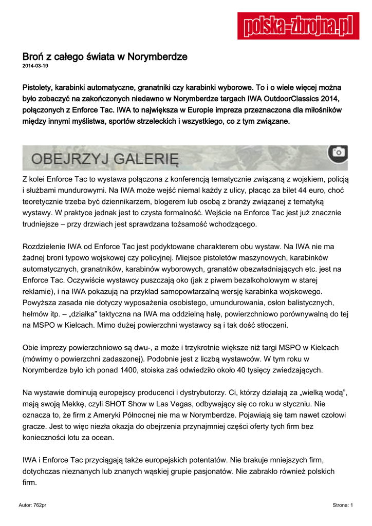 Broń z całego świata w Norymberdze 2014-03-19 Pistolety, karabinki automatyczne, granatniki czy karabinki wyborowe. To i o wiele więcej można było zobaczyć na zakończonych niedawno w Norymberdze targach IWA OutdoorClassics 2014, połączonych z Enforce Tac. IWA to największa w Europie impreza przeznaczona dla miłośników między innymi myślistwa, sportów strzeleckich i wszystkiego, co z tym związane. Z kolei Enforce Tac to wystawa połączona z konferencją tematycznie związaną z wojskiem, policją i służbami mundurowymi. Na IWA może wejść niemal każdy z ulicy, płacąc za bilet 44 euro, choć teoretycznie trzeba być dziennikarzem, blogerem lub osobą z branży związanej z tematyką wystawy. W praktyce jednak jest to czysta formalność. Wejście na Enforce Tac jest już znacznie trudniejsze – przy drzwiach jest sprawdzana tożsamość wchodzącego. Rozdzielenie IWA od Enforce Tac jest podyktowane charakterem obu wystaw. Na IWA nie ma żadnej broni typowo wojskowej czy policyjnej. Miejsce pistoletów maszynowych, karabinków automatycznych, granatników, karabinów wyborowych, granatów obezwładniających etc. jest na Enforce Tac. Oczywiście wystawcy puszczają oko (jak z piwem bezalkoholowym w starej reklamie), i na IWA pokazują na przykład samopowtarzalną wersję karabinka wojskowego. Powyższa zasada nie dotyczy wyposażenia osobistego, umundurowania, osłon balistycznych, hełmów itp. – „działka” taktyczna na IWA ma oddzielną halę, powierzchniowo porównywalną do tej na MSPO w Kielcach. Mimo dużej powierzchni wystawcy są i tak dość stłoczeni. Obie imprezy powierzchniowo są dwu-, a może i trzykrotnie większe niż targi MSPO w Kielcach (mówimy o powierzchni zadaszonej). Podobnie jest z liczbą wystawców. W tym roku w Norymberdze było ich ponad 1400, stoiska zaś odwiedziło około 40 tysięcy zwiedzających. Na wystawie dominują europejscy producenci i dystrybutorzy. Ci, którzy działają za „wielką wodą”, mają swoją Mekkę, czyli SHOT Show w Las Vegas, odbywający się co roku w styczniu. Nie oznacza to, że firm z Ameryki Północnej nie ma w Norymberdze. Pojawiają się tam nawet czołowi gracze. Jest to więc niezła okazja do obejrzenia przynajmniej części oferty tych firm bez konieczności lotu za ocean. IWA i Enforce Tac przyciągają także europejskich potentatów. Nie brakuje mniejszych firm, dotychczas nieznanych lub znanych wąskiej grupie pasjonatów. Nie zabrakło również polskich firm. Autor: 762pr Strona: 1 Znane powiedzenie mówi, że jeden obraz wart tysiąca słów. Zapraszamy więc do obejrzenia galerii zdjęć z targów. Niestety, przy takiej mnogości wystawców i sprzętu nie jest możliwe sfotografowanie wszystkich interesujących eksponatów. Autor: 762pr Strona: 2