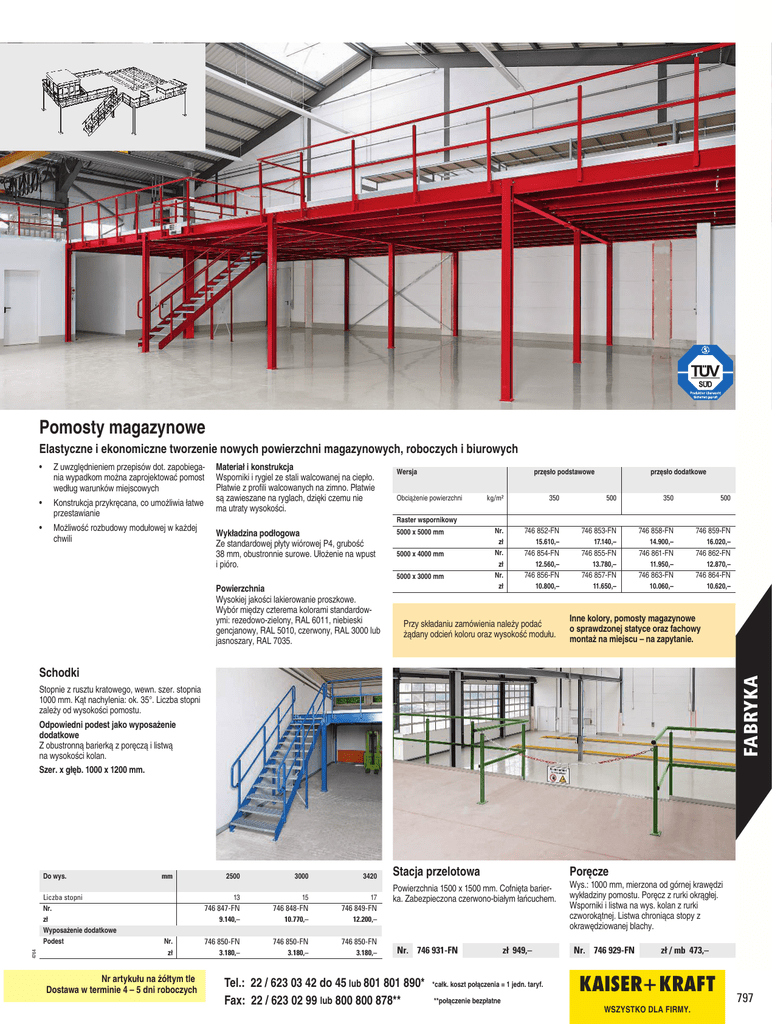 Pomosty magazynowe Elastyczne i ekonomiczne tworzenie nowych powierzchni magazynowych, roboczych i biurowych • Z uwzględnieniem przepisów dot. zapobiegania wypadkom można zaprojektować pomost według warunków miejscowych • Konstrukcja przykręcana, co umożliwia łatwe przestawianie • Możliwość rozbudowy modułowej w każdej chwili Materiał i konstrukcja Wsporniki i rygiel ze stali walcowanej na ciepło. Płatwie z profili walcowanych na zimno. Płatwie są zawieszane na ryglach, dzięki czemu nie ma utraty wysokości. Wersja przęsło podstawowe Obciążenie powierzchni przęsło dodatkowe kg/m² 350 500 350 500 Nr. zł Nr. zł Nr. zł 746 852-FN 746 853-FN 746 858-FN 746 859-FN 15.610,– 17.140,– 14.900,– 16.020,– 746 854-FN 746 855-FN 746 861-FN 746 862-FN Raster wspornikowy Wykładzina podłogowa Ze standardowej płyty wiórowej P4, grubość 38 mm, obustronnie surowe. Ułożenie na wpust i pióro. 5000 x 5000 mm 5000 x 4000 mm 5000 x 3000 mm Powierzchnia Wysokiej jakości lakierowanie proszkowe. Wybór między czterema kolorami standardowymi: rezedowo-zielony, RAL 6011, niebieski gencjanowy, RAL 5010, czerwony, RAL 3000 lub jasnoszary, RAL 7035. 12.560,– 13.780,– 11.950,– 12.870,– 746 856-FN 746 857-FN 746 863-FN 746 864-FN 10.800,– 11.650,– 10.060,– 10.620,– Przy składaniu zamówienia należy podać żądany odcień koloru oraz wysokość modułu. Inne kolory, pomosty magazynowe o sprawdzonej statyce oraz fachowy montaż na miejscu – na zapytanie. FABRYKA BETRIEB Schodki Stopnie z rusztu kratowego, wewn. szer. stopnia 1000 mm. Kąt nachylenia: ok. 35°. Liczba stopni zależy od wysokości pomostu. Odpowiedni podest jako wyposażenie dodatkowe Z obustronną barierką z poręczą i listwą na wysokości kolan. Szer. x głęb. 1000 x 1200 mm. Do wys. 4764 Liczba stopni Nr. zł Wyposażenie dodatkowe Podest mm Nr. zł Nr artykułu na żółtym tle Dostawa w terminie 4 – 5 dni roboczych 2500 3000 3420 13 15 17 746 847-FN 746 848-FN 746 849-FN 9.140,– 10.770,– 12.200,– 746 850-FN 746 850-FN 746 850-FN 3.180,– 3.180,– 3.180,– Stacja przelotowa Poręcze Powierzchnia 1500 x 1500 mm. Cofnięta barierka. Zabezpieczona czerwono-białym łańcuchem. Nr. 746 931-FN Tel.: 22 / 623 03 42 do 45 lub 801 801 890* Fax: 22 / 623 02 99 lub 800 800 878** zł 949,– *całk. koszt połączenia = 1 jedn. taryf. **połączenie bezpłatne Wys.: 1000 mm, mierzona od górnej krawędzi wykładziny pomostu. Poręcz z rurki okrągłej. Wsporniki i listwa na wys. kolan z rurki czworokątnej. Listwa chroniąca stopy z okrawędziowanej blachy. Nr. 746 929-FN zł / mb 473,– KAISER + KRAFT WSZYSTKO DLA FIRMY. 797