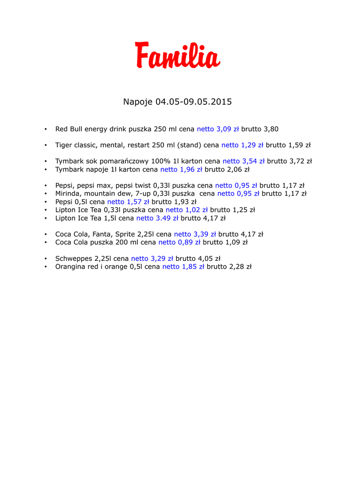 Familia Napoje 04.05-09.05.2015 • Red Bull energy drink puszka 250 ml cena netto 3,09 zł brutto 3,80 • Tiger classic, mental, restart 250 ml (stand) cena netto 1,29 zł brutto 1,59 zł • • Tymbark sok pomarańczowy 100% 1l karton cena netto 3,54 zł brutto 3,72 zł Tymbark napoje 1l karton cena netto 1,96 zł brutto 2,06 zł • • • • • Pepsi, pepsi max, pepsi twist 0,33l puszka cena netto 0,95 zł brutto 1,17 zł Mirinda, mountain dew, 7-up 0,33l puszka cena netto 0,95 zł brutto 1,17 zł Pepsi 0,5l cena netto 1,57 zł brutto 1,93 zł Lipton Ice Tea 0,33l puszka cena netto 1,02 zł brutto 1,25 zł Lipton Ice Tea 1,5l cena netto 3.49 zł brutto 4,17 zł • • Coca Cola, Fanta, Sprite 2,25l cena netto 3,39 zł brutto 4,17 zł Coca Cola puszka 200 ml cena netto 0,89 zł brutto 1,09 zł • • Schweppes 2,25l cena netto 3,29 zł brutto 4,05 zł Orangina red i orange 0,5l cena netto 1,85 zł brutto 2,28 zł