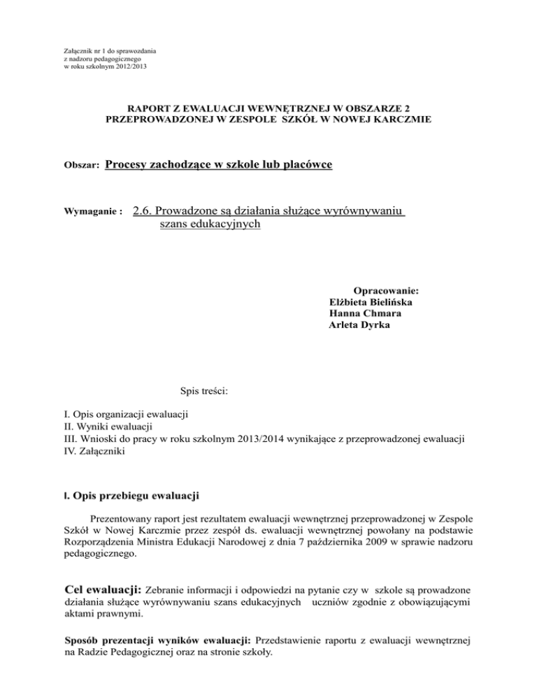 Załącznik nr 1 do sprawozdania z nadzoru pedagogicznego w roku szkolnym 2012/2013 RAPORT Z EWALUACJI WEWNĘTRZNEJ W OBSZARZE 2 PRZEPROWADZONEJ W ZESPOLE SZKÓŁ W NOWEJ KARCZMIE Obszar: Procesy zachodzące w szkole lub placówce Wymaganie : 2.6. Prowadzone są działania służące wyrównywaniu szans edukacyjnych Opracowanie: Elżbieta Bielińska Hanna Chmara Arleta Dyrka Spis treści: I. Opis organizacji ewaluacji II. Wyniki ewaluacji III. Wnioski do pracy w roku szkolnym 2013/2014 wynikające z przeprowadzonej ewaluacji IV. Załączniki I. Opis przebiegu ewaluacji Prezentowany raport jest rezultatem ewaluacji wewnętrznej przeprowadzonej w Zespole Szkół w Nowej Karczmie przez zespół ds. ewaluacji wewnętrznej powołany na podstawie Rozporządzenia Ministra Edukacji Narodowej z dnia 7 października 2009 w sprawie nadzoru pedagogicznego. Cel ewaluacji: Zebranie informacji i odpowiedzi na pytanie czy w szkole są prowadzone działania służące wyrównywaniu szans edukacyjnych aktami prawnymi. uczniów zgodnie z obowiązującymi Sposób prezentacji wyników ewaluacji: Przedstawienie raportu z ewaluacji wewnętrznej na Radzie Pedagogicznej oraz na stronie szkoły. Pytania kluczowe: - „Czy oferta edukacyjna naszej szkoły jest dostosowana do potrzeb i możliwości uczniów?” - „Czy uczniowie osiągają sukcesy edukacyjne?” - „Czy w szkole są prowadzone działania zwiększające szanse edukacyjne uczniów?” - „Czy na lekcjach uwzględnia się indywidualizację procesu edukacyjnego?” KRYTERIA EWALUACJI a) zgodność z dokumentacją wewnątrzszkolną (statut, program wychowawczy) b) wdrażanie działań zwiększających szanse edukacyjne c) skuteczność prowadzonych działań d) powszechność i dostępność e) zgodność z potrzebami uczniów i rodziców f) analiza i diagnoza wyników uczniów W trakcie ewaluacji zbierano informacje pochodzące z wielu źródeł np.: ankiety, arkusze diagnostyczne, kwestionariusze dla uczniów, rodziców, nauczycieli, obserwacje, analizy dokumentów. Dzięki zastosowaniu różnorodnych metod badawczych wyniki ewaluacji wewnętrznej charakteryzują się wysokim stopniem wiarygodności. Badania realizowane były w okresach od XI 2012 do V 2013 przez powołany zespół. Na podstawie przeprowadzonych ankiet, wywiadu i analizy dokumentów można stwierdzić, że nasza szkoła dobrze realizuje zadanie wyrównywania szans edukacyjnych (100% ankietowanych uważa, że szkoła dobrze realizuje zadania wyrównywania szans edukacyjnych ). Jak wynika z analiz na nierówność szans edukacyjnych wpływa w znaczącym stopniu fakt zamieszkiwania naszych uczniów na wsi - nie ułatwia to nabywania pewnych umiejętności, utrudnia kontakt z kulturą (kina, teatry, muzea), TIK ( nie wszyscy maja w domu komputer oraz dostęp do Internetu) czy nauką ( wystawy naukowe, parki techniki typu Exploratorium w Gdyni). 20% mieszkańców naszej gminy korzysta z OPS. Wśród rodzin naszych uczniów 23% nie pracuje zawodowo. Ze względu na niskie dochody w 2012r. 15% uczniów otrzymało stypendia szkolne wypłacane przez jednostki samorządów terytorialnych. OPS w Nowej Karczmie finansuje dożywianie w szkole dla 68% uczniów korzystających z posiłków. Aż 40% dzieci z grupy przedszkolnej i 20 % z klas I-III SP wymaga pomocy logopedycznej. Diagnoza dzieci rozpoczynających naukę szkolną wskazuje na ich słabe przygotowanie do podjęcia nauki w szkole - osiągają one niższe wyniki, wykazują niższe kwalifikacje społeczne i emocjonalne. Powyższe problemy powodują zmniejszenie szans edukacyjnych dzieci wiejskich i znaczne utrudnienie w profesjonalnie prowadzonej stymulacji ich rozwoju. W naszej szkole jesteśmy nastawieni na wspomaganie i ukierunkowanie rozwoju dziecka zgodnie z jego potencjałem i możliwościami rozwojowymi - dzieci zdolne mają możliwość rozwijania swojego potencjału (kółka zainteresowań, konkursy), a dzieci z zaburzeniami rozwojowymi i trudnościami w uczeniu się otrzymują wsparcie w redukcji zaburzeń i braków edukacyjnych ( zajęcia wyrównawcze, rewalidacja, pomoc psychologiczno-pedagogiczna). Brak środków finansowych to następstwo wysokiego bezrobocia.. Wskutek niepowodzeń i trudnych sytuacji życiowych wśród mieszkańców pojawiły się patologie społeczne, które tym bardziej pogarszają sytuację bytową mieszkańców. Innym ważnym problemem jest niska świadomość rodziców o edukacyjnej roli i jej wpływu na rozwój dziecka. Jak wynika z analizy dokumentów, aż 43% uczniów naszej szkoły uczestniczy w dodatkowych zajęciach dydaktyczno -wyrównawcze oraz specjalistycznych służących wyrównaniu dysproporcji edukacyjnych. Wielu z naszych uczniów uczęszcza na kilka zajęć dodatkowych. Uczniowie posiadają wiedzę na temat różnego typu zajęć pozalekcyjnych prowadzonych na terenie szkoły. Uczniowie mają ograniczoną możliwość rozwijania swoich zainteresowań poprzez ograniczenia czasowe związane z odwozami – prawie wszystkie zajęcia odbywają się do godziny 14.30 ( uczniowie więc muszą dokonywać wyboru między zajęciami, którymi są zainteresowani). To czasowe pokrywanie się tych zajęć uniemożliwia uczestniczenie w nich uczniom. Dlatego należy podjąć starania, aby czas zajęć i odwozów był bardziej dopasowany do potrzeb i możliwości uczniów. Uczniowie mają możliwość przygotowywania się do konkursów, olimpiad, zawodów. Działania naszego zespołu były ukierunkowane na sprawdzenie jak w naszym środowisku szkolnym wygląda wyrównywanie szans edukacyjnych. Jak ten problem widzą róże strony zainteresowane sukcesem naszych dzieci : rodzice i nauczyciele. Zdaniem tych dwóch grup wyrównywanie szans edukacyjnych możliwe jest dzięki: kołom zainteresowań zajęciom wyrównawczym projektom edukacyjnym. Mniejsze znaczenie odgrywają wycieczki i stypendia naukowe. Natomiast pomoc materialna skierowana do uczniów nie ma większego wpływu na wyrównywanie szans edukac