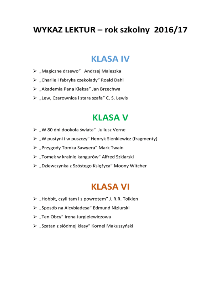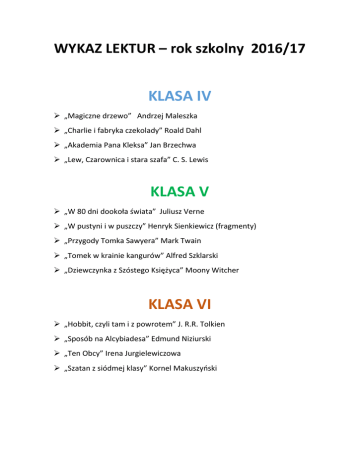 WYKAZ LEKTUR – rok szkolny 2016/17 KLASA IV „Magiczne drzewo” Andrzej Maleszka „Charlie i fabryka czekolady” Roald Dahl „Akademia Pana Kleksa” Jan Brzechwa „Lew, Czarownica i stara szafa” C. S. Lewis KLASA V „W 80 dni dookoła świata” Juliusz Verne „W pustyni i w puszczy” Henryk Sienkiewicz (fragmenty) „Przygody Tomka Sawyera” Mark Twain „Tomek w krainie kangurów” Alfred Szklarski „Dziewczynka z Szóstego Księżyca” Moony Witcher KLASA VI „Hobbit, czyli tam i z powrotem” J. R.R. Tolkien „Sposób na Alcybiadesa” Edmund Niziurski „Ten Obcy” Irena Jurgielewiczowa „Szatan z siódmej klasy” Kornel Makuszyński