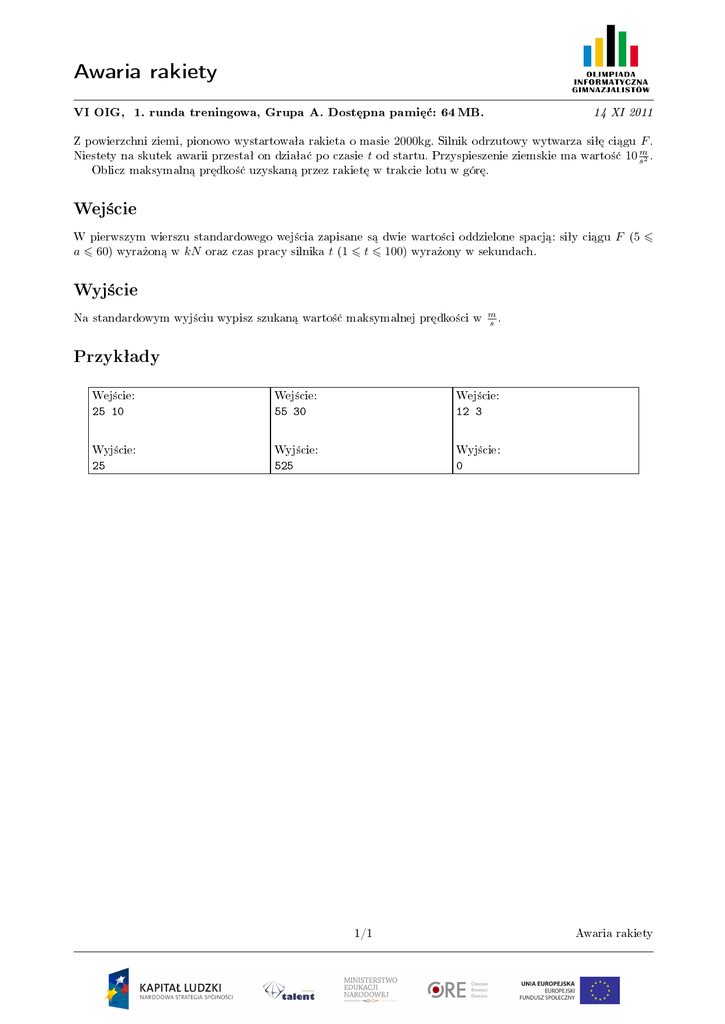 Awaria rakiety VI OIG, 14 XI 2011 1. runda treningowa, Grupa A. Dost¦pna pami¦¢: 64 MB. Z powierzchni ziemi, pionowo wystartowaªa rakieta o masie Niestety na skutek awarii przestaª on dziaªa¢ po czasie t 2000kg. Silnik odrzutowy wytwarza siª¦ ci¡gu od startu. Przyspieszenie ziemskie ma warto±¢ Oblicz maksymaln¡ pr¦dko±¢ uzyskan¡ przez rakiet¦ w trakcie lotu w gór¦. F. 10 sm2 . Wej±cie W pierwszym wierszu standardowego wej±cia zapisane s¡ dwie warto±ci oddzielone spacj¡: siªy ci¡gu a 6 60) wyra»on¡ w kN oraz czas pracy silnika t (1 6 t 6 100) F (5 6 wyra»ony w sekundach. Wyj±cie m Na standardowym wyj±ciu wypisz szukan¡ warto±¢ maksymalnej pr¦dko±ci w s . Przykªady Wej±cie: Wej±cie: Wej±cie: 25 10 55 30 12 3 Wyj±cie: Wyj±cie: Wyj±cie: 25 525 0 1/1 Awaria rakiety