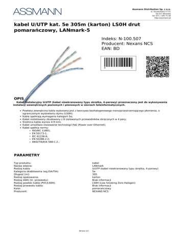 Assmann Distribution Sp. z o.o. ul. Szczecińska 17-21 54-517 Wrocław tel: 071 / 326 71 40 http://assmann.pl kabel U/UTP kat. 5e 305m (karton) LS0H drut pomarańczowy, LANmark-5 Indeks: N-100.507 Producent: Nexans NCS EAN: BD B D OPIS Kabel instalacyjny U/UTP (kabel nieekranowany typu skrętka, 4-parowy) przeznaczony jest do wykonywania instalacji wewnętrznych poziomych i pionowych w sieciach teleinformatycznych. Powłoka zewnętrzna kabla wykonana jest z tworzywa bezhalogenowego nierozprzestrzeniającego płomienia, o ograniczonym wydzielaniu dymu (LS0H); Kable spełniają wymagania kategorii 5e; Kabel nieżelowany zbudowany z 8 izolowanych przewodników skręconych w 4 pary; Średnica kabla wynosi 4.9 mm; Kabel umożliwia stosowanie technologii PoE (Power over Ethernet); Kabel spełnia normy: ISO/IEC 11801; EN 50173-1; IEC 61156-6; EN 50288-2-2; ANSI/TIA/EIA 568-C.2.; PARAMETRY Typ produktu: Nazwa własna: Rodzaj kabla: Kategoria okablowania (wg EIA/TIA): Długość [m]: Rodzaj opakowania: Rodzaj AWG (śr. przewodu): Rodzaj powłoki kabla (PVC/LS0H): Rodzaj przewodu kabla: Kolor: Producent: kabel LANmark U/UTP (kabel nieekranowany typu skrętka, 4-parowy) 5e 305 karton Brak informacji LS0H (Low Smoking Zero Halogen) Brak informacji pomarańczowy NEXANS NCS Strona 1/1 Powered by TCPDF (www.tcpdf.org)