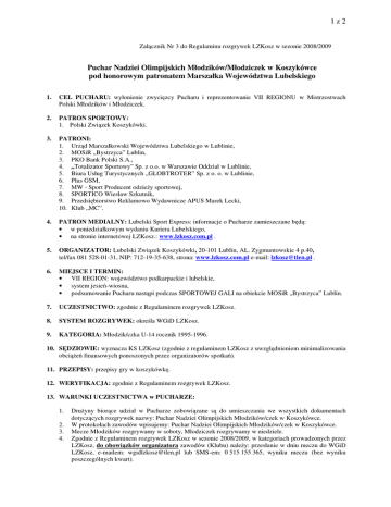 1z2 Załącznik Nr 3 do Regulaminu rozgrywek LZKosz w sezonie 2008/2009 Puchar Nadziei Olimpijskich Młodzików/Młodziczek w Koszykówce pod honorowym patronatem Marszałka Województwa Lubelskiego 1. CEL PUCHARU: wyłonienie zwycięzcy Pucharu i reprezentowanie VII REGIONU w Mistrzostwach Polski Młodzików i Młodziczek. 2. PATRON SPORTOWY: 1. Polski Związek Koszykówki. 3. PATRONI: 1. Urząd Marszałkowski Województwa Lubelskiego w Lublinie, 2. MOSiR „Bystrzyca” Lublin, 3. PKO Bank Polski S.A., 4. „Totalizator Sportowy” Sp. z o.o. w Warszawie Oddział w Lublinie, 5. Biura Usług Turystycznych „GLOBTROTER” Sp. z o. o. w Lublinie, 6. Plus GSM, 7. MW - Sport Producent odzieży sportowej, 8. SPORTICO Wiesław Szkutnik, 9. Przedsiębiorstwo Reklamowo Wydawnicze APUS Marek Lecki, 10. Klub „MC”. 4. PATRON MEDIALNY: Lubelski Sport Express: informacje o Pucharze zamieszczane będą: • w poniedziałkowym wydaniu Kuriera Lubelskiego, • na stronie internetowej LZKosz.: www.lzkosz.com.pl . 5. ORGANIZATOR: Lubelski Związek Koszykówki, 20-101 Lublin, AL. Zygmuntowskie 4 p.40, tel/fax 081 528-01-31, NIP: 712-19-35-638, strona: www.lzkosz.com.pl e-mail: [email protected] . 6. MIEJSCE I TERMIN: • VII REGION: województwo podkarpackie i lubelskie, • system jesień-wiosna, • podsumowanie Pucharu nastąpi podczas SPORTOWEJ GALI na obiekcie MOSiR „Bystrzyca” Lublin. 7. UCZESTNICTWO: zgodnie z Regulaminem rozgrywek LZKosz. 8. SYSTEM ROZGRYWEK: określa WGiD LZKosz. 9. KATEGORIA: Młodzik/czka U-14 rocznik 1995-1996. 10. SĘDZIOWIE: wyznacza KS LZKosz (zgodnie z regulaminem LZKosz z uwzględnieniem minimalizowania obciążeń finansowych ponoszonych przez organizatorów spotkań). 11. PRZEPISY: przepisy gry w koszykówkę. 12. WERYFIKACJA: zgodnie z Regulaminem rozgrywek LZKosz. 13. WARUNKI UCZESTNICTWA w PUCHARZE: 1. 2. 3. 4. Drużyny biorące udział w Pucharze zobowiązane są do umieszczania we wszystkich dokumentach dotyczących rozgrywek nazwy: Puchar Nadziei Olimpijskich Młodzików/czek w Koszykówce. W protokołach zawodów wpisujemy: Puchar Nadziei Olimpijskich Młodzików/czek w Koszykówce. Mecze Młodzików rozgrywamy w soboty, Młodziczek rozgrywamy w niedziele. Zgodnie z Regulaminem rozgrywek LZKosz w sezonie 2008/2009, w kategoriach prowadzonych przez LZKosz, do obowiązków organizatora zawodów (Klubu) należy: przesłanie w dniu meczu do WGiD LZKosz, e-mailem: [email protected] lub SMS-em: 0 515 155 365, wyniku meczu (bez wyniku poszczególnych kwart). 2z2 • • • • Informacja taka powinna zawierać: kategoria rozgrywek (MM lub MK), numer meczu (kolejny zgodnie z terminarzem), wynik końcowy (np. 86:85), nazwisko trenera lub osoby przesyłającej wiadomość (np. Kowalski). WZÓR wiadomości: MM lub MK, 2, 86:85, Kowalski. 5. • • • 6. Lp. Przekazywanie informacji do prasy: kontakt z redakcją LSE: redaktor Tomasz Biaduń tel. 609 366 744, [email protected] , redakcja bierze na siebie ciężar pozyskiwania informacji, dlatego gospodarz meczu musi posiadać podstawowe informacje dotyczące meczu jak: wynik końcowy, wynik poszczególnych kwart, imiona i nazwiska zawodników punktujących w meczu, ciekawostki sportowe mogące być wykorzystane w komentarzu redakcyjnym kolejki, prosimy trenerów i działaczy o udzielanie wszelkiej możliwej pomocy redakcji LSE, Zgodnie z umową z Urzędem Marszałkowskim i Ustawą o rachunkowości i finansach publicznych, informuję, że faktura/rachunek musi być złożona w ciągu 14 dni od dnia zakończenia zadania. Przyjmujemy cykl miesięczny rozliczeń. Tak więc wszystkie faktury/rachunki dla LZKosz muszą mieć załączoną specyfikację (w rozbiciu na poszczególne pozycje) oraz zestawienie faktur wg układu: Numer dokumentu księgowego • • • • • 7. Data Nazwa wydatku Kwota W tym ze środków LZKosz każda faktura/rachunek musi być dokładnie opisana pod względem merytorycznym przez przedstawiciela Klubu z uwzględnieniem daty i miejsca rozgrywania meczu, nazwy drużyny przeciwnej itp., osoba upoważniona do rozliczeń z LZKosz informuje wcześniej o swoim przyjeździe i kwocie zwrotu wydatków w formie gotówki, istnieje możliwość dokonania przelewu na Klub zgodnie z wystawioną fakturą/rachunkiem, błędnie lub nie opisane faktury/rachunki nie będą przyjmowane do realizacji, nie będą uwzględniane tzw. „noty księgowe”. Refundacja kosztów udziału w Pucharze i przyznanie nagród dotyczy tylko drużyn Województwa Lubelskiego. Zasady rozliczenia kosztów uczestnictwa Pozycje 1 obsługa techniczna 2 obsługa medyczna 3 napoje 4 nagrody Kwota 100,00 zł na mecz u siebie 80,00 zł na mecz u siebie 20,00 zł na mecz u siebie puchar i dyplom statuetki + nagrody rzeczowe 500,00 zł nagroda finansowa Osoby • porządkowi, spiker zawodów, biuro zawodów, statystyk, • lekarz lub pielęgniarka, • I-III miejsce, • król strzelców + najlepsi zawodnicy z 3 pierwszych drużyn wytypowani przez trenerów tych drużyn, • trener (którego drużyna reprezentowała Województwo Lubelskie w najwyższej fazie rozgrywek centralnych w tej kategorii). 14. Kluby zobowiązane są do umieszczania na meczach Pucharu w widocznym miejscu baneru Urzędu Marszałkowskiego oraz do udokumentowania tego faktu (zdjęcia z dowolnego meczu u siebie) i przesłania zdjęć do 30 listopada na adres LZKosz. 15. Koszty będą refundowane klubom niezalegającym z opłatami i tylko do wyczerpania środków.