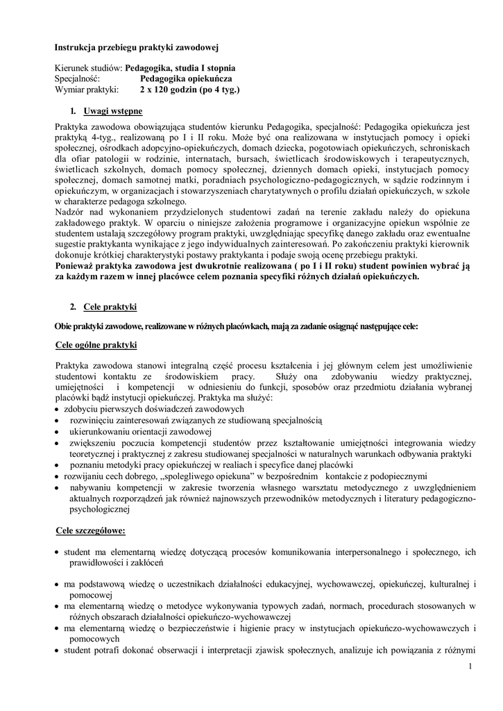 Instrukcja przebiegu praktyki zawodowej Kierunek studiów: Pedagogika, studia I stopnia Specjalność: Pedagogika opiekuńcza Wymiar praktyki: 2 x 120 godzin (po 4 tyg.) 1. Uwagi wstępne Praktyka zawodowa obowiązująca studentów kierunku Pedagogika, specjalność: Pedagogika opiekuńcza jest praktyką 4-tyg., realizowaną po I i II roku. Może być ona realizowana w instytucjach pomocy i opieki społecznej, ośrodkach adopcyjno-opiekuńczych, domach dziecka, pogotowiach opiekuńczych, schroniskach dla ofiar patologii w rodzinie, internatach, bursach, świetlicach środowiskowych i terapeutycznych, świetlicach szkolnych, domach pomocy społecznej, dziennych domach opieki, instytucjach pomocy społecznej, domach samotnej matki, poradniach psychologiczno-pedagogicznych, w sądzie rodzinnym i opiekuńczym, w organizacjach i stowarzyszeniach charytatywnych o profilu działań opiekuńczych, w szkole w charakterze pedagoga szkolnego. Nadzór nad wykonaniem przydzielonych studentowi zadań na terenie zakładu należy do opiekuna zakładowego praktyk. W oparciu o niniejsze założenia programowe i organizacyjne opiekun wspólnie ze studentem ustalają szczegółowy program praktyki, uwzględniając specyfikę danego zakładu oraz ewentualne sugestie praktykanta wynikające z jego indywidualnych zainteresowań. Po zakończeniu praktyki kierownik dokonuje krótkiej charakterystyki postawy praktykanta i podaje swoją ocenę przebiegu praktyki. Ponieważ praktyka zawodowa jest dwukrotnie realizowana ( po I i II roku) student powinien wybrać ją za każdym razem w innej placówce celem poznania specyfiki różnych działań opiekuńczych. 2. Cele praktyki Obie praktyki zawodowe, realizowane w różnych placówkach, mają za zadanie osiągnąć następujące cele: Cele ogólne praktyki Praktyka zawodowa stanowi integralną część procesu kształcenia i jej głównym celem jest umożliwienie studentowi kontaktu ze środowiskiem pracy. Służy ona zdobywaniu wiedzy praktycznej, umiejętności i kompetencji w odniesieniu do funkcji, sposobów oraz przedmiotu działania wybranej placówki bądź instytucji opiekuńczej. Praktyka ma służyć: zdobyciu pierwszych doświadczeń zawodowych rozwinięciu zainteresowań związanych ze studiowaną specjalnością ukierunkowaniu orientacji zawodowej zwiększeniu poczucia kompetencji studentów przez kształtowanie umiejętności integrowania wiedzy teoretycznej i praktycznej z zakresu studiowanej specjalności w naturalnych warunkach odbywania praktyki poznaniu metodyki pracy opiekuńczej w realiach i specyfice danej placówki rozwijaniu cech dobrego, „spolegliwego opiekuna” w bezpośrednim kontakcie z podopiecznymi nabywaniu kompetencji w zakresie tworzenia własnego warsztatu metodycznego z uwzględnieniem aktualnych rozporządzeń jak również najnowszych przewodników metodycznych i literatury pedagogicznopsychologicznej Cele szczegółowe: student ma elementarną wiedzę dotyczącą procesów komunikowania interpersonalnego i społecznego, ich prawidłowości i zakłóceń ma podstawową wiedzę o uczestnikach działalności edukacyjnej, wychowawczej, opiekuńczej, kulturalnej i pomocowej ma elementarną wiedzę o metodyce wykonywania typowych zadań, normach, procedurach stosowanych w różnych obszarach działalności opiekuńczo-wychowawczej ma elementarną wiedzę o bezpieczeństwie i higienie pracy w instytucjach opiekuńczo-wychowawczych i pomocowych student potrafi dokonać obserwacji i interpretacji zjawisk społecznych, analizuje ich powiązania z różnymi 1 obszarami działalności opiekuńczo-wychowawczej potrafi samodzielnie zdobywać wiedzę i rozwijać swoje profesjonalne umiejętności, korzystając z różnych źródeł (w języku rodzimym i obcym) i nowoczesnych technologii (ICT) potrafi ocenić przydatność typowych metod, procedur i dobrych praktyk do realizacji zadań związanych z różnymi rodzajami działalności opiekuńczo-wychowawczej potrafi stawiać diagnozę i prognozę pedagogiczną dotyczącą konkretnych przypadków znajdujących się w sytuacjach trudnych potrafi animować prace nad rozwojem uczestników procesów pedagogicznych oraz wspierać ich samodzielność w zdobywaniu wiedzy, a także inspirować do działań na rzecz uczenia się przez całe życie odpowiedzialnie przygotowuje się do swojej pracy, projektuje i wykonuje działania pedagogiczne 3. Założenia programowo-organizacyjne Przed przystąpieniem do zajęć praktykant powinien zapoznać się z obowiązującymi przepisami oraz zasadami bezpieczeństwa i higieny pracy. Pierwsze dni praktyki w danym zakładzie pracy student powinien poświęcić na wszechstronne poznanie placówki, jej struktury organizacyjnej, zasad działania oraz organizacji pracy. Pod kierunkiem pracownika student powinien aktywnie uczestniczyć w bieżącej pracy placówki w stopniu i zakresie określonym przez opiekuna praktyki. Student powinien posługiwać się nowoczesnym sprzętem technicznym stosowanym w danej placówce. Student dostosowuje się do organizacji i regulaminu pracy obowiązującego w danej placówce. Student nie ma prawa skracać czasu trwania praktyki. W trakcie trwania praktyki student prowadzi systematycznie Dziennik praktyk, w którym powinna znaleźć odzwierciedlenie jego codzienna praca. Zapisy wykonywanych czynności winny być potwierdzone przez opiekuna studenta. W Dzienniku powinno być zawarte: - potwierdzenie okresu trwania praktyki - opinia i ocena praktyki studenta - sprawozdanie studenta z odbytej praktyki Po zakończeniu praktyki student składa Dziennik wraz z pozostałymi dokumentami u Koordynatora Praktyk Zawodowych. 2