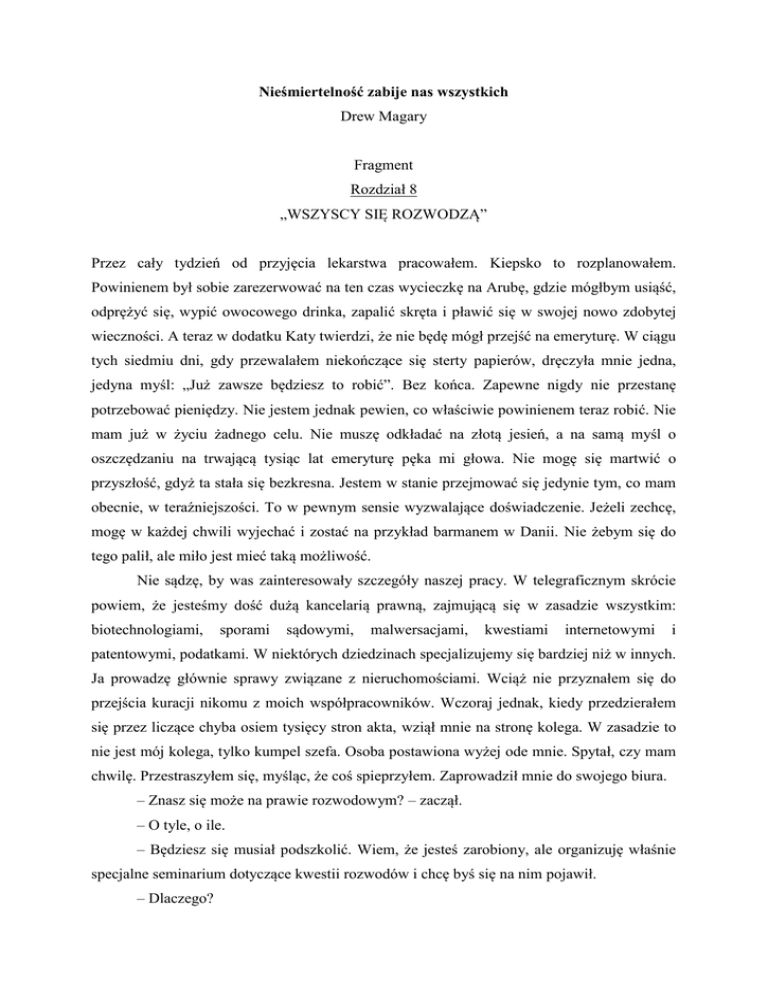 Nieśmiertelność zabije nas wszystkich Drew Magary Fragment Rozdział 8 „WSZYSCY SIĘ ROZWODZĄ” Przez cały tydzień od przyjęcia lekarstwa pracowałem. Kiepsko to rozplanowałem. Powinienem był sobie zarezerwować na ten czas wycieczkę na Arubę, gdzie mógłbym usiąść, odprężyć się, wypić owocowego drinka, zapalić skręta i pławić się w swojej nowo zdobytej wieczności. A teraz w dodatku Katy twierdzi, że nie będę mógł przejść na emeryturę. W ciągu tych siedmiu dni, gdy przewalałem niekończące się sterty papierów, dręczyła mnie jedna, jedyna myśl: „Już zawsze będziesz to robić”. Bez końca. Zapewne nigdy nie przestanę potrzebować pieniędzy. Nie jestem jednak pewien, co właściwie powinienem teraz robić. Nie mam już w życiu żadnego celu. Nie muszę odkładać na złotą jesień, a na samą myśl o oszczędzaniu na trwającą tysiąc lat emeryturę pęka mi głowa. Nie mogę się martwić o przyszłość, gdyż ta stała się bezkresna. Jestem w stanie przejmować się jedynie tym, co mam obecnie, w teraźniejszości. To w pewnym sensie wyzwalające doświadczenie. Jeżeli zechcę, mogę w każdej chwili wyjechać i zostać na przykład barmanem w Danii. Nie żebym się do tego palił, ale miło jest mieć taką możliwość. Nie sądzę, by was zainteresowały szczegóły naszej pracy. W telegraficznym skrócie powiem, że jesteśmy dość dużą kancelarią prawną, zajmującą się w zasadzie wszystkim: biotechnologiami, sporami sądowymi, malwersacjami, kwestiami internetowymi i patentowymi, podatkami. W niektórych dziedzinach specjalizujemy się bardziej niż w innych. Ja prowadzę głównie sprawy związane z nieruchomościami. Wciąż nie przyznałem się do przejścia kuracji nikomu z moich współpracowników. Wczoraj jednak, kiedy przedzierałem się przez liczące chyba osiem tysięcy stron akta, wziął mnie na stronę kolega. W zasadzie to nie jest mój kolega, tylko kumpel szefa. Osoba postawiona wyżej ode mnie. Spytał, czy mam chwilę. Przestraszyłem się, myśląc, że coś spieprzyłem. Zaprowadził mnie do swojego biura. – Znasz się może na prawie rozwodowym? – zaczął. – O tyle, o ile. – Będziesz się musiał podszkolić. Wiem, że jesteś zarobiony, ale organizuję właśnie specjalne seminarium dotyczące kwestii rozwodów i chcę byś się na nim pojawił. – Dlaczego? – Bo wszyscy się rozwodzą – wyjaśnił. – Wszyscy. Każdy bankier i spec od funduszy emerytalnych w tym mieście szuka teraz możliwości ucieczki z małżeństwa. A jeśli nie oni, to ich żony. Obecnie pracuje u nas tylko trzech ludzi znających się na tych sprawach, a to za mało. Musimy się przygotować na podwójną lub nawet potrójną liczbę tego rodzaju zleceń. Mówimy tu o procesach, które mogą się ciągnąć latami. Nie ma jeszcze nawet przepisów dotyczących nowej sytuacji. A wiąże się z tym naprawdę poważna kasa. Uwierz mi, chcesz się tym zająć. Nie chcesz wiecznie tkwić w nieruchomościach. Zresztą za dwadzieścia lat nie miałbyś się czym zajmować. – Jezu. Potem opowiedział mi historię, zasłyszaną od znajomego, prowadzącego sprawy rozwodowe w konkurencyjnej kancelarii. Pewnego dnia pojawił się u niego jakiś bezimienny wielki ciul, przemknął obok sekretarki i wpadł prosto do gabinetu. – Chcę unieważnić swój ślub! – wykrzyknął wielki ciul. – Co? – Prawnik był kompletnie zaskoczony. – Słyszałeś! Chcę unieważnić ślub, i to szybko. – Niemożliwe – odparł adwokat. – Masz dwadzieścia lat stażu. – Związek został zawarty pod wpływem oszustwa. – Jakiego znowu oszustwa? – Oboje wzięliśmy lekarstwo. To zupełnie zmienia przesłanki naszej pierwotnej umowy. – Owszem, ale dwadzieścia lat temu lekarstwa nie było. Żeby doszukać się tu jakiegokolwiek rodzaju oszustwa czy złej woli, kuracja musiałaby być dostępna w momencie podpisania aktu małżeństwa. Zresztą nawet wtedy nie miałbym pojęcia, w jaki sposób coś takiego podciągnąć… – Słuchaj, jestem tradycjonalistą. Wierzę, że jeśli przysięga się przed ołtarzem, trzeba się tego trzymać. Obiecałem, iż spędzę z tą kobietą resztę swojego życia. Ale sądziłem, że będzie to najwyżej siedemdziesiąt lub osiemdziesiąt lat. A teraz mam z nią wytrzymać przez następny tysiąc? Przecież to jakiś absurd! – Wydaje mi się, że nie potrzebujesz unieważnienia, tylko rozwodu. – Rozwodu? Żeby zabrała mi wszystko, co mam? Ta baba od sześciu lat spędza każdy weekend ze swoim osobistym trenerem. A na rozprawie okaże się, że skoro pięć razy puknąłem w firmie kierowniczkę działu, to ja jestem dupkiem. Sam powiedz, gdzie w tym sens? Nie, nie. Chcę unieważnić ślub. Gdyby wtedy istniało lekarstwo, nigdy by do tego małżeństwa nie doszło. – Zrozum, nie mogę w tej sytuacji doprowadzić do unieważnienia. Sprawa jest wiążąca na zawsze. – Ale nikt mi nie mówił, że to zawsze będzie takie długie! – wrzasnął wielki ciul. – Wiem, przysięgałem nie opuścić jej aż do śmierci, ale wtedy śmierć miała nieco inną definicję, nieprawda? – Cóż, rzeczywiście obecnie przepisy stały się raczej niejasne… – wyjąkał prawnik. – To je rozjaśnij. Niech zaświecą jak samo słońce. Wszystko mi jedno. Jeżeli doprowadzisz do unieważnienia małżeństwa, dostaniesz pięć milionów. Pięć! A jeśli ci się nie uda, przeprowadzisz rozwód i wystawisz mi rachunek na sto baniek. Dzięki temu zostanę teoretycznie bez grosza i żona mojej kasy nawet nie powącha. Zapłacę ci piątkę pod stołem, a ty nie będziesz się domagać reszty. – To podpada pod co najmniej trzydzieści siedem paragrafów! – Nie obchodzi mnie. Chcę zatrzymać pieniądze i uwolnić się od tej kobiety. Jeśli będziesz musiał negocjować, daj jej dom. I tak pełno w nim psich kłaków, a od kiedy kupiła szklaną sofę, nie da się tam mieszkać. Aha, i
