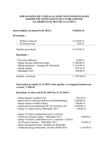 SPRAWOZDANIE Z DZIAŁALNOŚCI FINANSOWEJ RADY RODZICÓW GIMNAZJUM NR 2 W BRANIEWIE ZA OKRES 01.01.2015 DO 31.12.2015 r. Stan środków na dzień 01.01.2015r. 9.548,54 zł Przychody: - Wpłaty rodziców - Zwrot prowizji 4.150,00 zł 5,00 zł Ogółem przychody 4.155,00 zł Rozchody : - Prowizje bankowe 18,00 zł - Zakup sprzętu elektronicznego 3.500,00 zł - Zakup programu i dostępu do iDziennik 1.124,99 zł - Zakup nagród 754,10 zł - Mikołajki 2015 450,00 zł ______________________________________________________________ Ogółem rozchody 5. 847,09 zł Stan konta na dzień 31.12.2015 roku zgodny z wyciągiem bankowym wynosi: 7. 856,45 Rozchody za okres od 01.01.2015 do 31.12.2015r. : - zakup nagród książkowych - darowizna na zakup projektora multimedialnego - zakup routera światłoczułego - zakup telewizora Samsung 40” do świetlicy szk. - zakup 15 wejść do kina Mikołajki 2015 - zakup 15 bonów podarunkowych o wartości 10,00zł do sklepu Foplap - Mikołajki 2015 - zakup 10 bonów podarunkowych o wartości 15,00 zł do Pizzerii Fantazja - Mikołajki 2015 - zakup oprogramowania i dostępu do dziennika Elektronicznego iDziennik do dnia 28/06/2016 754,10 zł 1.500,00 zł 500,00 zł 1.500,00 zł 150,00 zł 150,00 zł 150,00 zł 1.124,99 zł - pobrane przez bank prowizje 18,00 zł _____________________________________________________________ Razem rozchody za okres od 01/01/2015 do 31/12/2015 Sporządziła Agnieszka Bortnik Przewodnicząca RR Gimnazjum nr 2 w Braniewie 5. 847,09 zł
