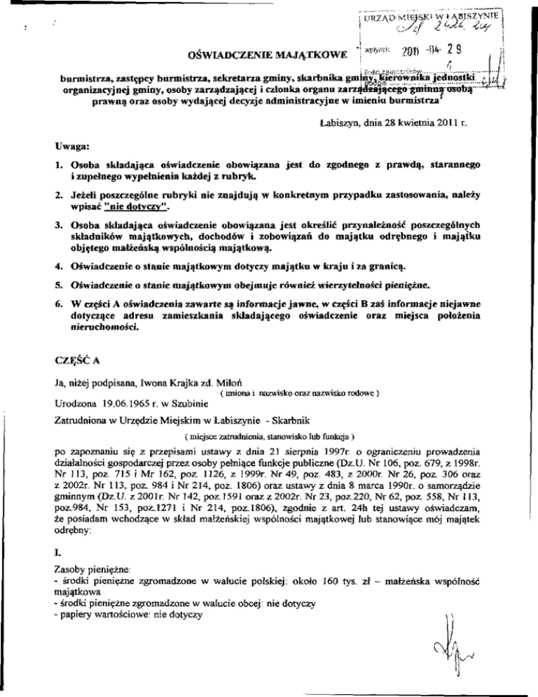 ''URZĄD MTEJSJG. w ł ABISZYNIE " " OŚWIADCZENIE MAJĄTKOWE • > i ^ - burmistrza^ zastępcy burmistrza, sekretarza gminy* skarbnika gminy^Kierównika jednostki. < organizacyjnej gminy, osoby zarządzającej i członka organu zarządzającego gmtmrarusobij prawną oraz osoby wydającej decyzje administracyjne w imieniu burmistrza Łabiszyn, dnia 28 kwietnia 2011 r. Uwaga: 1. Osoba składająca oświadczenie obowiązana jest do zgodnego z prawdą, starannego i zupełnego wypełnienia każdej z rubryk. 2. Jeżeli poszczególne rubryki nie znajdują w konkretnym przypadku zastosowania, należy wpisać "nie dotyczy". 3. Osoba składająca oświadczenie obowiązana jest określić przynależność poszczególnych składników majątkowych, dochodów i zobowiązań do majątku odrębnego i majątku objętego małżeńską wspólnością majątkową. 4. Oświadczenie o stanie majątkowym dotyczy majątku w kraju i za granicą. 5. Oświadczenie o stanie majątkowym obejmuje również wierzytelności pieniężne. 6. W części A oświadczenia zawarte są informacje jawne, w części B zaś informacje niejawne dotyczące adresu zamieszkania składającego oświadczenie oraz miejsca położenia nieruchomości. CZĘŚĆ A Ja, niżej podpisana, Iwona Krajka zd. Miłoń Urodzona 19,06.1965 r, w Szubinie (imiona i nazwisko oraz nazwisko rodowe ) Zatrudniona w Urzędzie Miejskim w Łabiszynie - Skarbnik (miejsce zatrudnienia, stanowisko lub funkcja) po zapoznaniu się z przepisami ustawy z dnia 21 sierpnia 1997r. o ograniczeniu prowadzenia działalności gospodarczej przez osoby pełniące funkcje publiczne (Dz.U. Nr 106, póz. 679, z 1998r. Nr 113, póz. 715 i Mr 162, póz. 1126, z 1999r. Nr 49, póz. 483, z 2000r. Nr 26, póz. 306 oraz z 2002r. Nr 113, póz. 984 i Nr 214, póz. 1806) oraz ustawy z dnia 8 marca 1990r. o samorządzie gminnym (Dz.U z 2001r. Nr 142, poz.1591 oraz z 2002r. Nr 23, poz.220, Nr 62, póz. 558, Nr 113, poz.984, Nr 153, poz.1271 i Nr 214, poz.1806), zgodnie z art. 24h tej ustawy oświadczam, że posiadam wchodzące w skład małżeńskiej wspólności majątkowej lub stanowiące mój majątek odrębny: L Zasoby pieniężne: - środki pieniężne zgromadzone w walucie polskiej; około 160 tyś. zł - małżeńska wspólność majątkowa - środki pieniężne zgromadzone w walucie obcej: nie dotyczy - papiery wartościowe: nie dotyczy n. 2 1. Dom o powierzchni : 135 m , o wartości: 300 tyś. zł majątkowa tytuł prawny: małżeńska wspólność 2. Mieszkanie o powierzchni; nie dotyczy 3. Gospodarstwo rolne: nie dotyczy rodzaj gospodarstwa: , powierzchnia: o wartości: rodzaj zabudowy: tytuł prawny: Z tego tytułu osiągnąłem (ęłam) w roku ubiegłym przychód i dochód w wysokości: 4. Inne nieruchomości: powierzchnia: II 974 m2 II744 m2 3/ 714 m2 4/ udział w VŁ części nieruchomości o pow. 6,82 ha o wartości: l/ 35 tyś. zł 21 15 tyś. zł 3/ 15 tyś. zł 4/ 88tys zł tytuł prawny: małżeńska wspólność majątkowa III. Posiadam udziały w spółkach handlowych - należy podać liczbę i emitenta udziałów: nie dotyczy udziały te stanowią pakiet większy niż 10% udziałów w spółce: Z tego tytułu osiągnąłem (ęłam) w roku ubiegłym dochód w wysokości: IV. Posiadam akcje w spółkach handlowych - należy podać liczbę i emitenta akcji: nie dotyczy akcje te stanowią pakiet większy niż 10% akcji w spółce: Z tego tytułu osiągnąłem (ęłam) w roku ubiegłym dochód w wysokości: V. Nabyłem(am) (nabył mój małżonek, z wyłączeniem mienia przynależnego do jego majątku odrębnego) od Skarbu PaństwaT innej państwowej osoby prawnej, jednostek samorządu terytorialnego, ich związków lub od komunalnej osoby prawnej następujące mienie, które podlegało zbyciu w drodze przetargu - należy podać opis mienia i. datę nabycia, od kogo : nieruchomości niezabudowane - Gmina Łabiszyn - 19.05.2006 r. o pow. 744 m2 i 714 m2 oraz udział w '/a części niezabudowanej nieruchomości o pow. 6,82 ha - Gmina Łabiszyn- 17.03.2009 r. - małżeńska wspólność majątkowa. VL 2 l. Prowadzę działalność gospodarczą (należy podać formę prawną i przedmiot działalności) : nie dotyczy -osobiście - wspólnie z innymi osobami Z tego tytułu osiągnąłem (ęłam) w roku ubiegłym przychód i dochód w wysokości: 2. Zarządzam działalnością gospodarczą lub jestem przedstawicielem, pełnomocnikiem takiej działalności (należy podać formę prawną i przedmiot działalności): nie dotyczy -osobiście -wspólnie z innymi osobami Z tego tytułu osiągnąłem (ęłam) w roku ubiegły m dochód w wysokości: VII. 1. W spółkach handlowych (nazwa, siedziba spółki): nie dotyczy - jestem członkiem zarządu ( od kiedy ): - jestem członkiem rady nadzorczej (od kiedy): - jestem członkiem komisji rewizyjnej (od kiedy): Z tego tytułu osiągnąłem (ęłam) w roku ubiegłym dochód w wysokości: 2. W spółdzielniach : nie dotyczy - jestem członkiem zarządu (od kiedy): - jestem członkiem rady nadzorczej3 (od kiedy): - jestem członkiem komisji rewizyjnej (od kiedy): Z tego tytułu osiągnąłem(elam) w roku ubiegłym dochód w wysokości: 3. W fundacjach prowadzących działalność gospodarczą: nie dotyczy - jestem członkiem zarządu (od kiedy): - jestem członkiem rady nadzorczej (od kiedy): - jestem członkiem komisji rewizyjnej (od kiedy): Z tego tytułu osiągnąłem(ęłam) w roku ubiegłym dochód w wysokości: vin. Inne dochody osiągane z tytułu zatrudnienia lub innej działalności zarobkowej lub zajęć, z podaniem kwot uzyskiwanych z każdego tytułu: z tyt. zatrudnienia 93.863,21 zł - małżeńska wspólność majątkowa IX. Składniki mienia ruchomego o wartości powyżej 10 000 złotych (w przypadku pojazdów mechanicznych należy podać markę, model i rok produkcji ): Seat Altea - 2004 , Chevrolet Captiva - 2007, Peugeot 207 - 2006 X. Zobowiązania pieniężne o wartości powyżej 10 000 złotych, w tym zaciągnięte kred