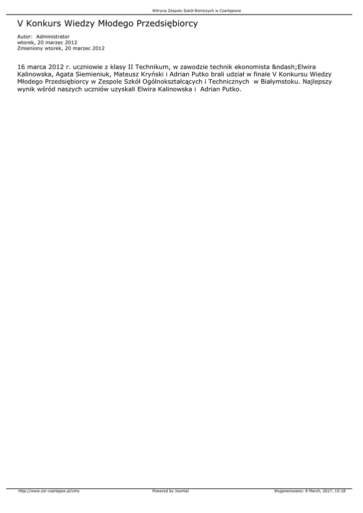Witryna Zespołu Szkół Rolniczych w Czartajewie V Konkurs Wiedzy Młodego Przedsiębiorcy Autor: Administrator wtorek, 20 marzec 2012 Zmieniony wtorek, 20 marzec 2012 16 marca 2012 r. uczniowie z klasy II Technikum, w zawodzie technik ekonomista –Elwira Kalinowska, Agata Siemieniuk, Mateusz Kryński i Adrian Putko brali udział w finale V Konkursu Wiedzy Młodego Przedsiębiorcy w Zespole Szkół Ogólnokształcących i Technicznych w Białymstoku. Najlepszy wynik wśród naszych uczniów uzyskali Elwira Kalinowska i Adrian Putko. http://www.zsr-czartajew.pl/cms Powered by Joomla! Wygenerowano: 8 March, 2017, 15:18