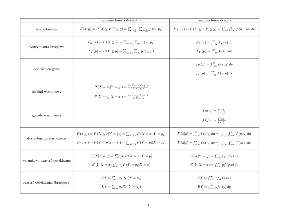 zmienna losowa dyskretna dystrybuanta F (x; y) = P (X x; Y P y) = FX (x) = P (X x) = FY (y) = P (Y y) = dystrybuanta brzegowa P xi x P xi x P yj y zmienna losowa ciag÷ ¾ a yj P y p (xi ; yj ) F (x; y) = P (X x; Y y) = yj p (xi ; yj ) FX (x) = xi p (xi ; yj ) FY (y) = P fX (x) = destość ¾ brzegowa fY (y) = rozk÷ad warunkowy P (X = xi jY = yj ) = P (X=xi ;Y =yj ) P (Y =yj ) P (Y = yj jX = xi ) = P (Y =yj ;X=xi ) P (X=xi ) Rx 1 R1 1 R1 1 1 1 f (u; v) dvdu fX (u) du 1 Ry Rx Ry fY (v) dv f (x; y) dy f (x; y) dx f (xjy) = f (x;y) fY (y) f (yjx) = f (x;y) fX (x) gestość ¾ warunkowa F (xjyj ) = P (X xjY = yj ) = F (yjxi ) = P (Y yjX = xi ) = dystrybuanta warunkowa E (XjY = y) = warunkowa wartość oczekiwana E (Y jX = x) EX = wartość oczekiwana (brzegowa) EY = P xi P yj P xi P yj P xi x P (X = xi jY = yj ) F (xjy) = yj P (Y = yj jX = xi ) F (yjx) = P y xi P (X = xi jY = y) yj P (Y = yj jX = x) Rx Ry 1 1 f (ujy) du = 1 fY (y) f (xjv) dv = 1 fX (x) E (XjY = y) = E (Y jX = x) = xi PX (X = xi ) EX = yj PY (Y = yj ) EY = 1 R1 R1 R1 1 R1 1 1 1 Rx 1 Ry 1 f (u; y) du f (x; v) dv xf (xjy) dx yf (yjx) dy xfX (x) dx yfY (y) dy