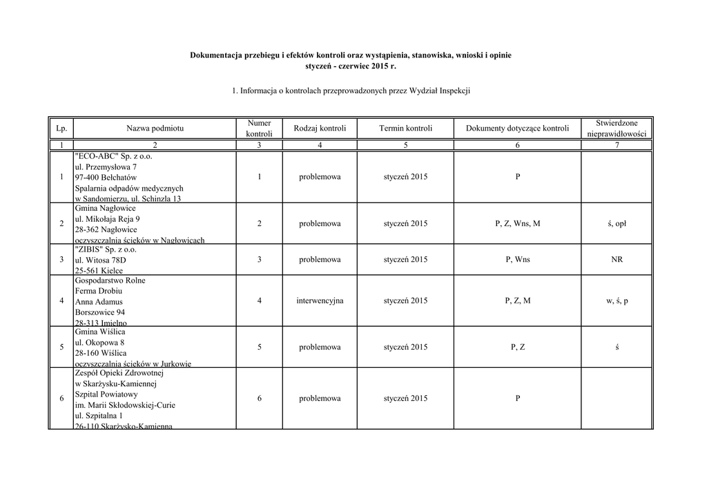 Dokumentacja przebiegu i efektów kontroli oraz wystąpienia, stanowiska, wnioski i opinie styczeń - czerwiec 2015 r. 1. Informacja o kontrolach przeprowadzonych przez Wydział Inspekcji Lp. Nazwa podmiotu 1 2 1 2 3 4 5 6 "ECO-ABC" Sp. z o.o. ul. Przemysłowa 7 97-400 Bełchatów Spalarnia odpadów medycznych w Sandomierzu, ul. Schinzla 13 Gmina Nagłowice ul. Mikołaja Reja 9 28-362 Nagłowice oczyszczalnia ścieków w Nagłowicach "ZIBIS" Sp. z o.o. ul. Witosa 78D 25-561 Kielce Gospodarstwo Rolne Ferma Drobiu Anna Adamus Borszowice 94 28-313 Imielno Gmina Wiślica ul. Okopowa 8 28-160 Wiślica oczyszczalnia ścieków w Jurkowie Zespół Opieki Zdrowotnej w Skarżysku-Kamiennej Szpital Powiatowy im. Marii Skłodowskiej-Curie ul. Szpitalna 1 26-110 Skarżysko-Kamienna Numer kontroli 3 Stwierdzone nieprawidłowości 7 Rodzaj kontroli Termin kontroli Dokumenty dotyczące kontroli 4 5 6 1 problemowa styczeń 2015 P 2 problemowa styczeń 2015 P, Z, Wns, M ś, opł 3 problemowa styczeń 2015 P, Wns NR 4 interwencyjna styczeń 2015 P, Z, M w, ś, p 5 problemowa styczeń 2015 P, Z ś 6 problemowa styczeń 2015 P 7 8 9 10 11 12 13 14 Zakład Gospodarki Komunalnej i Mieszkaniowej ul. Żeromskiego 50 27-630 Zawichost oczyszczalnia ścieków w Zawichoście Przedsiębiorstwo Robót Drogowych Adrian Cieśla ul. 17-go Stycznia 32 27-200 Starachowice Wytwórnia Mas Bitumicznych w Kielcach, ul. Piekoszowska 390 Celsium Sp. z o.o. ul. 11-go Listopada 7 26-110 Skarżysko-Kamienna Kotłownia La Monte'a ul. Niepodległości 100 Ubojnia Drobiu "ŻAK" Andrzej Żak ul. Batalionów Chłopskich 234 25-658 Kielce Wojewódzki Szpital Zespolony ul. Grunwaldzka 45 25-736 Kielce "SKANSKA" S.A. Oddział Exbud Skanska w Kielcach Wytwórnia Konstrukcji Stalowych ul. Peryferyjna 23 25-562 Kielce Zakład Usługowo-Handlowy "ELKOT" Oddział Kielce ul. Jesionowa 31B 25-540 Kielce "EUROVIA KRUSZYWA" S.A. ul. Szwedzka 5 Bielany Wrocławskie 55-040 Kobierzyce Kopalnia Wiśniówka 26-050 Zagnańsk 7 problemowa styczeń 2015 P, Z ś 8 interwencyjna styczeń 2015 P, Z, M ś 9 interwencyjna styczeń 2015 P 10 kompleksowa styczeń 2015 P, Z, Wns 11 problemowa styczeń 2015 P 12 problemowa luty 2015 P, Z 13 problemowa styczeń 2015 P 14 problemowa styczeń 2015 P, Wns p, opł, o, ś, F-gazy p, opł ś 15 16 17 18 19 20 21 22 MAN BUS Sp. z o.o. ul. Poznańska 4; Sady 62-080 Tarnowo Podgórne Oddział w Starachowicach ul. 1-go Maja 12 27-200 Starachowice Miejska Energetyka Cieplna Sp. z o.o. ul. Sienkiewicza 91 27-400 Ostrowiec Świętokrzyski "ODLEWNIA ŻELIWA ORZECHOWSCY" Sp. J. Wincentów 19 26-200 Końskie Zakład w Korytkowie, gm. Gowarczów Gminny Zakład Usługowo-Inwestycyjny w Pawłowie zs. w Brzeziu Brzezie 85A 27-225 Pawłów oczyszczalnia ścieków w Pawłowie Zakład Usługowo-Handlowy "A.T.M." s.c. ul. 1-go Maja 40 26-110 Skarżysko-Kamienna Gmina Smyków Smyków 91 26-212 Smyków oczyszczalnia ścieków w Miedzierzy Przedsiębiorstwo Produkcyjno-HandlowoUsługowe "EKO-INŻ" Sp. J. M. Pikulski, St. Misztal ul. Przemysłowa 11 28-400 Pińczów TO MMY 555555 Piróg Tomasz Tomasz Piróg ul. Krakowska 246 25-801 Kielce p, LZO, opł 15 problemowa marzec 2015 P, Z 16 problemowa marzec 2015 P 17 kompleksowa luty 2015 P, Z 18 kompleksowa luty 2015 P 19 problemowa luty 2015 P, Wns NR 20 kompleksowa luty 2015 P, Z o 21 interwencyjna luty 2015 P, Z p, opł 22 interwencyjna luty 2015 P p 23 24 25 26 27 28 29 30 Przedsiębiorstwo Produkcyjno-HandlowoUsługowe "MARKUS" ul. Spokojna 5 26-080 Mniów Baza w m. Bliżyn, ul. Kościuszki 131 nieruchomość przy ul. Partyzantów 74 w Jędrzejowie, należąca do Pana Jerzego Gajdy, zam. w Jędrzejowie, ul. Słowackiego 29 "ORICA POLAND" Sp. z o.o. ul. T. Kościuszki 16/4; 50-038 Wrocław Oddział Kielce i Bełchatów ul. Cementowa 3 26-052 Sitkówka-Nowiny Skład Materiałów Wybuchowych w Kielcach, ul. Na Stole oględziny terenu Przedsiębiorstwa Produkcyjno-Usługowo-Handlowego "BOLMOT" Robert Bolwiński ul. Głowackiego 30 28-300 Jędrzejów Zakład Usług Komunalnych w Daleszycach Sp. z o.o. ul. Ługi 1 26-021 Daleszyce oczyszczalnia ścieków w Marzyszu "EKO POL WOS" Sp. z o.o. Pawłowice 101 28-340 Sędziszów oględziny terenu nieruchomości Pana Tomasza Wojny przy ul. Górniczej 7c oraz działki Pana Roberta Nowka przy ul. Górniczej 7b w Stąporkowie Wielobranżowe Przedsiębiorstwo Innowacji Technicznych "MISTAMA" Sp. z o.o. ul. Warszawska 312B 25-414 Kielce 23 problemowa luty 2015 P, Z p, opł 24 interwencyjna luty 2015 P, Z, Wns o, p 25 kompleksowa luty 2015 P 26 problemowa luty 2015 N 27 problemowa luty 2015 P 28 problemowa luty 2015 P 28a problemowa styczeń 2015 N 29 problemowa luty 2015 P 31 32 33 34 35 36 37 38 Przedsiębiorstwo Gospodarki Komunalnej w Połańcu Sp. z o.o. ul. Krakowska 11 28-230 Połaniec Składowisko odpadów w Luszycy Sopro Polska Sp. z o.o. ul. Poleczki 23F 02-822 Warszawa Zakład Suchych Zapraw Nowiny 26-052 Sitkówka-Nowiny "Środowisko i Innowacje" Sp. z o.o. Dobrów 8 28-142 Tuczępy "Środowisko i Innowacje" Sp. z o.o. Dobrów 8 28-142 Tuczępy "CERRAD" Sp. z o.o. ul. Radomska 49B 27-200 Starachowice Zakład Gospodarki Komunalnej w Miedzianej Górze ul. Ks. J. Przyłęckiego 1/2 Kostomłoty Drugie 26-085 Miedziana Góra oczyszczalnia ścieków w Kostomłotach Drugich Przedsiębiorstwo Produkcyjno-Handlowe KJK Janusz Łoskot ul. Górna 20; 25-415 Kielce Zakład Produkcyjny nr 1 Masłów II 1A 26-001 Masłów Przedsiębiorstwo Handlowo-UsługowoProdukcyjne "WOMAR" ul. Warszawska 3A 26-130 Suchedniów 30 problemowa luty 2015 P 31 kompleksowa luty 2015 P 32 kompleksowa luty 2015 P 33 problemowa luty 2015 P 34 problemowa luty 2015 P 35 odbiór inwestycji luty 2015 P 36 interwencyjna luty 2015 P, Z 37 kompleksowa luty 2015 P p, o 39 40 41 42 43 44 45 46 47 "DOBRA ENERGIA" Sp. z o.o. ul. Głowackiego 87 28-300 Jędrzejów nieruchomość w m. Święta Katarzyna, ul. Wzorki 2, 26-010 Bodzentyn, użytkowana przez Pana Damiana Szyszkowskiego Zakład Mechaniki 