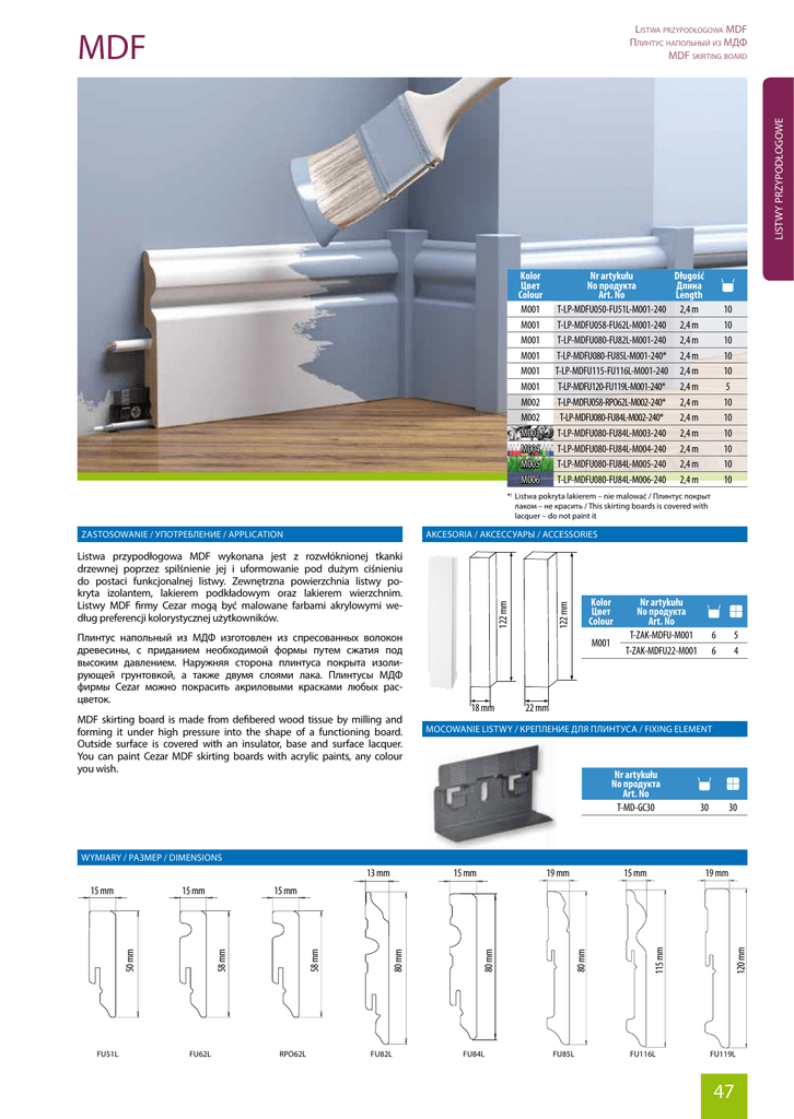 Listwa przypodłogowa MDF Плинтус напольный из МДФ MDF skirting board LISTWY PRZYPODŁOGOWE MDF Kolor Цвет Colour M001 M001 M001 M001 M001 M001 M002 M002 M003 M004 M005 M006 Nr artykułu Długość No продукта Длина Art. No Length T-LP-MDFU050-FU51L-M001-240 2,4 m T-LP-MDFU058-FU62L-M001-240 2,4 m T-LP-MDFU080-FU82L-M001-240 2,4 m T-LP-MDFU080-FU85L-M001-240* 2,4 m T-LP-MDFU115-FU116L-M001-240 2,4 m T-LP-MDFU120-FU119L-M001-240* 2,4 m T-LP-MDFU058-RPO62L-M002-240* 2,4 m T-LP-MDFU080-FU84L-M002-240* 2,4 m T-LP-MDFU080-FU84L-M003-240 2,4 m T-LP-MDFU080-FU84L-M004-240 2,4 m T-LP-MDFU080-FU84L-M005-240 2,4 m T-LP-MDFU080-FU84L-M006-240 2,4 m 10 10 10 10 10 5 10 10 10 10 10 10 *) Listwa pokryta lakierem – nie malować / Плинтус покрыт лаком – не красить / This skirting boards is covered with lacquer – do not paint it AKCESORIA / АКСЕССУАРЫ / ACCESSORIES Плинтус напольный из МДФ изготовлен из спресованных волокон древесины, с приданием необходимой формы путем сжатия под высоким давлением. Наружняя сторона плинтуса покрыта изолирующей грунтовкой, а также двумя слоями лака. Плинтусы МДФ фирмы Cezar можно покрасить акриловыми красками любых расцветок. MDF skirting board is made from defibered wood tissue by milling and forming it under high pressure into the shape of a functioning board. Outside surface is covered with an insulator, base and surface lacquer. You can paint Cezar MDF skirting boards with acrylic paints, any colour you wish. 122 mm Listwa przypodłogowa MDF wykonana jest z rozwłóknionej tkanki drzewnej poprzez spilśnienie jej i uformowanie pod dużym ciśnieniu do postaci funkcjonalnej listwy. Zewnętrzna powierzchnia listwy pokryta izolantem, lakierem podkładowym oraz lakierem wierzchnim. Listwy MDF firmy Cezar mogą być malowane farbami akrylowymi według preferencji kolorystycznej użytkowników. Kolor Цвет Colour 122 mm ZASTOSOWANIE / УПОТРЕБЛЕНИЕ / APPLICATION M001 18 mm Nr artykułu No продукта Art. No T-ZAK-MDFU-M001 T-ZAK-MDFU22-M001 6 6 5 4 22 mm MOCOWANIE LISTWY / КРЕПЛЕНИЕ ДЛЯ ПЛИНТУСА / FIXING ELEMENT Nr artykułu No продукта Art. No T-MD-GC30 30 30 WYMIARY / РАЗМЕР / DIMENSIONS 13 mm FU51L FU62L 15 mm 19 mm 15 mm 19 mm RPO62L FU82L FU84L FU85L FU116L 120 mm 115 mm 80 mm 80 mm 80 mm 58 mm 15 mm 58 mm 15 mm 50 mm 15 mm FU119L 47