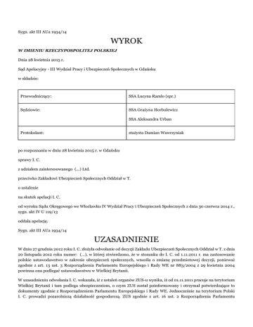 Sygn. akt III AUa 1934/14 WYROK W IMIENIU RZECZYPOSPOLITEJ POLSKIEJ Dnia 28 kwietnia 2015 r. Sąd Apelacyjny - III Wydział Pracy i Ubezpieczeń Społecznych w Gdańsku w składzie: Przewodniczący: SSA Lucyna Ramlo (spr.) Sędziowie: SSA Grażyna Horbulewicz SSA Aleksandra Urban Protokolant: stażysta Damian Wawrzyniak po rozpoznaniu w dniu 28 kwietnia 2015 r. w Gdańsku sprawy I. C. z udziałem zainteresowanego (...) Ltd. przeciwko Zakładowi Ubezpieczeń Społecznych Oddział w T. o ustalenie na skutek apelacji I. C. od wyroku Sądu Okręgowego we Włocławku IV Wydział Pracy i Ubezpieczeń Społecznych z dnia 30 czerwca 2014 r., sygn. akt IV U 119/13 oddala apelację. Sygn. akt III AUa 1934/14 UZASADNIENIE W dniu 27 grudnia 2012 roku I. C. złożyła odwołanie od decyzji Zakładu Ubezpieczeń Społecznych Oddział w T. z dnia 20 listopada 2012 roku numer: (...), w której stwierdzono, że w stosunku do I. C. od 1.11.2011 r. ma zastosowanie polskie ustawodawstwo w zakresie ubezpieczeń społecznych, wnosiła o zmianę przedmiotowej decyzji, ponieważ zgodnie z art. 13 ust. 3 Rozporządzenia Parlamentu Europejskiego i Rady WE nr 883/2004 z 29 kwietnia 2004 powinna ona podlegać ustawodawstwu w Wielkiej Brytanii. W uzasadnieniu odwołania I. C. wskazała, iż z ustaleń organów ZUS-u wynika, iż od 01.11.2011 pracuje na terytorium Wielkiej Brytanii i tam podlega ubezpieczeniom, o czym ZUS został poinformowany i otrzymał potwierdzające to dokumenty zgodnie z Rozporządzeniem Parlamentu Europejskiego i Rady WE. Jednocześnie na terytorium Polski I. C. prowadzi pozarolniczą działalność gospodarczą. ZUS zgodnie z art. 16 ust. 2 Rozporządzenia Parlamentu Europejskiego i Rady WE nr 987/2009 w chwili poinformowania go o podjęciu przez I. C. pracy w Wielkiej Brytanii ustanowił pismem z dnia 13.03.2012r, podleganie tymczasowemu ubezpieczeniu na terenie Wielkiej Brytanii, o czym poinformował brytyjską instytucję ubezpieczeniową, które zgodnie z ust. 3 tego artykułu stało się ostateczne z upływem dwóch miesięcy. Mając na uwadze regulacje zawarte w Rozporządzeniu Parlamentu Europejskiego, w ocenie dowołującej twierdzenie o podleganiu I. C. ustawodawstwu polskiemu jest błędne. Odnośnie przy tym braku prowadzenia działalności przez pracodawcę I. C. na terenie Wielkiej Brytanii to – zdaniem odwołującej - istnieje możliwość sprawdzenia w odpowiedniku KRS czy taka jest prowadzona, a Rozporządzenie Parlamentu Europejskiego i Rady WE nie przewiduje możliwości nie uznania podlegania I. C. pod ubezpieczenie w Wielkiej Brytanii. I. C. dodała, że wykonuje swoją pracę sumiennie i za to otrzymuje wynagrodzenie. Organ rentowy wniósł o oddalenie odwołania. Zakład Ubezpieczeń Społecznych Oddział w T. w odpowiedzi na odwołanie wskazał, iż 21 grudnia 2011 r. wnioskodawczyni złożyła oświadczenie o wyrejestrowaniu z ubezpieczeń społecznych w związku z podjęciem od 1.12.2011 r. pracy najemnej w Wielkiej Brytanii przy jednoczesnym prowadzeniu działalności gospodarczej w Polsce. Z umowy zawartej przez wnioskodawczynię z (...) Ltd. wynika jednak, że dniem jej zawarcia był 1.11.2011 r. Informacja ta została później potwierdzona przez wnioskodawczynię. Praca na terenie UK miała być przez I. C. wykonywana w godzinach od 8.00 do 16.00, w ilości od 1 do 160 godzin miesięcznie, w zależności od własnego uznania, po porozumieniu z pracodawcą. 12 lipca 2012 r. brytyjska instytucja ubezpieczeniowa poinformowała, że nie wystawi dla wnioskodawczyni formularza Al, gdyż po przeprowadzeniu odpowiedniego postępowania nie znaleziono żadnych dokumentów ani innych dowodów, które potwierdzałyby, że (...) Ltd. prowadzi działalność gospodarczą na terytorium UK. Firma ta została przez brytyjską instytucję ubezpieczeniową oznaczona jako spółka adresowa, a więc taka, która nie ma miejsca prowadzenia działalności na terytorium UK, a do jej siedziby dociera jedynie poczta. Wnioskodawczyni nie została też zidentyfikowana w brytyjskim systemie ubezpieczeniowym (brak brytyjskiego nr ubezpieczenia). Dodano, że w piśmie z 9.03.2012 r. I. C. poinformowała ZUS, iż jej nr ubezpieczenia w UK to (...). Dodano, że obydwaj dyrektorzy w/w firmy mieszkają w Polsce, a pod jej brytyjskim adresem znajduje się jedynie „wirtualne biuro”. Jedynym celem jego utworzenia było dostarczenie adresu umożliwiającego rejestrację firmy w UK. Jest to przyczyna, dla której od 1.11.2011 r. wnioskodawczyni powinna podlegać polskiemu ustawodawstwu w zakresie ubezpieczeń społecznych z tytułu prowadzenia działalności gospodarczej. W stosunku do wnioskodawczyni nie ma bowiem zastosowania art. 13 ust. 3 rozporządzenia (WE) nr 883/2004, gdyż wnioskodawczyni nie była aktywna zawodowo na terenie kilku państw. Zgodnie natomiast z przepisem art. 11 ust. 3 lit. a tego rozporządzenia, osoba wykonująca w państwie członkowskim pracę najemną lub pracę na własny rachunek podlega ustawodawstwu tego państwa członkowskiego. 5 listopada 2012 r. do ZUS wpłynęło pismo wnioskodawczyni, z treści którego wynika, że w UK firma zajmuje się głównie reklamą internetową, a praca wnioskodawczyni polegać miała na wyszukiwaniu darmowych katalogów za pośrednictwem Internetu. Praca ta nie wymagała więc stałej obecności w UK, a jedynie czasowych wizyt na terenie tego państwa. Wnioskodawczyni nie przedstawiła jednak żadnych dowodów potwierdzających choćby okazyjne wizyty w UK. Nie przedłożyła też żadnych innych dowodów, które mogłyby potwierdzić, że praca była przez nią wykonywana akurat tam. Postanowieniem z dnia 16 grudnia 2013r. Sąd Okręgowy we Włocławku wezwał do udziału w sprawie w charakterze zainteresowanego (...) Ltd. Zainteresowany nie zajął stanowiska w sprawie. Wyrokiem z dnia 30 czerwca 2014 r. Sąd Okręgowy we Włocławku IV Wydział Pracy i Ubezpieczeń Społecznych oddalił odwołanie I. C.. W pisemnym uzasadnieniu