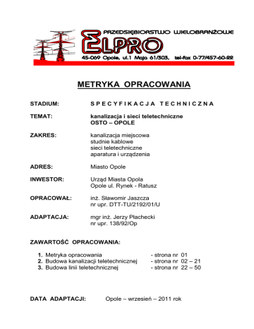 METRYKA OPRACOWANIA STADIUM: SPECYFIKACJA TECHNICZNA TEMAT: kanalizacja i sieci teletechniczne OSTO – OPOLE ZAKRES: kanalizacja miejscowa studnie kablowe sieci teletechniczne aparatura i urz dzenia ADRES: Miasto Opole INWESTOR: Urz d Miasta Opola Opole ul. Rynek - Ratusz OPRACOWA : in . S awomir Jaszcza nr upr. DTT-TU/2192/01/U ADAPTACJA: mgr in . Jerzy P achecki nr upr. 138/92/Op ZAWARTO OPRACOWANIA: 1. Metryka opracowania 2. Budowa kanalizacji teletechnicznej 3. Budowa linii teletechnicznej DATA ADAPTACJI: - strona nr 01 - strona nr 02 – 21 - strona nr 22 – 50 Opole – wrzesie – 2011 rok A) BUDOWA KANALIZACJI TELETECHNICZNEJ 1. Wst p 1.1 Przedmiot specyfikacji (STT.00.00.01) Przedmiotem niniejszej Specyfikacji s wymagania dotycz ce wykonania i odbioru robót zwi zanych z budow kanalizacji teletechnicznej dla sieci wiat owodowej obj tej kontraktem „Budowa sieci wiat owodowej OSTO w Opolu” 1.2 Zakres stosowania Specyfikacji Specyfikacja jest stosowana jako dokument przetargowy i kontraktowy przy zlecaniu i realizacji robót wymienionych w pkt. 1.1. 1.3 Zakres robót obj tych Specyfikacj Roboty, których dotyczy Specyfikacja obejmuj wszystkie czynno ci umo liwiaj ce i maj ce na celu wykonanie kanalizacji teletechnicznej. W zakres robót wchodz : - wykopanie i zasypanie wykopu pod studnie kablowe, - wykonanie i zasypanie wykopu pod rury, - budowa studni kablowych, - u - wykonanie przepustów pod drogami enie rur PCV, 1.4 Okre lenia podstawowe 1.4.1 Kanalizacja kablowa – zespó ci gów podziemnych z wbudowanymi studniami przeznaczony do prowadzenia kabli telekomunikacyjnych. 1.4.2 Kanalizacja pierwotna – kanalizacja kablowa, do której wci ga si telekomunikacyjne lub rury kanalizacji wtórnej. kable 1.4.3 Kanalizacja wtórna – zespó rur polietylenowych lub innych, o nie gorszych ciwo ciach zaci ganych do otworów kanalizacji pierwotnej, stanowi cych dodatkowe zabezpieczenie kabli optotelekomunikacyjnych i innych. 1.4.4 Kanalizacja magistralna – kanalizacja wielootworowa przeznaczona dla kabli linii magistralnych, mi dzycentralowych, mi dzymiastowych okr gowych i po rednich. 1.4.5 Kanalizacja rozdzielcza – kanalizacja kablowa jedno- lub dwuotworowa przeznaczona dla kabli linii rozdzielczych. 1.4.6 Kanalizacja specjalna - kanalizacja pierwotna z rur stalowych, wype nionych rurami z tworzyw sztucznych przeznaczona dla kabli na terenie stacji elektroenergetycznych i w ich bezpo rednim s siedztwie, ograniczaj ca niebezpieczne oddzia ywanie urz dze elektroenergetycznych na kable. 1.4.7 Blok kanalizacji kablowej – blok betonowy z jednym lub wieloma otworami stosowany do zestawiania ci gów kanalizacji kablowej. 1.4.8 Ci g kanalizacji – bloki kanalizacji kablowej lub rury u one w wykopie jeden za drugim i po czone pojedynczo lub w zestawach pozwalaj cych uzyska potrzebn liczb otworów kanalizacji. 1.4.9 Ruroci g kablowy – ci g rur polipropylenowych, polietylenowych lub innych o nie gorszych w ciwo ciach oraz zasobników z czowych uk adanych bezpo rednio w ziemi i stanowi cych os on ochronn dla kabli wiat owodowych. 1.4.10 Studnia kablowa – pomieszczenie podziemne wbudowane mi dzy ci gi kanalizacji kablowej w celu umo liwienia wci gania, monta u i konserwacji kabli. 1.4.11 Studnia kablowa magistralna - studnia kablowa wbudowana mi dzy ci gi kanalizacji magistralnej. 1.4.12 Studnia kablowa rozdzielcza - studnia kablowa wbudowana mi dzy ci gi kanalizacji rozdzielczej. 1.4.13 Studnia kablowa szafkowa – studnia kablowa przed szafk lub rozdzielnic kablow . 1.4.14 Studnia kablowa stacyjna - studnia kablowa magistralna przy budynku centrali telefonicznej przeznaczona do wprowadzania kanalizacji do kablowni lub komory kablowej. 1.4.15 Komora kablowa – pomieszczenie w budynku centrali telefonicznej przeznaczone do wprowadzania kabli telekomunikacyjnych do centrali telefonicznej. 1.4.16 Szafka kablowa – metalowe lub z nas termoplastycznych pud o wraz z konstrukcj wsporcz przystosowan do mocowania g owic kablowych. 1.4.17 Zasobnik z czowy – zbiornik stanowi cy os on ochronn dla z cza kabla optotelekomunikacyjnego i jego zapasów przy z czu, umieszczany bezpo rednio w ziemi. 1.4.18 Doprowadzenie kanalizacji – krótkie odcinki kanalizacji cz ce studnie stacyjne z komorami kablowymi lub studnie rozdzielcze z budynkami albo ze studniami przy upach kablowych. 1.4.19 Komora studni – rodkowa cz 1.4.20 Gard o studni – zaw ona cz studni kablowej. studni mi dzy komor a czo em zestawów kanalizacji wprowadzanych do studni kablowych. 1.4.21 Osadnik studni – zag bienie w dnie studni stanowi ce zbiornik do wody ciekowej. 1.4.22 W az studni – otwór wej ciowy do studni kablowej zamykany pokryw . 1.4.23 Rama w azu – obramowanie w azu studni kablowej. 1.4.24 Pokrywa studni – oprawa wype niona betonem lub asfaltem. 1.4.25 Wietrznik studni – tarcza eliwna z otworami do wietrzenia studni osadzona w pokrywie. 1.4.26 Ucho do wci gania kabli – wygi ty pr t stalowy przeznaczony do mocowania kr ka kierunkowego przy wci ganiu i wyci ganiu kabli. 1.4.27 S upek wspornikowy studni – odcinek rury stalowej osadzony w studni przeznaczony do montowania wsporników kablowych. 1.4.28 Rura kanalizacji kablowej pierwotnej – rura os onowa z polipropylenu (PP), polietylenu (PE) lub z innego materia u o nie gorszych w ciwo ciach, a tak e rura stalowa, stosowana do zestawienia ci gów kanalizacji kablowej. 1.4.29 Kanalizacja kablowa pierwotna – kanalizacja teletechniczna, wykonana z bloków betonowych, rur z polichlorku winylu lub rur obiektowych (stalowych, azbestowocementowych, PCW lub innych), do której zaci gni to rury kanalizacji kablowej wtórnej. 1.4.30 Rura cienko cienna (kanalizacji termoplastycznego o grubo ci budowy ci gów pierwotnej) – rura z tworzywa cianki od 3 mm do 5 mm przeznaczona do kanalizacyjnych w miejscach o mniejszym zagro eniu uszkodzeniami mechanicznymi. 1.4.31 Rura grubo cienna (kanalizacji pierwotnej) – j.w., lecz o grubo ci mniejszej ni cianki nie 5 mm 