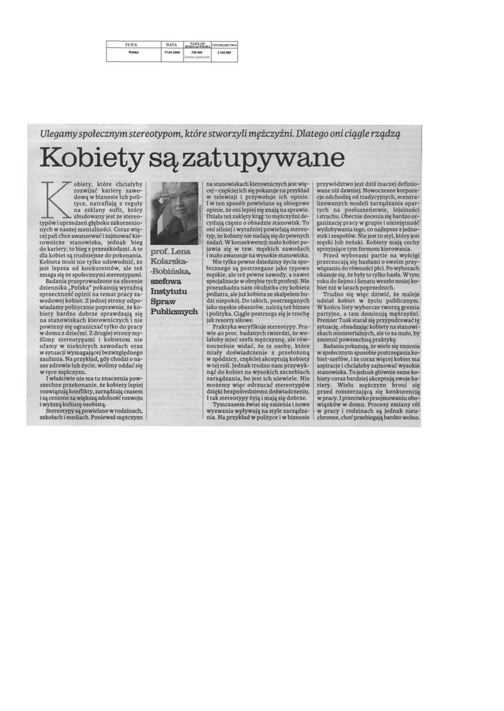 TYTUŁ Polska DATA 17-01-2008 NAKŁAD RODZAJ PISMA CZYTELNICTWO 700 000 Dziennik ogólnopolski 2 450 000 Ulegamy społecznym stereotypom, które stworzyli mężczyźni Dlatego oni ciągle rządzą Kobiety są zatupywane obiety, które chciałyby rozwijać karierę zawo dową w biznesie lub poli tyce, natrafiają z reguły na szklany sufit, który zbudowany jest ze stereo typów i uprzedzeń głęboko zakorzenio nych w naszej mentalności. Coraz wię cej pań chce awansować i zajmować kie rownicze stanowiska, jednak bieg do kariery, to bieg z przeszkodami. A te dla kobiet są trudniejsze do pokonania. Kobieta musi nie tylko udowodnić, że jest lepsza od konkurentów, ale też zmaga się ze społecznymi stereotypami. Badania przeprowadzone na zlecenie dziennika „Polska" pokazują wyraźną sprzeczność opinii na temat pracy za wodowej kobiet. Z jednej strony odpo wiadamy politycznie poprawnie, że ko biety bardzo dobrze sprawdzają się na stanowiskach kierowniczych i nie powinny się ograniczać tylko do pracy w domu z dziećmi. Z drugiej strony my ślimy stereotypami i kobietom nie ufamy w niektórych zawodach oraz w sytuacji wymagającej bezwzględnego zaufania. Na przykład, gdy chodzi o na sze zdrowie lub życie, wolimy oddać się w ręce mężczyzn. I właściwie nie ma tu znaczenia pow szechne przekonanie, że kobiety lepiej rozwiązują konflikty, zarządzają czasem i są cenione za większą zdolność rozwoju i wyższą kulturę osobistą. Stereotypy są powielane w rodzinach, szkołach i mediach. Ponieważ mężczyzn prof. Lena KolajRska-Bobińska^ szefowa Instytutu Spraw Publicznych na stanowiskach kierowniczych jest wię przywództwo jest dziś inaczej definio cej - częściej ich się pokazuje na przykład wane niż dawniej. Nowoczesne korpora w telewizji i przywołuje ich opinie. cje odchodzą od tradycyjnych, scentra I w ten sposób powielane są obiegowe lizowanych modeli zarządzania opar opinie, że oni lepiej się znają na sprawie. tych na posłuszeństwie, lojalności Działa też zaklęty krąg: to mężczyźni de i strachu. Obecnie docenia się bardzo or cydują często o obsadzie stanowisk. To ganizację pracy w grupie i umiejętność oni silniej i wyraźniej powielają stereo wydobywania tego, co najlepsze z jedno typ, że kobiety nie nadają się do pewnych stek i zespołów. Nie jest to styl, który jest zadań. W konsekwencji mało kobiet po męski lub żeński. Kobiety mają cechy jawia się w tzw. męskich zawodach sprzyjające tym formom kierowania. i mało awansuje na wysokie stanowiska. Przed wyborami partie na wyścigi Nie tylko pewne dziedziny życia spo przerzucają się hasłami o swoim przy łecznego są postrzegane jako typowo wiązaniu do równości płci. Po wyborach męskie, ale też pewne zawody, a nawet okazuje się, że były to tylko hasła. W tym specjalizacje w obrębie tych profesji. Nie roku do Sejmu i Senatu weszło mniej ko przeszkadza nam okulistka czy kobieta biet niż w latach poprzednich. pediatra, ale już kobieta ze skalpelem bu Trudno się więc dziwić, że maleje dzi niepokój. Do takich, postrzeganych udział kobiet w życiu publicznym. jako męskie obszarów, należą też biznes W końcu listy wyborcze tworzą gremia i polityka. Ciągle postrzega się je trochę partyjne, a tam dominują mężczyźni. jak resorty siłowe. Premier Tusk starał się przypudrować tę Praktyka weryfikuje stereotypy. Pra sytuację, obsadzając kobiety na stanowi wie 40 proc. badanych twierdzi, że wo skach ministerialnych, ale to za mało, by lałoby mieć szefa mężczyznę, ale rów zmienić powszechną praktykę. nocześnie widać, że te osoby, które Badania pokazują, że wiele się zmienia miały doświadczenie z przełożoną w społecznym sposobie postrzegania kow spódnicy, częściej akceptują kobiety biet-szefów, i że coraz więcej kobiet ma w tej roli. Jednak trudno nam przywyk aspiracje i chciałoby zajinować wysokie nąć do kobiet na wysokich szczeblach stanowiska. To jednak głównie same ko zarządzania, bo jest ich niewiele. Nie biety coraz bardziej akceptują swoje ka możemy więc odrzucać stereotypów riery. Wielu mężczyzn broni się dzięki bezpośredniemu doświadczeniu. przed rozszerzającą się konkurencją I tak stereotypy żyją i mają się dobrze. w pracy. I przeciwko przejmowaniu obo Tymczasem świat się zmienia i nowe wiązków w domu. Procesy zmiany ról wyzwania wpływają na style zarządza • w pracy i rodzinach są jednak nieunia. Na przykład w polityce i w biznesie clironne, choć przebiegają bardzo wohio.