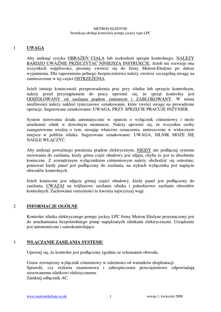 METRON ELEDYNE Instrukcja obsługi kontrolera pompy jockey typu LPC 1 UWAGA Aby uniknąć ryzyka OBRAŻEŃ CIAŁA lub uszkodzeń sprzętu kontrolnego, NALEŻY BARDZO UWAŻNIE PRZECZYTAĆ NINIEJSZĄ INSTRUKCJĘ. Jeżeli nie rozwieje ona wszystkich wątpliwości, prosimy zwrócić się do firmy Metron-Eledyne po dalsze wyjaśnienia. Dla zapewnienia pełnego bezpieczeństwa należy zwrócić szczególną uwagę na zamieszczone w tej części OSTRZEŻENIA. Jeżeli istnieje konieczność przeprowadzenia prac przy silniku lub sprzęcie kontrolnym, należy przed przystąpieniem do pracy upewnić się, że sprzęt kontrolny jest ODIZOLOWANY od zasilania prądem zmiennym i ZABLOKOWANY. W miarę możliwości należy nakleić tymczasowe oznakowanie, które zwróci uwagę na prowadzone operacje. Sugerowane oznakowanie: UWAGA, PRZY SPRZĘCIE PRACUJE INŻYNIER. System sterowania działa automatycznie w oparciu o wyłącznik ciśnieniowy i może uruchomić silnik w dowolnym momencie. Należy upewnić się, że wszystkie osoby zaangażowane wiedzą o tym, stosując właściwe oznaczenia, umieszczone w widocznym miejscu w pobliżu silnika. Sugerowane oznakowanie: UWAGA, SILNIK MOŻE SIĘ NAGLE WŁĄCZYĆ. Aby uniknąć poważnego porażenia prądem elektrycznym, NIGDY nie podłączaj systemu sterowania do zasilania, kiedy górna część obudowy jest zdjęta, chyba że jest to absolutnie konieczne. Z zewnętrznym wyłącznikiem ciśnieniowym należy obchodzić się ostrożnie, ponieważ kiedy panel jest podłączony do zasilania, na stykach wyłącznika jest napięcie obwodów kontrolnych. Jeżeli konieczne jest zdjęcie górnej części obudowy, kiedy panel jest podłączony do zasilania, UWAŻAJ na trójfazowe zasilanie silnika i jednofazowe zasilanie obwodów kontrolnych. Zachowanie ostrożności to kwestia najwyższej wagi. 2 INFORMACJE OGÓLNE Kontroler silnika elektrycznego pompy jockey LPC firmy Metron Eledyne przeznaczony jest do uruchamiania bezpośredniego pomp napędzanych silnikami elektrycznymi. Urządzenie jest autonomiczne i samokontrolujące. 3 WŁĄCZANIE ZASILANIA SYSTEMU Upewnij się, że kontroler jest podłączony zgodnie ze schematem obwodu. Ustaw zewnętrzny wyłącznik ciśnieniowy w zależności od warunków eksploatacji. Sprawdź, czy etykieta znamionowa i zabezpieczenie przeciążeniowe odpowiadają stosowanemu silnikowi elektrycznemu. Zamknij odłącznik AC. www.metroneledyne.co.uk 1 wersja 1, kwiecień 2008 METRON ELEDYNE Instrukcja obsługi kontrolera pompy jockey typu LPC 4 5 STEROWANIE AUTOMATYCZNE Kiedy ciśnienie jest niskie Pompa jest uruchamiana Kiedy ciśnienie wzrasta powyżej wartości zadanej zewnętrznego wyłącznika ciśnieniowego Pompa zatrzymuje się PRZECIĄŻENIE SILNIKA Natężenie prądu silnika jest zbyt wysokie z powodu awarii silnika albo braku fazy zasilania. Po opóźnieniu, zależnym od stopnia przeciążenia: Zabezpieczenie przeciążeniowe zatrzymuje silnik. Ustaw odłącznik AC w pozycji wyłączonej („Off”). Po usunięciu awarii w razie potrzeby zresetuj zabezpieczenie przeciążeniowe. Ustaw odłącznik AC w pozycji włączonej („On”). 6 Opcje Praca pompy, styki beznapięciowe Zmiana podczas pracy pompy Przeciążenie pompy, styki beznapięciowe Zmiana w sytuacji przeciążenia pompy Sterownik czasowy minimalnego przebiegu: Ustaw sterownik czasowy minimalnego przebiegu na żądaną wartość, postępując zgodnie z instrukcjami, umieszczonymi z boku sterownika czasowego. Kiedy ciśnienie jest niskie Pompa jest uruchamiana Kiedy ciśnienie wzrasta powyżej wartości zadanej wyłącznika ciśnieniowego po opóźnieniu zadanemu przez sterownik czasowy Pompa zatrzymuje się. METRON ELEDYNE 18 Autumn Park, Dysart Road, Grantham, LINCS. NG31 7DD. Wielka Brytania Telefon: +44 (0) 1476 516120 Faks: +44 (0) 1476 516121 Email: [email protected] www.metroneledyne.co.uk www.metroneledyne.co.uk 2 wersja 1, kwiecień 2008
