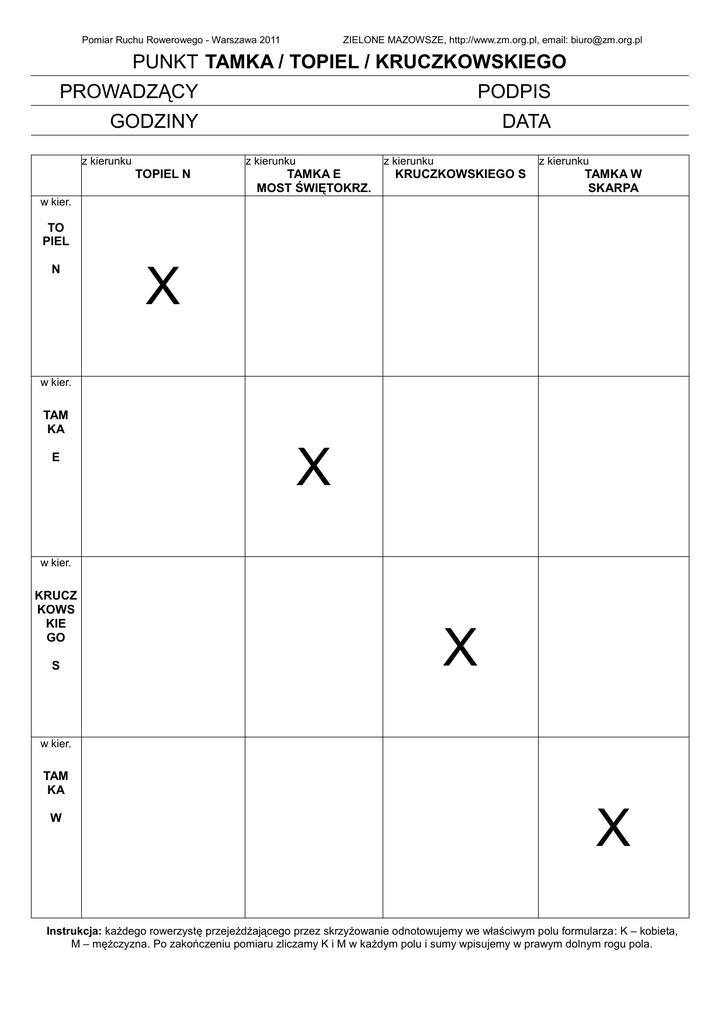 Pomiar Ruchu Rowerowego - Warszawa 2011 ZIELONE MAZOWSZE, http://www.zm.org.pl, email: [email protected] PUNKT TAMKA / TOPIEL / KRUCZKOWSKIEGO PROWADZĄCY PODPIS GODZINY DATA z kierunku z kierunku TOPIEL N z kierunku TAMKA E MOST ŚWIĘTOKRZ. z kierunku KRUCZKOWSKIEGO S TAMKA W SKARPA w kier. TO PIEL N X w kier. TAM KA E X w kier. KRUCZ KOWS KIE GO S X w kier. TAM KA W X Instrukcja: każdego rowerzystę przejeżdżającego przez skrzyżowanie odnotowujemy we właściwym polu formularza: K – kobieta, M – mężczyzna. Po zakończeniu pomiaru zliczamy K i M w każdym polu i sumy wpisujemy w prawym dolnym rogu pola. Pomiar Ruchu Rowerowego - Warszawa 2011 ZIELONE MAZOWSZE, http://www.zm.org.pl, email: [email protected] PUNKT TAMKA / TOPIEL / KRUCZKOWSKIEGO PROWADZĄCY PODPIS GODZINY DATA TYP ROWERU KASK BEZ KASKU GÓRSKI TREKKINGOWY SZOSOWY MIEJSKI INNY LUB NIETYPOWY Instrukcja: każdego rowerzystę przejeżdżającego przez skrzyżowanie odnotowujemy we właściwym polu formularza: K – kobieta, M – mężczyzna. Po zakończeniu pomiaru zliczamy K i M w każdym polu i sumy wpisujemy w prawym dolnym rogu pola. Uwagi i obserwacje: