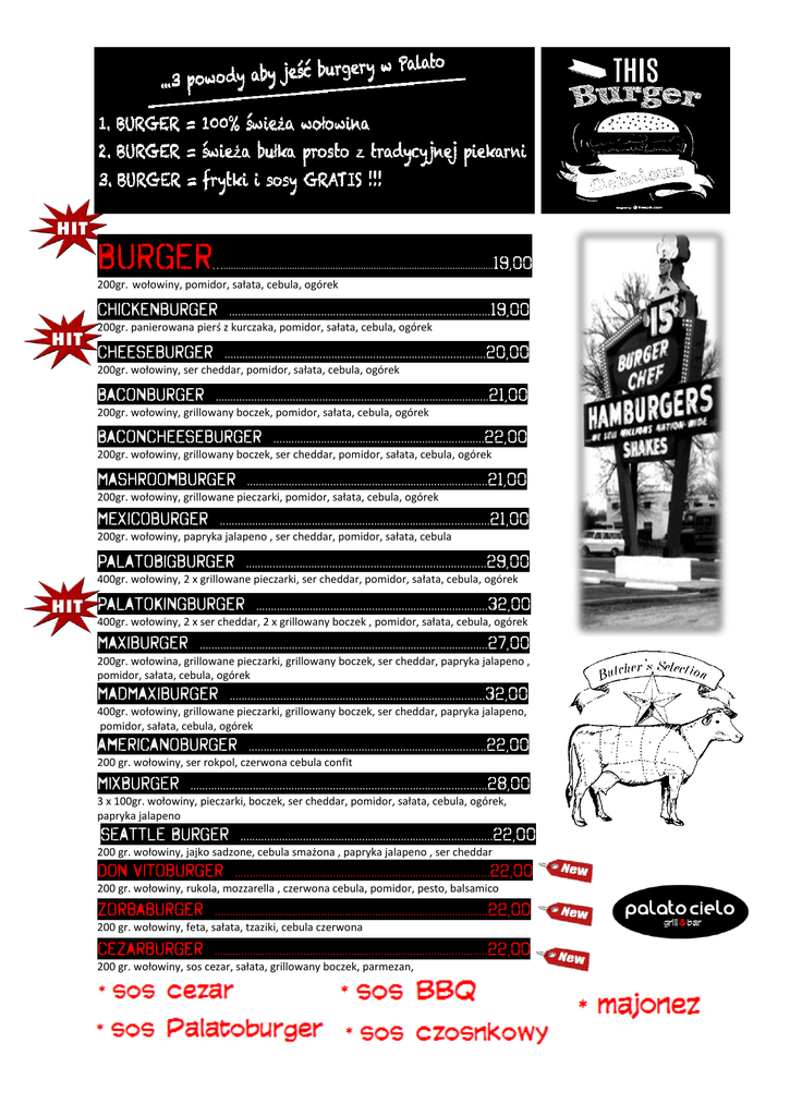 Burger…..........................................................................................................19,00 200gr. wołowiny, pomidor, sałata, cebula, ogórek Chickenburger ........................................................................................19,00 200gr. panierowana pierś z kurczaka, pomidor, sałata, cebula, ogórek Cheeseburger ........................................................................................20,00 200gr. wołowiny, ser cheddar, pomidor, sałata, cebula, ogórek Baconburger ............................................................................................21,00 200gr. wołowiny, grillowany boczek, pomidor, sałata, cebula, ogórek BaconCheeseburger .......................................................................22,00 200gr. wołowiny, grillowany boczek, ser cheddar, pomidor, sałata, cebula, ogórek Mashroomburger .................................................................................21,00 200gr. wołowiny, grillowane pieczarki, pomidor, sałata, cebula, ogórek Mexicoburger ...........................................................................................21,00 200gr. wołowiny, papryka jalapeno , ser cheddar, pomidor, sałata, cebula PalatoBigburger .................................................................................29,00 400gr. wołowiny, 2 x grillowane pieczarki, ser cheddar, pomidor, sałata, cebula, ogórek PalatoKingburger ..............................................................................32,00 400gr. wołowiny, 2 x ser cheddar, 2 x grillowany boczek , pomidor, sałata, cebula, ogórek Maxiburger .................................................................................................27,00 200gr. wołowina, grillowane pieczarki, grillowany boczek, ser cheddar, papryka jalapeno , pomidor, sałata, cebula, ogórek MadMaxiburger ......................................................................................32,00 400gr. wołowiny, grillowane pieczarki, grillowany boczek, ser cheddar, papryka jalapeno, pomidor, sałata, cebula, ogórek Americanoburger ................................................................................22,00 200 gr. wołowiny, ser rokpol, czerwona cebula confit MIXBURGER ....................................................................................................28,00 3 x 100gr. wołowiny, pieczarki, boczek, ser cheddar, pomidor, sałata, cebula, ogórek, papryka jalapeno SEATTLE BURGER .....................................................................................22,00 200 gr. wołowiny, jajko sadzone, cebula smażona , papryka jalapeno , ser cheddar Don Vitoburger ......................................................................................22,00 200 gr. wołowiny, rukola, mozzarella , czerwona cebula, pomidor, pesto, balsamico Zorbaburger ............................................................................................22,00 200 gr. wołowiny, feta, sałata, tzaziki, cebula czerwona Cezarburger ............................................................................................22,00 200 gr. wołowiny, sos cezar, sałata, grillowany boczek, parmezan,