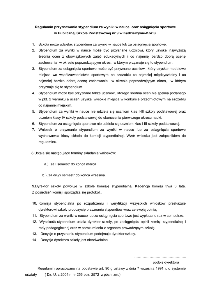 Regulamin przyznawania stypendium za wyniki w nauce oraz osiągnięcia sportowe w Publicznej Szkole Podstawowej nr 9 w Kędzierzynie-Koźlu. 1. Szkoła może udzielać stypendium za wyniki w nauce lub za osiągnięcia sportowe. 2. Stypendium za wyniki w nauce może być przyznane uczniowi, który uzyskał najwyższą średnią ocen z obowiązkowych zajęć edukacyjnych i co najmniej bardzo dobrą ocenę zachowania w okresie poprzedzającym okres, w którym przyznaje się to stypendium. 3. Stypendium za osiągnięcia sportowe może być przyznane uczniowi, który uzyskał medalowe miejsca we współzawodnictwie sportowym na szczeblu co najmniej międzyszkolny i co najmniej bardzo dobrą ocenę zachowania w okresie poprzedzającym okres, w którym przyznaje się to stypendium 4. Stypendium może być przyznane także uczniowi, którego średnia ocen nie spełnia podanego w pkt. 2 warunku a uczeń uzyskał wysokie miejsca w konkursie przedmiotowym na szczeblu co najmniej miejskim. 5. Stypendium za wyniki w nauce nie udziela się uczniom klas I-III szkoły podstawowej oraz uczniom klasy IV szkoły podstawowej do ukończenia pierwszego okresu nauki. 6. Stypendium za osiągnięcia sportowe nie udziela się uczniom klas I-III szkoły podstawowej. 7. Wniosek o przyznanie stypendium za wyniki w nauce lub za osiągnięcia sportowe wychowawca klasy składa do komisji stypendialnej. Wzór wniosku jest załącznikiem do regulaminu. 8.Ustala się następujące terminy składania wniosków: a.) za I semestr do końca marca b.), za drugi semestr do końca września. 9.Dyrektor szkoły powołuje w szkole komisję stypendialną. Kadencja komisji trwa 3 lata. Z posiedzeń komisji sporządza się protokół.. 10. Komisja stypendialna po rozpatrzeniu i weryfikacji wszystkich wniosków przekazuje dyrektorowi szkoły propozycję przyznania stypendiów wraz ze swoją opinią. 11. Stypendium za wyniki w nauce lub za osiągnięcia sportowe jest wypłacane raz w semestrze. 12. Wysokość stypendium ustala dyrektor szkoły, po zasięgnięciu opinii komisji stypendialnej i rady pedagogicznej oraz w porozumieniu z organem prowadzącym szkołę. 13. . Decyzje o przyznaniu stypendium podejmuje dyrektor szkoły. 14. . Decyzja dyrektora szkoły jest nieodwołalna. …………………………………….. podpis dyrektora Regulamin opracowano na podstawie art. 90 g ustawy z dnia 7 września 1991 r. o systemie oświaty ( Dz. U. z 2004 r. nr 256 poz. 2572 z pózn. zm.) WNIOSEK o przyznanie stypendium za wyniki w nauce/osiągnięcia sportowe ucznia Publicznej Szkoły Podstawowej nr…………. 1. Imię i nazwisko ucznia…………………………………. 2.Klasa……………………………….. 3.Wychowawca…………………………. 4.Średnia ocen za I/II semestr……….. 5.Ocena zachowania……………….. 6.Opinia wychowawcy ……………………………………………………………………………………………………………………… ……………………………………………………………………………………………………………………… ……………………………………………………………………………………………………………………… ……………………………………………………………………………………………………………………… ……………………………………………………………………………………………………………… 7.Decyzja komisji stypendialnej (przyznaje/nie przyznaje stypendium w kwocie) …………………………………………………………………………………………………. 8.Opinia komisji stypendialnej: ……………………………………………………………………………………………………………………… ……………………………………………………………………………………………………………………… ……………………………………………………………………………………………………………………… ………………………………… Podpisy członków komisji stypendialnej …………………………………… ………………………………. ………………………………….. ……………………………… ………………………………….. ………………………………. 9.Decyzja Dyrektora Szkoły: ……………………………………………………………………………………………………………………… ……………………………………………………………………………. …………………………………. (pieczęć i podpis dyrektora)