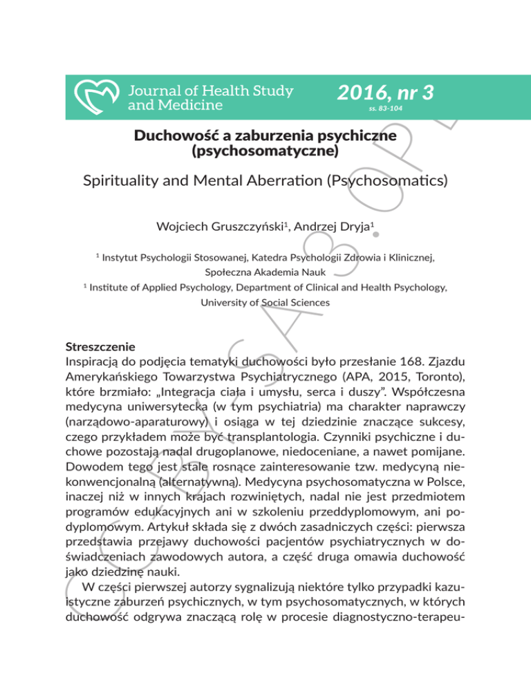 2016, nr 3 L ss. 83-104 0P Duchowość a zaburzenia psychiczne (psychosomatyczne) Spirituality and Mental Aberration (Psychosomatics) 1 3. Wojciech Gruszczyński1, Andrzej Dryja1 Instytut Psychologii Stosowanej, Katedra Psychologii Zdrowia i Klinicznej, Społeczna Akademia Nauk 1 Institute of Applied Psychology, Department of Clinical and Health Psychology, SA University of Social Sciences CC -B Y- Streszczenie Inspiracją do podjęcia tematyki duchowości było przesłanie 168. Zjazdu Amerykańskiego Towarzystwa Psychiatrycznego (APA, 2015, Toronto), które brzmiało: „Integracja ciała i umysłu, serca i duszy”. Współczesna medycyna uniwersytecka (w tym psychiatria) ma charakter naprawczy (narządowo-aparaturowy) i osiąga w tej dziedzinie znaczące sukcesy, czego przykładem może być transplantologia. Czynniki psychiczne i duchowe pozostają nadal drugoplanowe, niedoceniane, a nawet pomijane. Dowodem tego jest stale rosnące zainteresowanie tzw. medycyną niekonwencjonalną (alternatywną). Medycyna psychosomatyczna w Polsce, inaczej niż w innych krajach rozwiniętych, nadal nie jest przedmiotem programów edukacyjnych ani w szkoleniu przeddyplomowym, ani podyplomowym. Artykuł składa się z dwóch zasadniczych części: pierwsza przedstawia przejawy duchowości pacjentów psychiatrycznych w doświadczeniach zawodowych autora, a część druga omawia duchowość jako dziedzinę nauki. W części pierwszej autorzy sygnalizują niektóre tylko przypadki kazuistyczne zaburzeń psychicznych, w tym psychosomatycznych, w których duchowość odgrywa znaczącą rolę w procesie diagnostyczno-terapeu- 84 Wojciech Gruszczyński, Andrzej Dryja 3. 0P L tycznym. Są to zagadnienie związane z: uzależnieniami, zaburzeniami takimi jak schizofrenia, zespoły depresyjno-lękowe, zachowania suicydalne, a także z tzw. zespołem przewlekłego zmęczenia z postaciami somatoformicznymi. W części drugiej przedstawiono różne koncepcje rozumienia duchowości, która współcześnie jest pojęciem wieloznacznym i przez licznych naukowców traktowana bywa jako „najwyższy poziom psychiki” lub jako nie do końca rozumiane zjawisko nadnaturalne, transcendentne. Autorzy mają świadomość, że przedstawione w pracy własne doświadczenia, refleksje i przemyślenia na temat roli duchowości w zaburzeniach psychicznych są oparte na doktrynie epidemiologicznej, która uważa intuicję za najwartościowsze źródło poznawcze. CC -B Y- SA Słowa kluczowe duchowość, zaburzenia psychiczne, psychosomatyka Duchowość a zaburzenia psychiczne (psychosomatyczne) 85 -B Y- SA 3. 0P L Abstract The inspiration for psychiatrist to write about spirituality was the message of 168th Meeting of American Psychiatric Association (APA, 2015, Toronto), which was: “The integration of body and mind, heart and soul”. Modern academic medicine (including psychiatry) has remedial nature and has major successes in this discipline, for which example can be transplantology. Psychological and spiritual factors are still secondary, undervalued and even avoided. The proof of that is constantly rising popularity and interest in alternative medicine. In contrast to other developed countries, in Poland psychosomatic medicine still is not a part of educational programme both in undergraduate and postgraduate education. Lecture consists of two main parts which are: I – presenting symptoms of spirituality of Psychiatric patients in author’s professional experiments, II – speaking about spirituality as a field of study. In part I authors mention only certain casuistic cases of mental aberration including psychosomatic, in which spirituality is greatly important in diagnostic-therapeutic process. Those are examples linked to addictions, disability such as schizophrenia, anxiety and depression syndrome, suicidal behaviour and so-called chronic fatigue syndrome with somatic syndrome. In part II different conceptions of understanding spirituality are presented, which nowadays is polysemic concept, treated by any scientists as ‘the highest level of mentality” or as an not entirely understood phenomenon over innate, supernatural, transcendent. The author knows that presented in this work his own experiences, reflections and thoughts on the role of spirituality in mental aberrations are based on epidemiologic doctrine, which believes that intuition is the most valuable cognitive source. CC Key words spirituality, mental aberration, psychosomatics 86 Wojciech Gruszczyński, Andrzej Dryja CC -B Y- SA 3. 0P L Wprowadzenie Bezpośrednią inspiracją do podjęcia przez autorów (psychiatra i student psychologii) indywidualnych dociekań na temat duchowości był 168. Zjazd Amerykańskiego Towarzystwa Psychiatrycznego (APA), który odbył się w dniach 16–20 maja 2015 r. w Toronto. Przewodni temat spotkania 14 tys. uczestników z całego świata brzmiał: „Integracja ciała i umysłu, serca i duszy”. W trakcie obrad podkreślano istotną rolę psychiatrów w terapii chorób neuro-psychiatrycznych, jednak w taki sposób, żeby nie utracić jej „serca i duszy”. Należy w tym miejscu podkreślić, że coroczne zjazdy APA, odbywające się w stolicach poszczególnych stanów USA, mają charakter ogólnoświatowy i dla środowiska psychiatrycznego stanowią cenny drogowskaz zarówno pod względem naukowym, jak i postępowania diagnostyczno-terapeutycznego. Autor (psychiatra) niejednokrotnie miał przyjemność uczestniczyć we wspomnianych spotkaniach, jednak dopiero zjazd w roku 2015 tak mocno i dobitnie wyeksponował jako swoje motto problematykę „duszy” w terapii psychiatrycznej. Dotychczas psychiatria światowa, w tym również polska, za główny cel badań naukowych stawiała sobie wyjaśnienie biologicznych mechanizmów powstawania i przebiegu zaburzeń psychicznych oraz zaburzeń zachowania. Z tego powodu w ostatnim dziesięcioleciu zarówno w Stanach Zjednoczonych, jak i w Unii Europejskiej przeznaczono wielkie