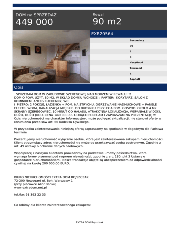 Rewal DOM na SPRZEDAŻ 90 m2 449 000 EXR20564 Secondary 90 2 3 VeryGood Terraced 1 Asphalt Opis SPRZEDAM DOM W ZABUDOWIE SZEREGOWEJ NAD MORZEM W REWALU !!! DOM O POW. UŻYT. 80 M2. W SKŁAD DOMKU WCHODZI : PARTER: KORYTARZ, SALON Z KOMINKIEM, ANEKS KUCHENNY, WC. I PIĘTRO: 2 POKOJE, ŁAZIENKA + POM. NA STRYCHU. OGRZEWANIE NADMUCHOWE + PANELE ELEKTR. WODA, KANALIZACJA MIEJSKIE. DO BUDYNKU PRZYLEGA POM. GOSPOD. OKOŁO 4 M2. SKRAJNY SZEREGOWIEC, 10 MINUT OD HAŁASU, ATRAKCYJNA LOKALIZACJA, WSPANIAŁE WIDOKI, DUŻO, DUŻO JODU. CENA 449 000 ZŁ. GORĄCO POLECAM I ZAPRASZAM NA PREZENTACJĘ !!! Opis nieruchomości ma charakter informacyjny, może podlegać aktualizacji, nie stanowi oferty w rozumieniu przepisów art. 66 Kodeksu Cywilnego. W przypadku zainteresowania niniejszą ofertą zapraszamy na spotkanie w dogodnym dla Państwa terminie Prezentujemy nieruchomość wyłącznie osobie, która jest zainteresowana zakupem nieruchomości. Klient otrzymujący adres nieruchomości nie może go przekazywać osobą postronnym. Zgodnie z art. 49 ustawy o ochronie danych osobowych. Współpracę z naszymi Klientami prowadzimy na podstawie umowy pośrednictwa, która wymaga formy pisemnej pod rygorem nieważności, zgodnie z art. 180, pkt 3 Ustawy o gospodarce nieruchomościami. Nasze transakcje objęte są ubezpieczeniem od odpowiedzialności cywilnej na kwotę 200 000,00 EURO. BIURO NIERUCHOMOŚCI EXTRA DOM ROJSZCZAK 72-200 Nowogard ul. Boh. Warszawy 1 (przy placówce Alior Banku) www.extradom.net.pl tel./fax 91 392 22 33 Co robimy dla klienta zainteresowanego zakupem: EXTRA DOM Rojszczak * Sprawdzamy zdolność kredytową * Wyszukujemy odpowiednią nieruchomość, * Pomagamy w prowadzeniu negocjacji, * Pomagamy w uzyskaniu potrzebnych dokumentów * Pomagamy w uzyskaniu kredytu hipotecznego * Współpracujemy z kancelariami notarialnymi, geodetami Korzystając z naszych usług oszczędzasz swój czas, a także zyskujesz pewność, że Twoja transakcja zostanie przeprowadzona z należytą starannością, w sposób profesjonalny i co najważniejsze - BEZPIECZNY. Nr licencji pośredników: 21317, 21318 Dorota Więzowska tel. 517 770 353 tel. (91) 392 22 33 email: [email protected] EXTRA DOM Rojszczak Powered by TCPDF (www.tcpdf.org)
