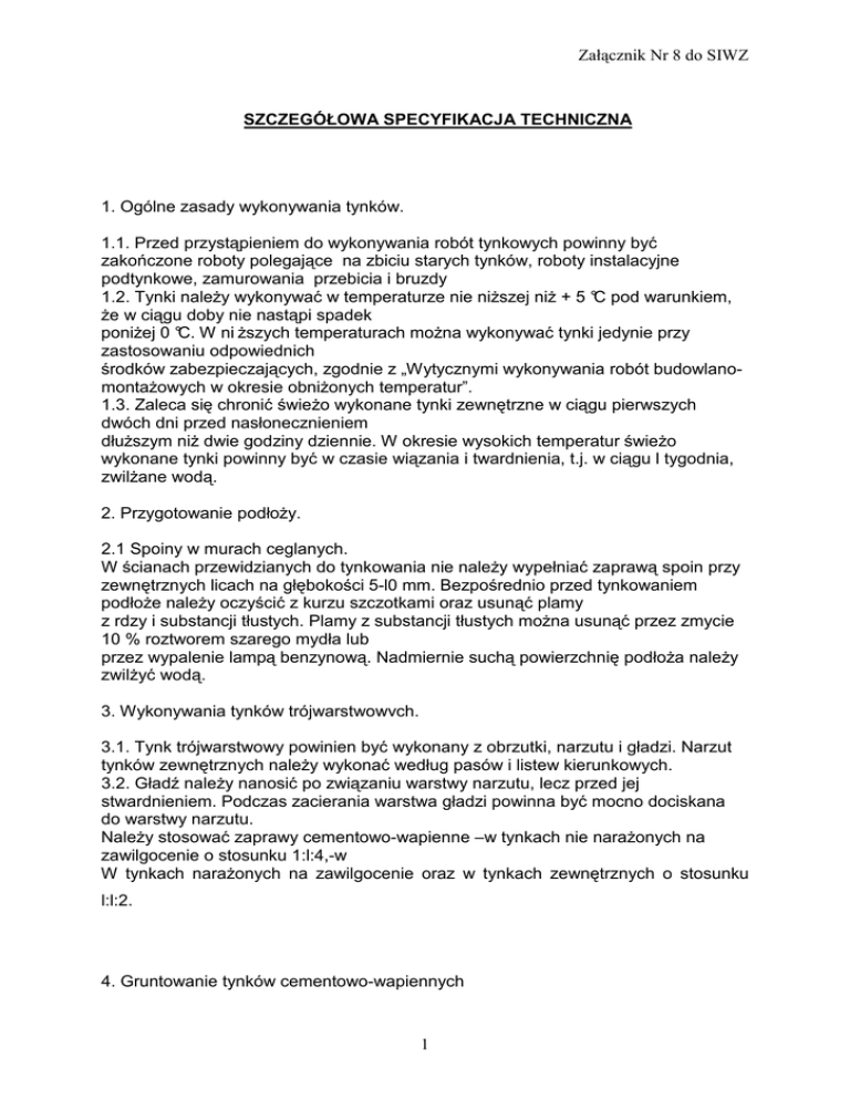 Załącznik Nr 8 do SIWZ SZCZEGÓŁOWA SPECYFIKACJA TECHNICZNA 1. Ogólne zasady wykonywania tynków. 1.1. Przed przystąpieniem do wykonywania robót tynkowych powinny być zakończone roboty polegające na zbiciu starych tynków, roboty instalacyjne podtynkowe, zamurowania przebicia i bruzdy 1.2. Tynki należy wykonywać w temperaturze nie niższej niż + 5 °C pod warunkiem, że w ciągu doby nie nastąpi spadek poniżej 0 °C. W ni ższych temperaturach można wykonywać tynki jedynie przy zastosowaniu odpowiednich środków zabezpieczających, zgodnie z „Wytycznymi wykonywania robót budowlanomontażowych w okresie obniżonych temperatur”. 1.3. Zaleca się chronić świeżo wykonane tynki zewnętrzne w ciągu pierwszych dwóch dni przed nasłonecznieniem dłuższym niż dwie godziny dziennie. W okresie wysokich temperatur świeżo wykonane tynki powinny być w czasie wiązania i twardnienia, t.j. w ciągu l tygodnia, zwilżane wodą. 2. Przygotowanie podłoży. 2.1 Spoiny w murach ceglanych. W ścianach przewidzianych do tynkowania nie należy wypełniać zaprawą spoin przy zewnętrznych licach na głębokości 5-l0 mm. Bezpośrednio przed tynkowaniem podłoże należy oczyścić z kurzu szczotkami oraz usunąć plamy z rdzy i substancji tłustych. Plamy z substancji tłustych można usunąć przez zmycie 10 % roztworem szarego mydła lub przez wypalenie lampą benzynową. Nadmiernie suchą powierzchnię podłoża należy zwilżyć wodą. 3. Wykonywania tynków trójwarstwowvch. 3.1. Tynk trójwarstwowy powinien być wykonany z obrzutki, narzutu i gładzi. Narzut tynków zewnętrznych należy wykonać według pasów i listew kierunkowych. 3.2. Gładź należy nanosić po związaniu warstwy narzutu, lecz przed jej stwardnieniem. Podczas zacierania warstwa gładzi powinna być mocno dociskana do warstwy narzutu. Należy stosować zaprawy cementowo-wapienne –w tynkach nie narażonych na zawilgocenie o stosunku 1:l:4,-w W tynkach narażonych na zawilgocenie oraz w tynkach zewnętrznych o stosunku l:l:2. 4. Gruntowanie tynków cementowo-wapiennych 1 Załącznik Nr 8 do SIWZ 4.1.Podkład gruntujący stosowany jako warstwa podtynkowa lub roztwór gruntujący zapobiegający powstawaniu wykwitów lub przebarwień na warstwie tynku z powodu silnego środowiska alkaicznego na warstwie zbrojącej. Dodatkowo podkład zwiększa przyczepność tynku po uzyskaniu szorstkiej powłoki, a roztwór może posiadać właściwości grzybobójcze i hydrofobowe. 5.Tynki akrylowe 5.1.Tak przygotowane podłoże pokrywa się warstwą wyprawy elewacyjnej, składającej się z podkładu gruntującego i tynku cienkowarstwowego, który stanowi wykończenie kolorystyczne i ochronne ścian zabezpieczające przed wpływem czynników atmosferycznych, erozyjnych i starzenia naturalnego. 5.2. Tynk powinien być odporny na starzenie naturalne, zmienną temperaturę, działanie światła i promieni słonecznych . Zalecane są tynki w postaci masy lub zaprawy(gotowej fabrycznie). Wykonanie masy tynkarskiej na elewacji: Wyprawy tynkarskie można nakładać nie wcześniej niż po 3 dniach od wykonania warstwy zbrojonej tkaniną szklaną. Prace te należy prowadzić w temperaturze nie niższej niż 5ºC. Niedopuszczalne jest wykonanie wypraw elewacyjnych w czasie opadów atmosferycznych, silnego wiatru oraz jeżeli jest zapowiadany spadek temperatury poniżej 0ºC w przeciągu 24h. Przed nałożeniem masy tynkarskiej należy zastosować podkład tynkarski, który zabezpiecza tynki elewacyjne przed wystąpieniem plam i wykwitów. Czas schnięcia zastosowanego na podłożu preparatu gruntującego wynosi min. 24 godz. w warunkach optymalnych 6.Wykonanie nowych obróbek blacharskich: 6.1. Obróbki te powinny wystawać poza lico ściany od 40 – 50 mm w przypadku czapów kominowych i 20-30 mm w przypadku podokienników i powinny być wykonane w taki sposób, aby zabezpieczyć elewację przed zaciekami wody deszczowej. Pod wszystkie obróbki należy wykonać odpowiednie spadki z zaprawy cementowej. Obróbki blacharskie zewnętrzne wykonać z blachy ocynkowanej gr. 0,55 mm. 6.2. Demontaż rynien półokrągłych z blachy ocynkowanej oraz rur spustowych 6.3. Montaż nowych rynien półokrągłych oraz spustowych z blachy ocynkowanej o śr. 15cm UWAGA: Przed wykonaniem tynków cementowo-wapiennych konieczne będzie zdemontowanie instalacji odgromowej itp. 7. Instalacja odgromowa 7.1.Demontaż zwodów pionowych instalacji odgromowej naprężanych z pręta o średnicy 12 mm 7.2. Montaż nowych zwodów pionowych instalacji odgromowej naprężanych z pręta o średnicy 12 mm 7.3.Pomiar skuteczności instalacji odgromowej 8.Wywóz gruzu 9.Warunki odbioru tynków : 9.1. Ukształtowanie powierzchni, krawędzie przecięcia powierzchni oraz kąty dwuścienne powinny być zgodne z ukształtowaniem ścian. 2 Załącznik Nr 8 do SIWZ 9.2. Dopuszczalne odchylenia powierzchni tynku kat. I od płaszczyzny i odchylenie krawędzi od linii prostej –nie większe niż 3 mm i w liczbie nie większej niż 3 na całej długości łaty kontrolnej 2m. 9.3. Odchylenie powierzchni i krawędzi od kierunku: - pionowego – nie większe niż 2 mm na 1m i ogółem nie więcej niż 4 mm w pomieszczeniu, - poziomego – nie większe niż 3 mm na 1 m i ogółem nie więcej niż 6 mm na całej powierzchni między przegrodami pionowymi (ściany, belki itp.). 10. Niedopuszczalne są następujące wady: 10.1. wykwity w postaci nalotu wykrystalizowanych na powierzchni tynków roztworów soli przenikających z podłoża 10.2. trwałe ślady zacieków na powierzchni, odstawanie, odparzenia i pęcherze wskutek niedostatecznej przyczepności tynku do podłoża Aby zapewnić długotrwałość funkcji ochronnej, należy zwrócić uwagę na staranność i solidność wykonania. Zaleca się zastosowanie , posiadających atesty, deklaracje zgodności i certyfikaty zgodności z aprobatami technicznymi wydawanymi przez ITB, oraz sprawdzone w praktyce np. system firmy „Atl