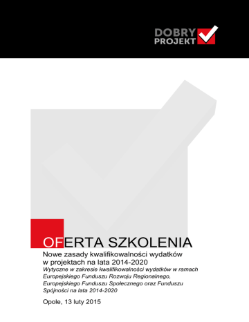 OFERTA SZKOLENIA Nowe zasady kwalifikowalności wydatków w projektach na lata 2014-2020 Wytyczne w zakresie kwalifikowalności wydatków w ramach Europejskiego Funduszu Rozwoju Regionalnego, Europejskiego Funduszu Społecznego oraz Funduszu Spójności na lata 2014-2020 Opole, 13 luty 2015 Szanowni Państwo, Komisja Europejska zatwierdziła 13 lutego 2015 roku wszystkie programy operacyjne dla Polski na lata 2014-2020! W nowej perspektywie 2014-2020 będzie obowiązywał jeden dokument określający zasady kwalifikowania wydatków dla wszystkich programów unijnych (z wyjątkiem Programu Rozwoju Obszarów Wiejskich). Ministerstwo Infrastruktury i Rozwoju zakończyło konsultacje społeczne 12 stycznia 2015 dla oficjalnych Wytycznych w zakresie kwalifikowalności wydatków w ramach Europejskiego, Funduszu Rozwoju Regionalnego, Europejskiego Funduszu Społecznego oraz Funduszu Spójności na lata 2014-2020. Lada dzień zostanie zatwierdzona ostateczna wersja tego dokumentu. Celem szkolenia jest przygotowanie uczestników i uczestniczek do opracowywania budżetów i prawidłowego rozliczania projektów dofinansowanych z funduszy unijnych w ramach nowej perspektywy finansowej 2014-2020. Uczestnicy nabędą wiedzę z zakresu zasad finansowania nowych projektów oraz kwalifikowalności wydatków, różnic wobec poprzedniego okresu. Pierwsze konkursy w ramach perspektywy 2014-2020 będą już otwarte w II kwartale 2015! To już najwyższy czas, aby przygotować się do aplikowania o nowe dotacje! Dzięki udziale w szkoleniu nastąpi: wzrost wiedzy i pogłębienie umiejętności praktycznych w zakresie kwalifikowalności wydatków, jak również zasad tworzenia budżetu ogólnego i budżetu szczegółowego poznanie kategorii wydatków kwalifikowalnych i niekwalifikowalnych aktualizacja oraz usystematyzowanie wiedzy z zakresu obowiązujących wytycznych w sprawie kwalifikowalności wydatków w ramach projektów współfinansowanych ze środków unijnych Na szkolenia zapraszamy głównie: zespoły projektowe, księgowych, specjalistów ds. rozliczeń, pracowników zespołów finansowych, audytorów wewnętrznych, koordynatorów projektów i kierowników projektów instytucji, które korzystają lub zamierzają korzystać z dofinansowania z funduszy europejskich Metody dydaktyczne wykorzystywane w trakcie szkolenia: - Prezentacja multimedialna, dyskusja Dlaczego MY? Biuro Doradcze DOBRY PROJEKT z siedzibą w Opolu jest doświadczonym graczem na rynku usług konsultingowych, w szczególności w pozyskiwaniu środków dotacji unijnych w realizacji projektów inwestycyjnych, szkoleniowo-doradczych, edukacyjnych, oświatowych. Jako firma działamy na rynku sług doradczych od roku 2005. DOBRY PROJEKT posiada wdrożony system zarządzania jakością zgodny z normą ISO 9001-2008 w zakresie pozyskiwania dotacji unijnych i środków inwestycyjnych, rozliczania i obsługi projektów, zarządzania projektami oraz szkoleń. W latach 2007-2013 przygotowaliśmy ponad 250 projektów pozytywnie ocenionych, z różnych programów operacyjnych i dla różnych beneficjentów: od jednostek samorządu terytorialnego po przedsiębiorców i organizacje pozarządowe. Biuro Doradcze DOBRY PROJEKT ul. Ozimska 184 45-310 Opole NIP 991-001-59-31 tel. 77 402 14 80/81 tel./faks 77 402 14 85 e-mail: [email protected] www.dobry-projekt.pl Od 2010 roku Jesteśmy członkiem Polskiej Izby Firm szkoleniowych – nasze szkolenia przygotowujemy i realizujemy zgodnie z najwyższymi Standardami Usługi Szkoleniowej PIFS. Dostarczamy kompleksowe usługi ukierunkowane na rozwiązanie konkretnych sytuacji biznesowych. Program szkolenia: 1. 2. 3. 4. 5. Dokumenty regulujące zasady kwalifikowania wydatków Podstawa prawna Cel, zakres regulacji oraz obowiązywanie wytycznych Procedury w zakresie kwalifikowalności projektów i wydatków o Ramy czasowe kwalifikowalności o Ocena kwalifikowalności projektu o Ocena kwalifikowalności wydatku o Wydatki niekwalifikowane o Zasada faktycznego poniesienia wydatku o Koszty pośrednie Szczegółowe zasady kwalifikowalności wydatków dla Europejskiego Funduszu Rozwoju Regionalnego oraz Funduszu Spójności o Dokumentacja niezbędna do przygotowania projektu EKSPERT PROWADZĄCY SZKOLENIE: Założycielka i właścicielka DOBREGO PROJEKTU. Specjalista w zakresie funduszy strukturalnych Unii Europejskiej. Z sukcesem prowadzi własne biuro doradcze od 2005 roku. Stworzyła sprawny zespół konsultantów z różnych dziedzin. Świadczy profesjonalne usługi doradcze w zakresie pozyskiwania Biuro Doradcze DOBRY PROJEKT ul. Ozimska 184 45-310 Opole NIP 991-001-59-31 tel. 77 402 14 80/81 tel./faks 77 402 14 85 e-mail: [email protected] www.dobry-projekt.pl Zakup nieruchomości Wydatki operacyjne Szczegółowe zasady kwalifikowalności wydatków dla Europejskiego Fundusz Społecznego o Kwalifikowalność uczestników projektu o Podstawowe zasady konstruowania budżetu projektu finansowanego ze środków EFS o Koszty pośrednie w projektach finansowanych z EFS o Projekty innowacyjne i ponadnarodowe o Działania finansowane zgodnie z programem Erasmus + o o 6. Joanna Kasprzak-Dżyberti dotacji unijnych oraz prawidłowej realizacji projektów, zarządzania projektami, rozliczeń finansowych, sprawozdawczości, dla klientów z terenu całego kraju. Brała udział w zarządzaniu ponad 130 projektów w różnych instytucjach finansujących na terenie całego kraju. Firma Pani Joanny wielokrotnie była wyróżniana w rankingach najbardziej skutecznych firm doradczych w Polsce. Wdrożyła w swoim biurze system zarządzania jakością ISO 9001-2008. Laureatka „Srebrnego Lauru Umiejętności i Kompetencji” Opolskiej Izby Gospodarczej w 2011 roku. Od czerwca 2014 roku Regionalny Pełnomocnik Zarządu Polskiej Izby Firm Szkoleniowych na województwa: opolskie i dolnośląskie. Trenerka, coach ACC ICF, członek wielu organizacji społecznych. AGENDA SZKOLENIA 09.00 – 09.30 Rejestracja Uczestników 09.30 – 11.00 SE