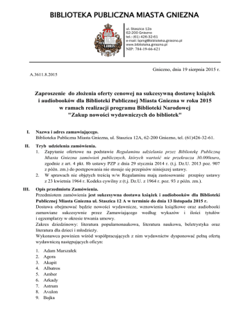 BIBLIOTEKA PUBLICZNA MIASTA GNIEZNA ul. Staszica 12a 62-200 Gniezno tel.: (61) 426-32-61 e-mail: [email protected] www.biblioteka.gniezno.pl NIP: 784-19-66-621 Gniezno, dnia 19 sierpnia 2015 r. A.3611.8.2015 Zaproszenie do złożenia oferty cenowej na sukcesywną dostawę książek i audiobooków dla Biblioteki Publicznej Miasta Gniezna w roku 2015 w ramach realizacji programu Biblioteki Narodowej "Zakup nowości wydawniczych do bibliotek" I. Nazwa i adres zamawiającego. Biblioteka Publiczna Miasta Gniezna, ul. Staszica 12A, 62-200 Gniezno, tel. (61)426-32-61. II. Tryb udzielenia zamówienia. 1. Zapytanie ofertowe na podstawie Regulaminu udzielania przez Bibliotekę Publiczną Miasta Gniezna zamówień publicznych, których wartość nie przekracza 30.000euro, zgodnie z art. 4 pkt. 8b ustawy PZP z dnia 29 stycznia 2014 r. (t.j. Dz.U. 2013 poz. 907 z późn. zm.) do postępowania nie stosuje się przepisów niniejszej ustawy. 2. W sprawach nie objętych treścią w/w Regulaminu mają zastosowanie przepisy ustawy z 23 kwietnia 1964 r. Kodeks cywilny z (t.j. Dz.U. z 1964 r. poz. 93 z późn. zm.). III. Opis przedmiotu Zamówienia. Przedmiotem zamówienia jest sukcesywna dostawa książek i audiobooków dla Biblioteki Publicznej Miasta Gniezna ul. Staszica 12 A w terminie do dnia 13 listopada 2015 r. Dostawa obejmować będzie nowości wydawnicze, wznowienia książkowe oraz audiobooki zamawiane sukcesywnie przez Zamawiającego według wykazów i ilości tytułów i egzemplarzy w okresie trwania umowy. Zakres dziedzinowy: literatura popularnonaukowa, literatura naukowa, beletrystyka oraz literatura dla dzieci i młodzieży. Wykonawca powinien wśród współpracujących z nim wydawnictw dysponować pełną ofertą wydawniczą następujących oficyn: 1. 2. 3. 4. 5. 6. 7. 8. 9. Adam Marszałek Agora Akapit Albatros Amber Arkady Astrum Avalon Bajka 10. 11. 12. 13. 14. 15. 16. 17. 18. 19. 20. 21. 22. 23. 24. 25. 26. 27. 28. 29. 30. 31. 32. 33. 34. 35. 36. 37. 38. 39. 40. 41. 42. 43. 44. 45. 46. 47. 48. 49. 50. 51. 52. 53. 54. 55. 56. 57. Bellona BIS Bliskie BUKA Bukowy Las Carta Blanca Cykada Czarna Owca Czarne Czytelnik Damidos Debit Delta Demart Difin Drzewo Babel Dwie Siostry Egmont Ene Due Rabe Erica Ezop Fabryka Słów Format G&P Gdańskie Wydawnictwo Psychologiczne Greg Helion Hokus Pokus Impuls Iskry Jacek Santorski Jaguar Jedność KDC Książka i Wiedza Książnica Kurpisz LexisNexis Literackie Literatura LSW MAG Magnum MAK Mamania Media Rodzina Muchomor Muza str. 2 58. 59. 60. 61. 62. 63. 64. 65. 66. 67. 68. 69. 70. 71. 72. 73. 74. 75. 76. 77. 78. 79. 80. 81. 82. 83. 84. 85. 86. 87. 88. 89. 90. Nasza Księgarnia Noir sur Blanc Nowy Świat Oficyna Ekonomiczna Oficyna Wydawnicza Branta Oleksiejuk Ossolineum Papierowy Księżyc Papilon Pascal Philip Wilson PIW Placet Prószyński i Ska PWE Rebis Replika Siedmioróg Skrzat Sonia Draga Studio Emka Supernowa Świat Książki Wilga Wydawnictwo Dolnośląskie Wydawnictwo Naukowe PWN Wytwórnia Zakamarki Zakamycze Zielona Sowa Znak Zysk i S-ka Żak Zamawiający nie dopuszcza możliwości składania ofert częściowych. Zamawiający nie dopuszcza możliwości składania ofert wariantowych. IV. V. Termin realizacji zamówienia. Wymagany termin realizacji zamówienia do 13 listopada 2015 r. Opis sposobu przygotowania oferty. 1. Oferta musi zawierać: a) Wypełniony formularz ofertowy wraz z wykazem wydawnictw z którymi współpracuje Wykonawca. b) Oświadczenie wykonawcy. c) Wykaz zrealizowanych zamówień. 2. Brak któregokolwiek ze wskazanych załączników/dokumentów Formularza ofertowego powoduje odrzucenie oferty ze względu na niespełnienie wymogów formalnych. str. 3 VI. VII. Miejsce oraz termin składania i otwarcia ofert. 1. Oferty pisemne wypełnione w języku polskim należy składać na formularzu oferty w siedzibie Zamawiającego: Biblioteka Publiczna Miasta Gniezna, ul. Staszica 12a, 62-200 Gniezno, Sekretariat, I piętro. Ofertę należy złożyć w zamkniętej kopercie do dnia 04 września 2015 r. do godz. 10.00. 2. Oferty złożone po terminie nie będą rozpatrywane. 3. Wykonawca może przed upływem terminu składania ofert zmienić lub wycofać swoją ofertę. 4. W toku badania i oceny ofert zamawiający może żądać od Wykonawców wyjaśnień dotyczących treści złożonych ofert. 5. Ocena ofert nastąpi w dniu 04 września o godz. 11.00 w gabinecie dyrektora w siedzibie Zamawiającego, I piętro. 6. Zapytanie ofertowe zamieszczono na stronie www.biblioteka.gniezno.pl (BIP) oraz na tablicy ogłoszeń w siedzibie Zamawiającego. Dodatkowe Informacje Osobą uprawnioną do kontaktu z Wykonawcami jest Alicja Twardowska tel. (61) 426-32-61 wew. 2. VIII. Kryterium oceny ofert. 1. Przy wyborze najkorzystniejszej oferty Zamawiający będzie się kierował wyłącznie niżej podanym kryterium i jego znaczeniem: Cena oferowana - 100% 2. Kryterium „cena” będzie oceniane punktowo na podstawie wysokości rabatu udzielonego bibliotece od ceny detalicznej lub sugerowanej przez Wydawcę książek oraz audiobooków podanego na formularzu ofertowym przez Wykonawcę. Za najkorzystniejszą komisja uzna ofertę, która zyska największą liczbę punktów. Wysokość rabatu należy podać z dokładnością do jednego miejsca po przecinku. Oferta z najwyższym rabatem uzyska 100 punktów. Liczba punktów, którą mogą uzyskać złożone oferty obliczona zostanie przez podzielenie rabatu badanej oferty przez najwyższą wysokość rabatu wśród ocenianych ofert i pomnożenie tak otrzymanej liczby przez 100. IX. X. Istotne postanowienia Umowy. Zostały określone w załączonym do Zapytania ofertowego projekcie Umowy – (zał. nr 2). Informacje o formalnościach, jakie powinny zostać dopełnione przy wyborze oferty w celu zawarcia umowy w sprawie Zapytania ofertowego. 1. 2. 3. XI. Niezwłocznie po wyborze najkorzystniejszej oferty zamawiający zawiadomi wykonawców, którzy złożyli oferty, podając nazwę (firmę) i adres wykonawcy, 