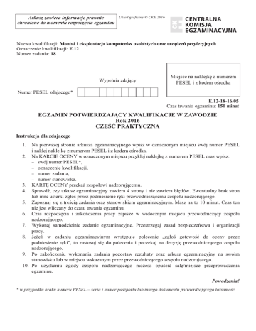 Arkusz zawiera informacje prawnie chronione do momentu rozpoczĊcia egzaminu Ukáad graficzny © CKE 2016 1D]ZDNZDOLILNDFML0RQWDĪLHNVSORDWDFMDNRPSXWHUyZRVRELVW\FKRUD]XU]ąG]HĔSHU\IHU\MQ\FK 2]QDF]HQLHNZDOLILNDFML( 1XPHU]DGDQLD 0LHMVFHQDQDNOHMNĊ]QXPHUHP 3(6(/L]NRGHPRĞURGND :\SHáQLD]GDMąF\ 1XPHU3(6(/]GDMąFHJR ( &]DVWUZDQLDHJ]DPLQXPLQXW (*=$0,1327:,(5'=$-Ą&<.:$/,),.$&-(:=$:2'=,( 5RN &=ĉĝû35$.7<&=1$ ,QVWUXNFMDGOD]GDMąFHJR 1D SLHUZV]HM VWURQLH DUNXV]D HJ]DPLQDF\MQHJRZSLV] Z R]QDF]RQ\P PLHMVFX VZyM QXPHU 3(6(/ LQDNOHMQDNOHMNĊ]QXPHUHP3(6(/L]NRGHPRĞURGND 1D.$5&,(2&(1<ZR]QDF]RQ\PPLHMVFXSU]\NOHMQDNOHMNĊ]QXPHUHP3(6(/RUD]ZSLV] − VZyMQXPHU3(6(/ − R]QDF]HQLHNZDOLILNDFML − QXPHU]DGDQLD − QXPHUVWDQRZLVND .$57ĉ2&(1<SU]HNDĪ]HVSRáRZLQDG]RUXMąFHPX 6SUDZGĨF]\DUNXV]HJ]DPLQDF\MQ\]DZLHUDVWURQ\LQLH]DZLHUDEáĊGyZ(ZHQWXDOQ\EUDNVWURQ OXELQQHXVWHUNL]JáRĞSU]H]SRGQLHVLHQLHUĊNLSU]HZRGQLF]ąFHPX]HVSRáXQDG]RUXMąFHJR =DSR]QDMVLĊ]WUHĞFLą]DGDQLDRUD]VWDQRZLVNLHPHJ]DPLQDF\MQ\P0DV]QDWRPLQXW&]DVWHQ QLHMHVWZOLF]DQ\GRF]DVXWUZDQLDHJ]DPLQX &]DV UR]SRF]ĊFLD L ]DNRĔF]HQLD SUDF\ ]DSLV]H Z ZLGRF]Q\P PLHMVFX SU]HZRGQLF]ąF\ ]HVSRáX QDG]RUXMąFHJR :\NRQDM VDPRG]LHOQLH ]DGDQLH HJ]DPLQDF\MQH 3U]HVWU]HJDM ]DVDG EH]SLHF]HĔVWZD L RUJDQL]DFML SUDF\ -HĪHOL Z ]DGDQLX HJ]DPLQDF\MQ\P Z\VWĊSXMH SROHFHQLH Ä]JáRĞ JRWRZRĞü GR RFHQ\ SU]H] SRGQLHVLHQLH UĊNL´ WR ]DVWRVXM VLĊ GR SROHFHQLD L SRF]HNDM QD GHF\]MĊ SU]HZRGQLF]ąFHJR ]HVSRáX QDG]RUXMąFHJR 3R ]DNRĔF]HQLX Z\NRQDQLD ]DGDQLD SR]RVWDZ UH]XOWDW\ RUD] DUNXV] HJ]DPLQDF\MQ\ QD VZRLP VWDQRZLVNXOXEZPLHMVFXZVND]DQ\PSU]H]SU]HZRGQLF]ąFHJR]HVSRáXQDG]RUXMąFHJR 3R X]\VNDQLX ]JRG\ ]HVSRáX QDG]RUXMąFHJR PRĪHV] RSXĞFLü VDOĊPLHMVFH SU]HSURZDG]DQLD HJ]DPLQX Powodzenia! * w przypadku braku numeru PESEL – seria i numer paszportu lub innego dokumentu potwierdzającego toĪsamoĞü =DGDQLHHJ]DPLQDF\MQH 3U]HSURZDGĨ PRGHUQL]DFMĊ NRPSXWHUD ZHGáXJ SU]HGVWDZLRQ\FK ZVND]DĔ RUD] Z\NRQDM NRQILJXUDFMĊ V\VWHPyZ LXVWDZLHĔSHUVRQDOQ\FK :W\PFHOX 3U]HSURZDGĨWHVW]DLQVWDORZDQHJRG\VNXWZDUGHJR UWAGA: Do modernizacji i konfiguracji komputera w systemie Windows wykorzystaj konto Administrator (bez hasáa). − ]DLQVWDOXMSURJUDP*6PDUW&RQWURO]QDMGXMąF\VLĊQDQRĞQLNXRSLVDQ\PPROGRA MY DQDVWĊSQLH VSUDZGĨSDUDPHWU\G\VNXXMĊWHZWDEHOL3DUDPHWU\LRFHQDG\VNX − Z\NRQDM ]U]XW\ SRWZLHUG]DMąFH VWDQ ZV]\VWNLFK EDGDQ\FK SDUDPHWUyZ D QDVWĊSQLH ]DSLV] MH QD QRĞQLNX86%RSLVDQ\PEGZA MINZSRVWDFLSOLNyZJUDILF]Q\FKSRGQD]ZDPLTest_1, Test_2, « Z]DOHĪQRĞFLRGLORĞFLZ\NRQDQ\FK]U]XWyZ, − Z HG\WRU]H WHNVWX XWZyU] SOLN R QD]ZLH dysk_1 D Z QLP WDEHOĊ ]JRGQLH ]H Z]RUHP WDEHOD 3DUDPHWU\LRFHQDG\VNX3OLN]DSLV]QDQRĞQLNX86%RSLVDQ\PEGZA MIN − Z\QLNL WHVWX SU]HSURZDG]RQHJR Z Z\EUDQ\P SURJUDPLH ]DQRWXM Z WDEHOL SOLNX dysk_1 ZSLVXMąF ZDUWRĞFLELHĪąFH − ZWDEHOLSOLNX dysk_1 ZZLHUV]X67$1'<6.8]DSLV]ZQLRVNLQDWHPDWVWDQXEDGDQHJRG\VNX ]DZLHUDMąFH MHJR RFHQĊ FR GR GDOV]HM HNVSORDWDFML ]HVWDZX NRPSXWHURZHJR : X]DVDGQLHQLX XZ]JOĊGQLMZ\QLNLSU]HSURZDG]RQHMGLDJQRVW\NL 6NRQILJXUXMV\VWHP:LQGRZV − XVWDZ DE\ SOLNL ] UR]V]HU]HQLHP .bmp E\á\ DXWRPDW\F]QLH RWZLHUDQH Z SURJUDPLH 3U]HJOąGDUND IRWRJUDILL V\VWHPX :LQGRZV :\NRQDM ]U]XW GRNXPHQWXMąF\ SU]HSURZDG]RQą F]\QQRĞü =U]XW ]DSLV]MDNRSOLNJUDILF]Q\SRGQD]Zągrafika QDQRĞQLNX86%RSLVDQ\PEGZA MIN, − XWZyU] SXQNW SU]\ZUDFDQLD V\VWHPX :\NRQDM ]U]XW GRNXPHQWXMąF\ SU]HSURZDG]RQą F]\QQRĞü =U]XW ]DSLV] MDNR SOLN JUDILF]Q\ SRG QD]Zą punkt_przywracania QD QRĞQLNX 86% RSLVDQ\P EGZAMIN, − VNRQILJXUXM V\VWHP DE\ SRGF]DV SLVDQLD QLH E\á ZLGRF]Q\ ZVNDĨQLN P\V]\ :\NRQDM ]U]XW GRNXPHQWXMąF\SU]HSURZDG]RQąNRQILJXUDFMĊ=U]XW]DSLV]MDNRSOLNJUDILF]Q\SRGQD]Ząmyszka QDQRĞQLNX86%RSLVDQ\PEGZA MIN, − Z\NRU]\VWXMąFZLHUV]SROHFHĔXWZyU]NRQWR]RJUDQLF]HQLDPLRQD]ZLHVWXGHQW DQDVWĊSQLHXVWDZ F]DV ORJRZDQLD QD NRQWR VWXGHQW RG SRQLHG]LDáNX GR SLąWNX Z JRG]LQDFK :\NRQDM ]U]XW]ZLGRF]Q\PZ\NRU]\VWDQ\PSROHFHQLHP=U]XW]DSLV]MDNRSOLNJUDILF]Q\SRGQD]Ząkonto QDQRĞQLNX86%RSLVDQ\PEGZA MIN − QDGDM XĪ\WNRZQLNRZL VWXGHQW SUDZR GR SU]\ZUDFDQLD SOLNyZ OXE NDWDORJyZ :\NRQDM ]U]XW GRNXPHQWXMąF\SU]HSURZDG]RQąNRQILJXUDFMĊ=U]XW]DSLV]MDNRSOLNJUDILF]Q\SRGQD]Ząprawo QD QRĞQLNX86%RSLVDQ\PEGZA MIN :\NRQDMGHPRQWDĪLPRQWDĪSRG]HVSRáyZ − ]GHPRQWXM NDUWĊ JUDILF]Qą ]DLQVWDORZDQą QD Sá\FLH JáyZQHM NRPSXWHUD D Z SU]\SDGNX ]LQWHJURZDQHMNDUW\JUDILF]QHMZ\áąF]MąZ%,26OXE0HQHGĪHU]HXU]ąG]HĔ − ]GHPRQWXMG\VNWZDUG\]DLQVWDORZDQ\ZNRPSXWHU]H − ]DPRQWXM ]DSDVRZą NDUWĊ JUDILF]Qą RUD] ]DSDVRZ\ G\VN WZDUG\ ]QDMGXMąF\ VLĊ QD Z\SRVDĪHQLX VWDQRZLVNDHJ]DPLQDF\MQHJR UWAGA: po zamontowaniu zapasowego dysku twardego oraz karty graficznej zgáoĞ przewodniczącemu ZN – przez podniesienie rĊki – gotowoĞü do zakoĔczenia prac montaĪowych. Po uzyskaniu zgody przystąp do dalszych czynnoĞci montaĪowych i uruchomienia systemu Linux. Strona 2 z 4 6NRQILJXUXM V\VWHP /LQX[ 'R NRQILJXUDFML V\VWHPX XĪ\M NRQWD HJ]DPLQ ] KDVáHP HJ]DPLQ NRQWR SRVLDGDXSUDZQLHQLDXĪ\WNRZQLNDURRW:W\PFHOX − ]QRĞQLNDRSLVDQHJRDA NE]DLQVWDOXMZV\VWHPLHF]FLRQNĊ+DOORZHHQ6SLGHU − ] QRĞQLND RSLVDQHJR DA NE VNRSLXM GR NDWDORJX GRPRZHJR XĪ\WNRZQLND HJ]DPLQ SOLN R QD]ZLH konto.sh. =D SRPRFą QDU]ĊG]L V\VWHPRZ\FK XWZyU] DUFKLZXP ]DZLHUDMąFH SOLN konto.sh R QD]ZLH skrypt.tar.gzDQDVWĊSQLH]DSLV]MHQDQRĞQLNX86%RSLVDQ\PEGZAMIN − Z\NRU]\VWXMąF SROHFHQLH V\VWHPRZH VSUDZGĨ LQWHJUDOQRĞü V\VWHPX SOLNyZ :\NRQDM ]U]XW RNQD WHUPLQDOD ] ZLGRF]Q\P SRGVXPRZDQLHP VSUDZG]HQLD G\VNX =U]XW ]DSLV] Z SRVWDFL SOLNX JUDILF]QHJRSRGQD]Ząintegralnosc QDQRĞQLNX86%RSLVDQ\PEGZA MIN, − VSUDZGĨ]DSRPRFąGRVWĊSQ\FKQDU]ĊG]LV\VWHPRZ\FKQD]ZĊG\VNXMHJRSRMHPQRĞüRUD]V\VWHP SOLNyZ :\NRQDM ]U]XW GRNXPHQWXMąF\ SU]HSURZDG]RQą REVHUZDFMĊ =U]XW ]DSLV] MDNR SOLN JUDILF]Q\SRGQD]Ządysk QDQRĞQLNX86%RSLVDQ\PEGZA MIN .RU]\VWDMąF ] ]DLQVWDORZDQHJR Z V\VWHPLH /LQX[ RSURJUDPRZDQLD XWZyU] Z HG\WRU]H WHNVWX SOLN ]DZLHUDMąF\ ZVND]DQLD GOD NOLHQWD XĪ\WNRZQLND V\VWHPX NRPSXWHURZHJR GRW\F]ąFH EH]SLHF]QHJR NRU]\VWDQLD]NRPSXWHUDSRGáąF]RQHJRGR,QWHUQHWX'RIRUP