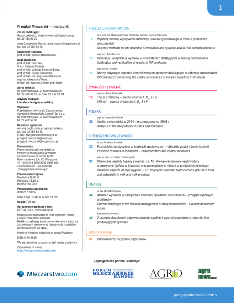 1 Przegląd Mleczarski – miesięcznik Zespół redakcyjny: Beata Lorkiewicz, [email protected], tel. 22 452 52 20 ANALIZA LABORATORYJNA dr n. wet. inż. Magdalena Polak-Śliwińska, mgr inż. Mariusz Śliwiński 2 Anna Garczewska-Murzyn, [email protected] tel./faks 22 452 52 28 Konsultant Naukowy: prof. dr hab. Andrzej Babuchowski Rada Naukowa: prof. dr hab. Jan Pikul, dr inż. Tadeusz Płodzień, prof. dr hab. Jadwiga Seremak-Bulge, prof. dr hab. Eulalia Skawińska, prof. dr hab. inż. Bogusław Staniewski, mgr inż. Aleksandra Wanic, dr hab. inż. Zygmunt Zander, prof. UWM Adres redakcji: 01-230 Warszawa, ul. Skierniewicka 21 tel. 22 452 52 20, tel./faks 22 452 52 28 Artykuły naukowe: Literatura dostępna w redakcji. Wydawca: Przedsiębiorstwo Handlu Zagranicznego Spółdzielni Mleczarskich „Lacpol” Sp. z o.o. 01-230 Warszawa, ul. Skierniewicka 21 tel: 22 452 52 00 Reklama i ogłoszenia: reklamę i ogłoszenia przyjmuje redakcja, tel./faks 22 452 52 28 e-mail: [email protected] [email protected] [email protected] Prenumerata: Prenumeratę przyjmuje redakcja. Prosimy o dokonywanie przedpłat za prenumeratę na numer konta: Bank Handlowy S.A. I/O Warszawa 44 10301016 0000 0000 0306 2001 z zaznaczeniem – prenumerata „Przeglądu Mleczarskiego”. Prenumerata krajowa: Kwartalna 39,00 zł Półroczna 78,00 zł Roczna 156,00 zł Prenumerata zagraniczna: droższa o 100% Cena 1 egz. 13,00 zł, w tym 5% VAT mgr inż. Stanisław Kos 10 ISSN 0478-6599 Wersją pierwotną czasopisma jest wersja papierowa. Normy dotyczące procedur kontroli wskazań aparatów działających w zakresie podczerwieni ISO Standards concerning the control procedures of infrared analytical instruments ŻYWNOŚĆ I ŻYWIENIE mgr inż. Adam Ambroziak 18 Tłuszcz mlekowy – źródło witamin A, D3, E i K Milk fat – source of vitamin A, D3, E i K POLSKA mgr inż. Krzysztof Sałacki 23 Analiza rynku mleka w 2014 r. oraz prognozy na 2015 r. Analysis of the dairy market in 2014 and forecasts BEZPIECZEŃSTWO ŻYWNOŚCI dr inż. Waldemar Dzwolak 32 Pozostałości pestycydów w środkach spożywczych – charakterystyka i środki kontroli Pesticide residues in foodstuffs – characteristics and control measures prof. dr hab. inż. Stefan S. Smoczyński 38 Chemiczne aspekty higieny żywności cz. 10. Wielopierścieniowe węglowodory aromatyczne (WWA) w żywności oraz potencjalnie w mleku i w produktach mlecznych Chemical aspects of food hygiene – 10. Polycyclic aromatic hydrocarbons (PAHs) in food and potentially in milk and milk products FINANSE dr inż. Michał Soliwoda 44 Opracowanie graficzne i druk: EDIT sp. z o.o., www.edit.net.pl Przedruk i eksport wyłącznie za zgodą Wydawcy. Kalibracja i weryfikacja wyników w analizatorach działających w bliskiej podczerwieni Calibration and verification of results in NIR analyzers mgr Stefan Dowgird 14 Nakład 700 egz. Redakcja nie odpowiada za treść ogłoszeń, reklam i innych materiałów płatnych. Redakcja zastrzega sobie prawo skracania i adiustacji zamówionych tekstów oraz nieodsyłania materiałów niezamówionych do druku. Wybrane metody wykrywania melaminy i kwasu cyjanurowego w mleku i produktach mleczarskich Selected methods for the detection of melamine and cyanuric acid in milk and milk products Aktualne wyzwania w zarządzaniu finansami spółdzielni mleczarskich – przegląd wybranych problemów Current challenges in the financial management of dairy cooperatives – a review of selected issues Krzysztof Zaworowski 49 Znaczenie ubezpieczeń odpowiedzialności cywilnej i wycofania produktu z rynku dla firm produkujących żywność EKSPERT RADZI 51 Odpowiadamy na pytania Czytelników Zapraszamy na stronę http://www.pm.mleczarstwo.com Zaprzyjaźnione portale i redakcje: przegląd mleczarski 2/2015